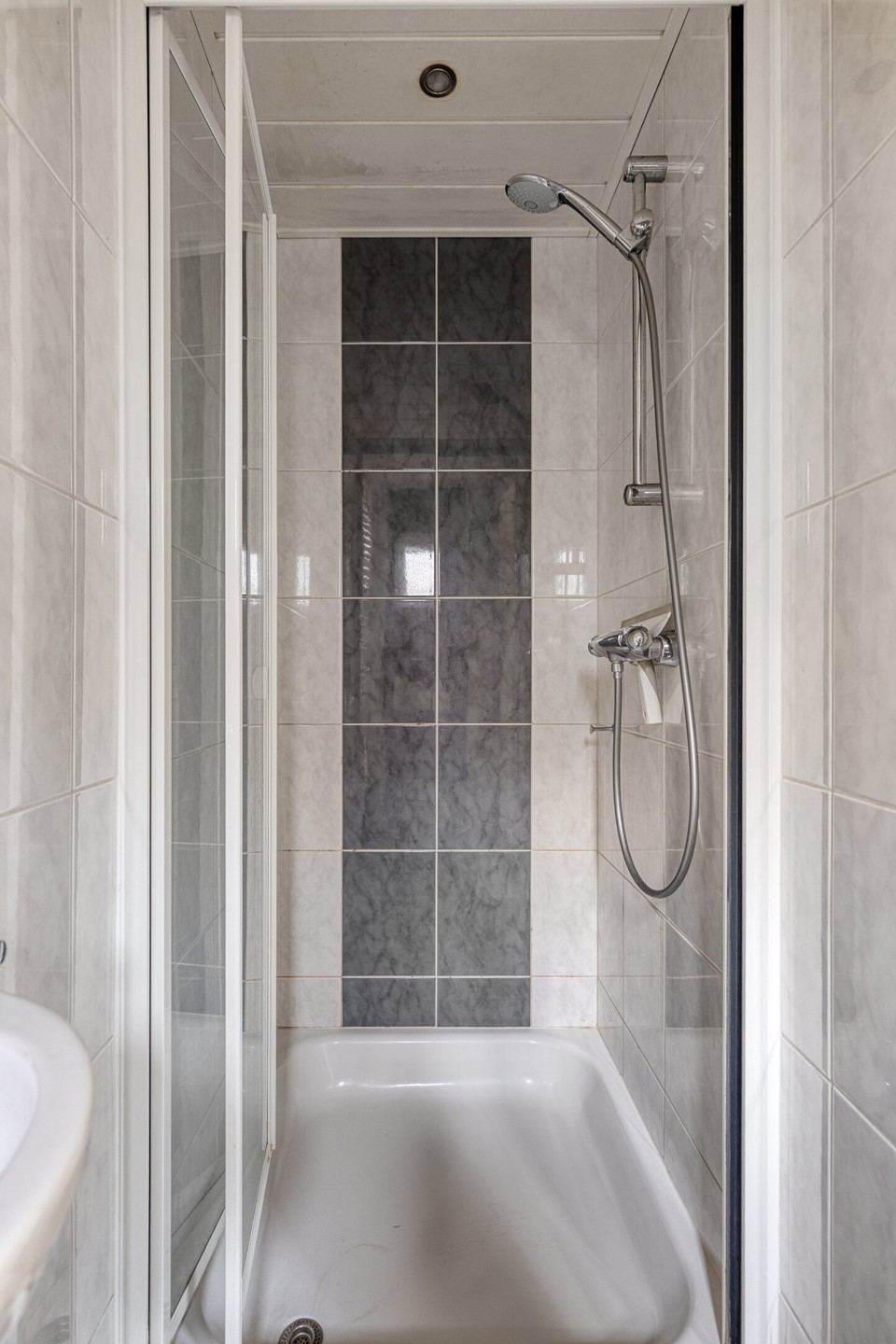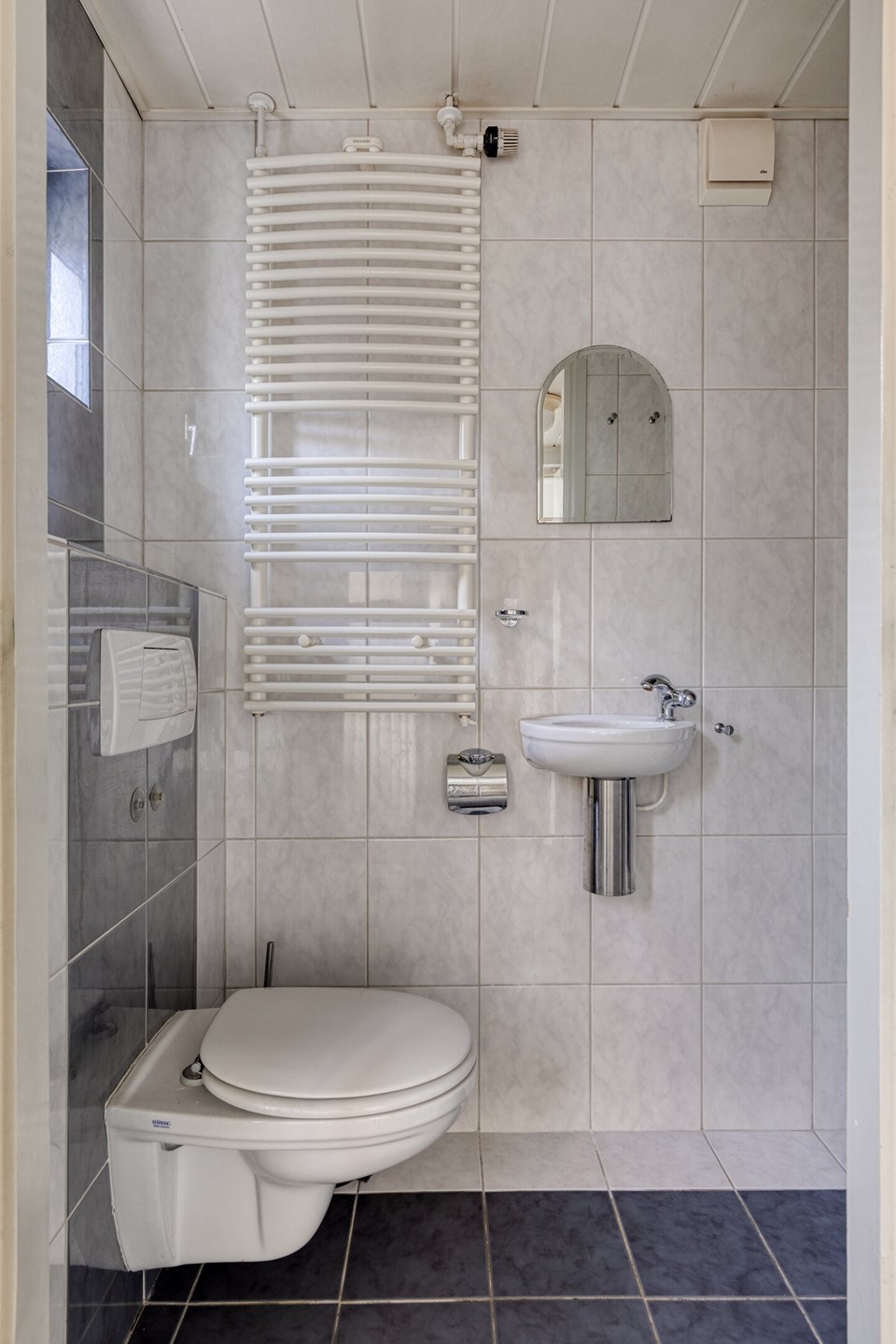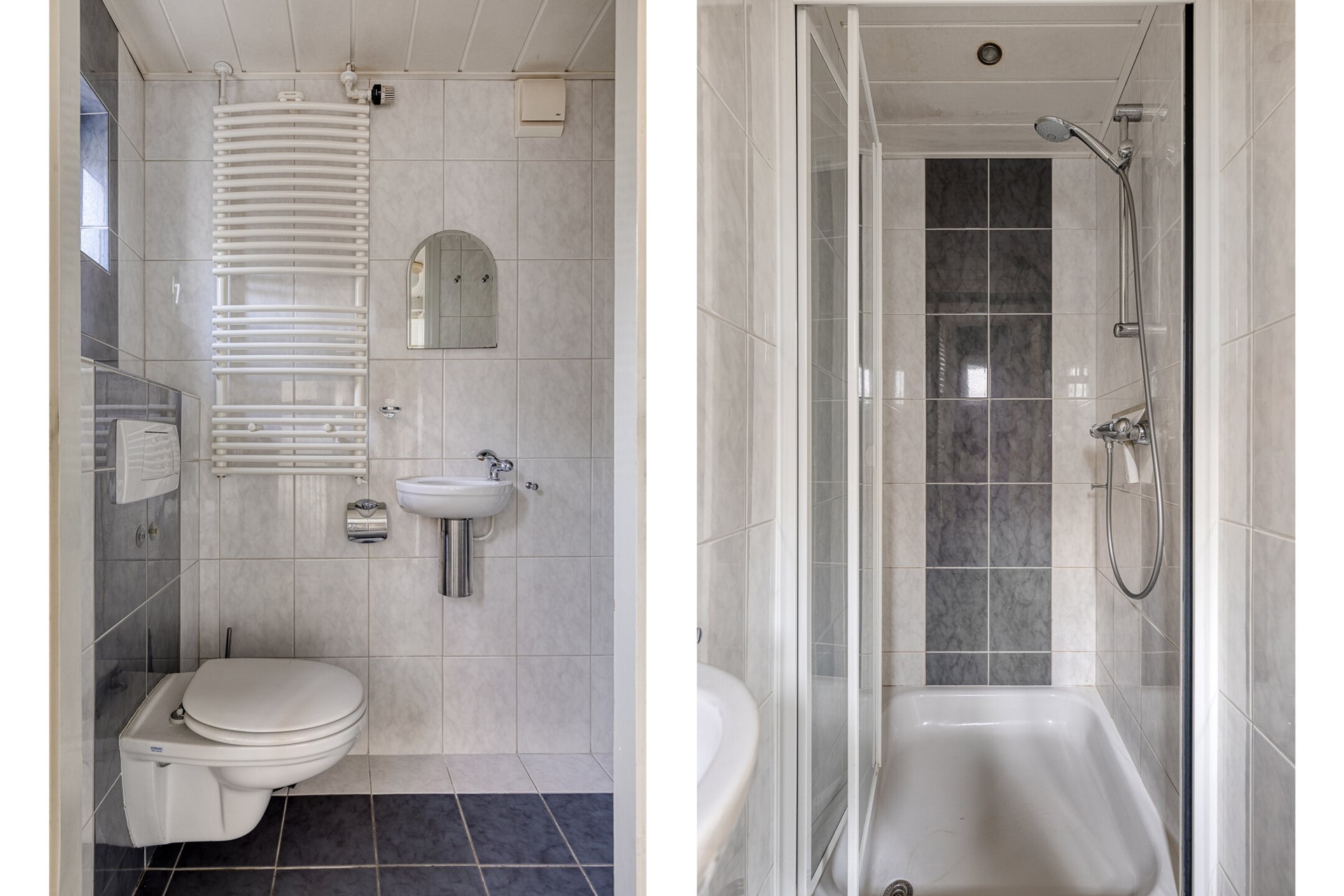 De badkamer is compact maar efficiënt ingedeeld. De badkamer is volledig is betegeld en daardoor gemakkelijk in onderhoud is. Er is een fijne douche, een wastafeltje met spiegel, een toilet en een moderne designradiator die zorgt voor extra comfort.