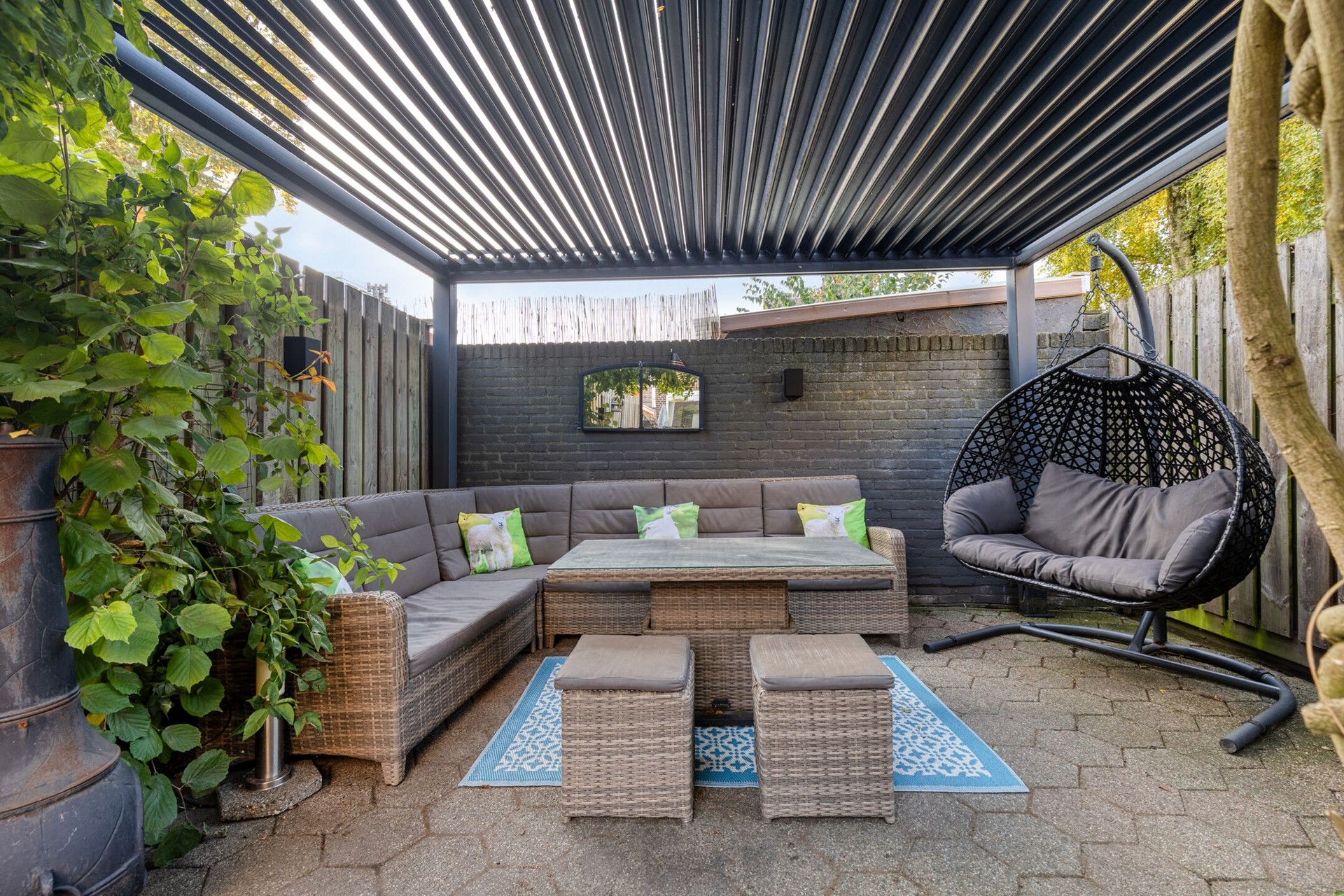 De zonnige tuin op het zuiden is een heerlijke plek om te genieten van het buitenleven. Achterin de tuin bevindt zich de aangebouwde stenen berging, ideaal voor het opbergen van fietsen en tuingereedschap. Daarnaast is er in de tuin zelf een deur aanwezig die toegang biedt tot de achterom — wel zo praktisch. Een echte blikvanger is de moderne antracietgrijze aluminium overkapping waarvan het dak eenvoudig open en dicht kan. Zo kun je zowel op zonnige dagen als bij een zomers buitje comfortabel buiten zitten. Door de gunstige ligging geniet je hier vrijwel de hele dag van de zon en is er altijd wel een fijn plekje om te ontspannen.