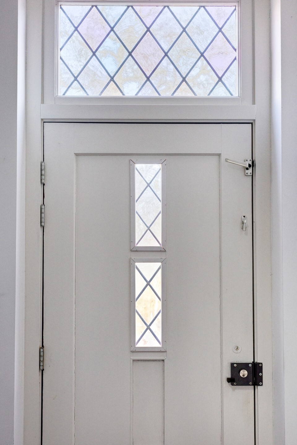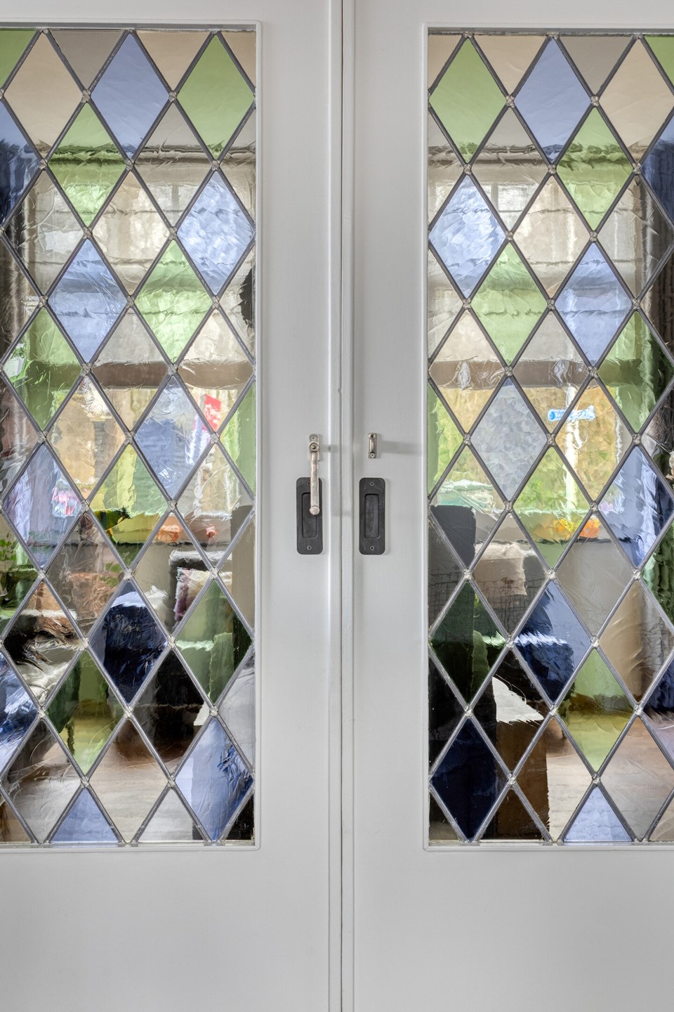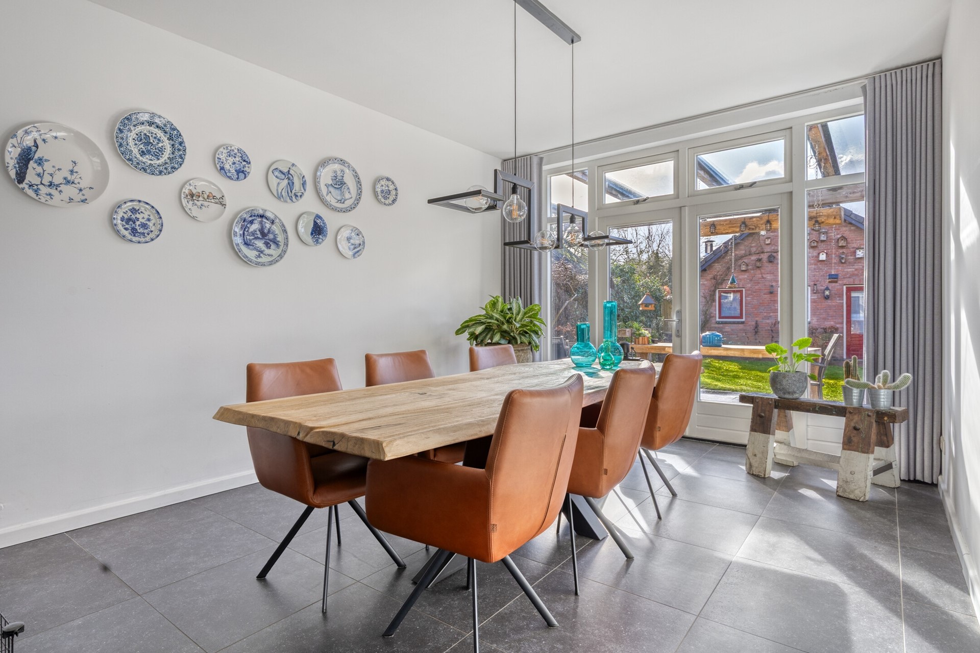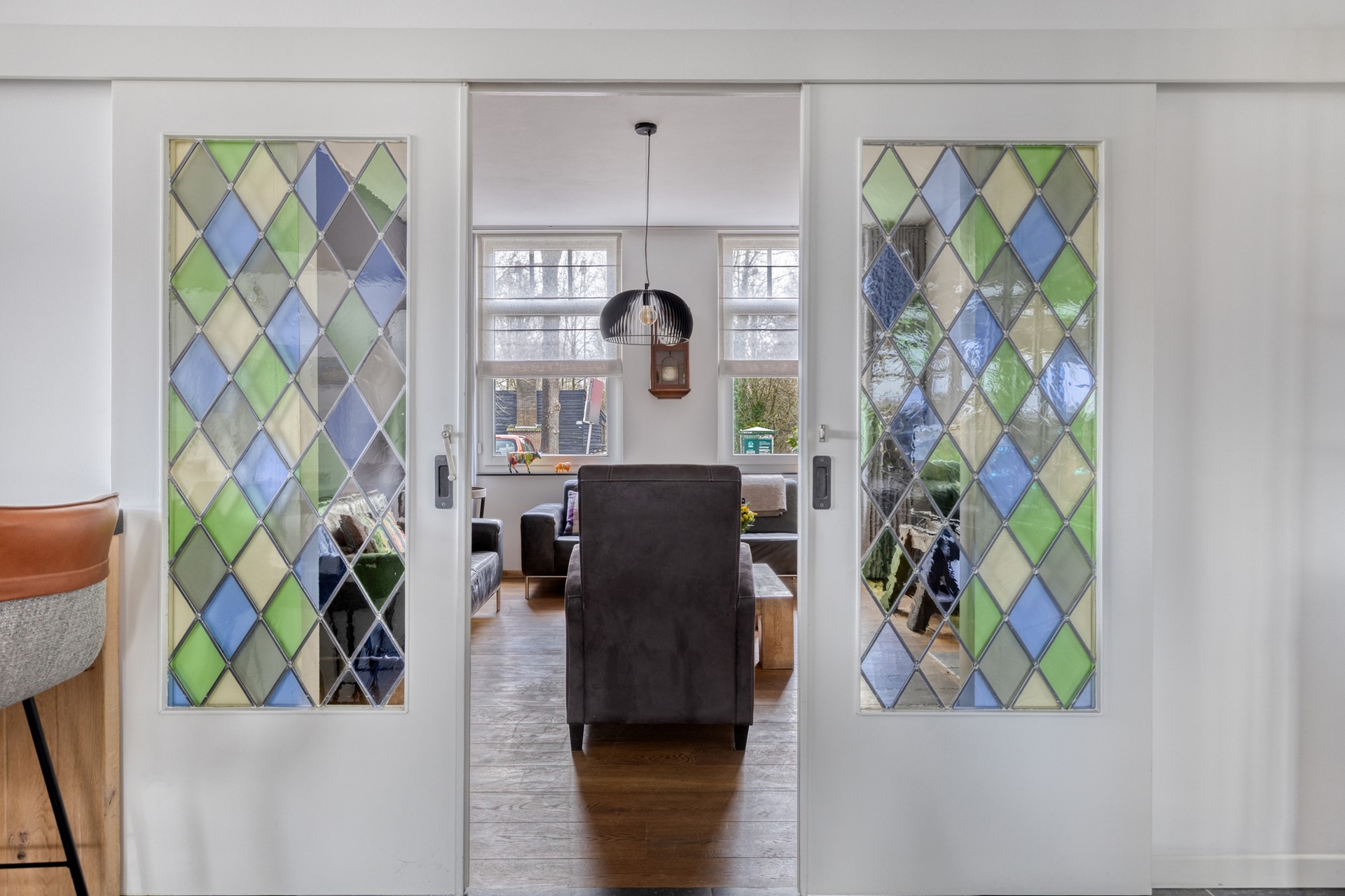 In het achterste gedeelte bevinden zich de keuken en de ruimte waar momenteel de eettafel staat. Dit deel biedt volop ruimte voor gezellig tafelen. Via de dubbele tuindeuren is er direct toegang tot de tuin. Ook in de deur naar de bijkeuken is prachtig glas-in-lood verwerkt wat het authentieke karakter van de woning doorzet.