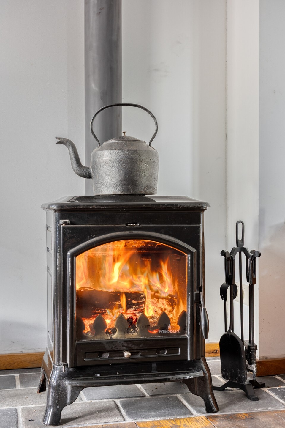 Het zitgedeelte beschikt over een eikenhouten vloer en een nieuwe houtkachel die zorgt voor een fijne warme sfeer. De originele en-suite deuren met glas in lood scheiden de voorkamer van het eetgedeelte en benadrukken het karakter van de woning.