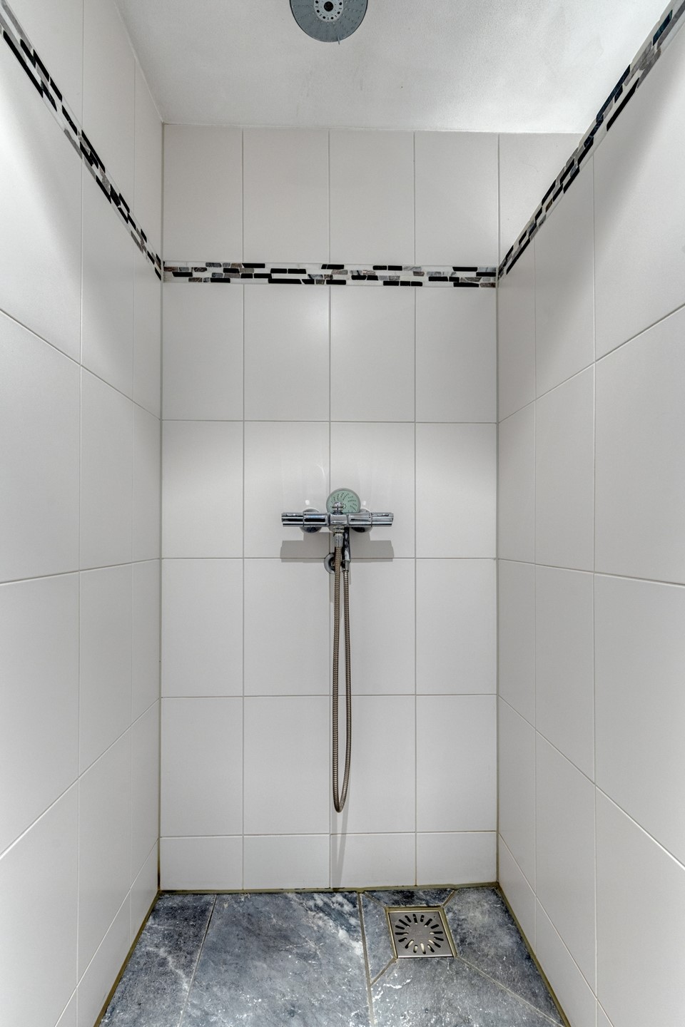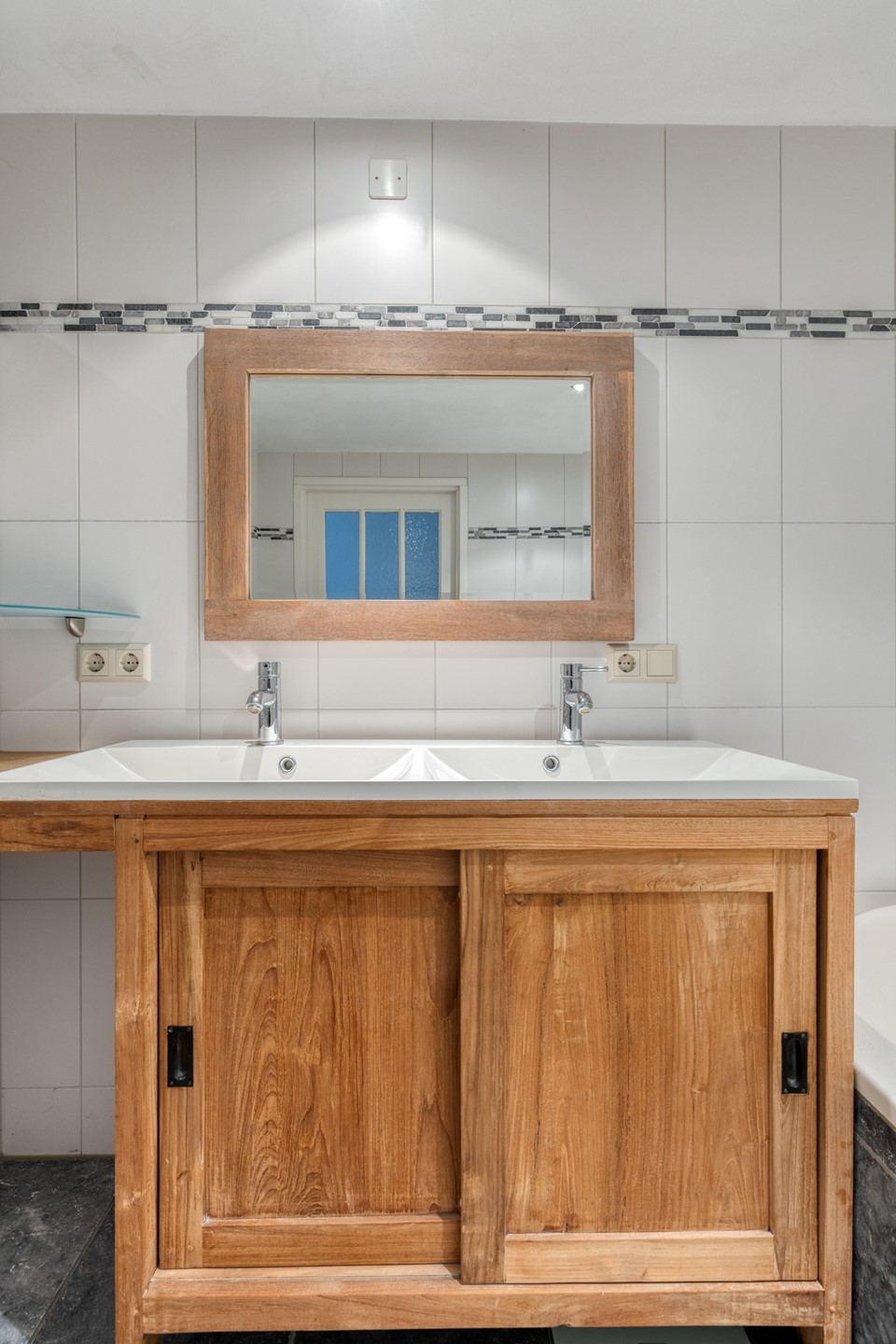 De verzorgde badkamer is ruim, stijlvol en uitstekend onderhouden. De ruimte is comfortabel ingericht met een tegelvloer voorzien van vloerverwarming, volledig betegelde wanden, een ligbad, inloopdouche, dubbele wastafel met meubel en een designradiator.