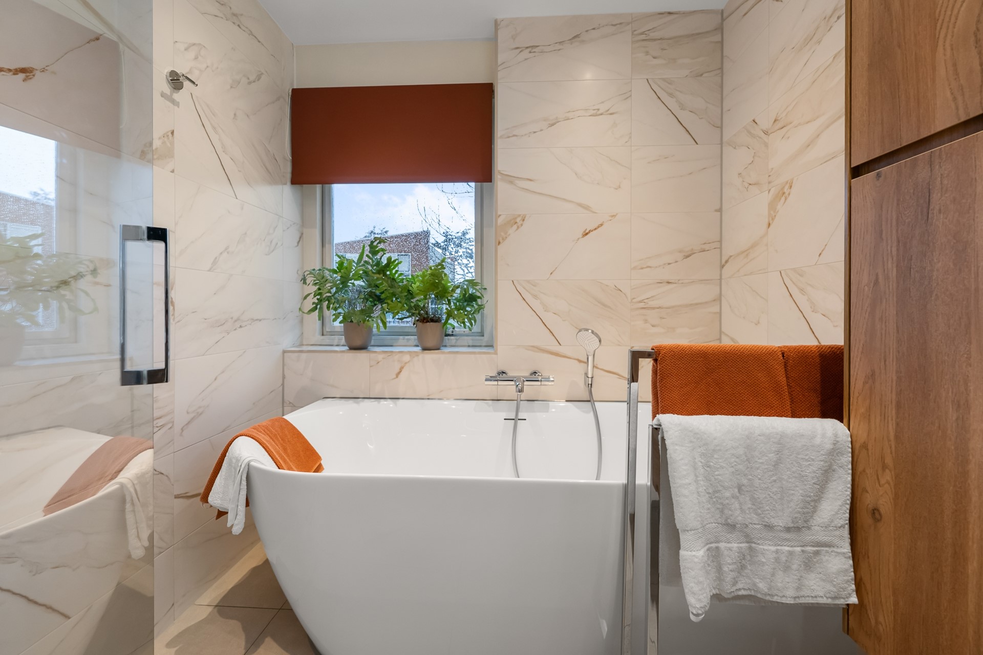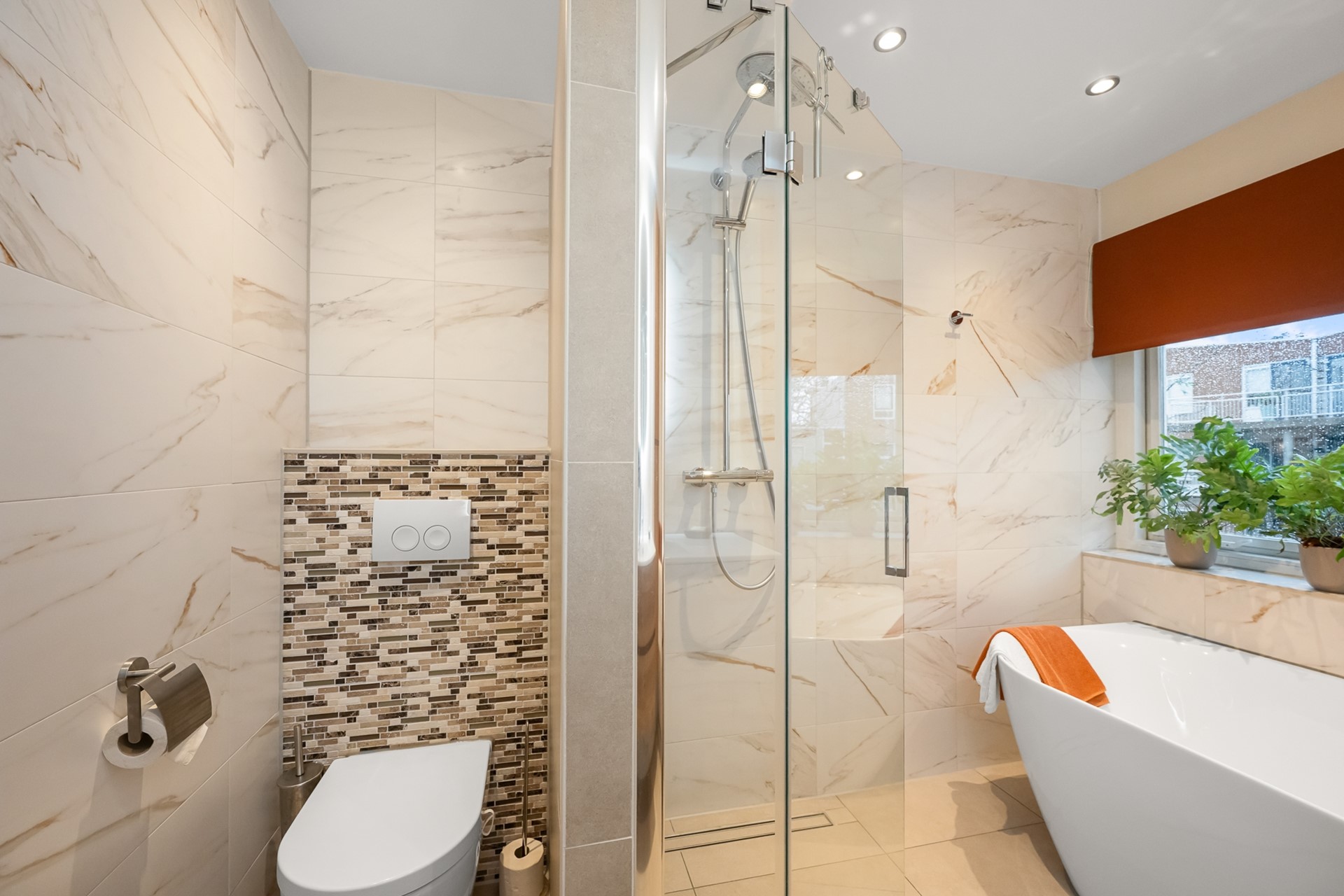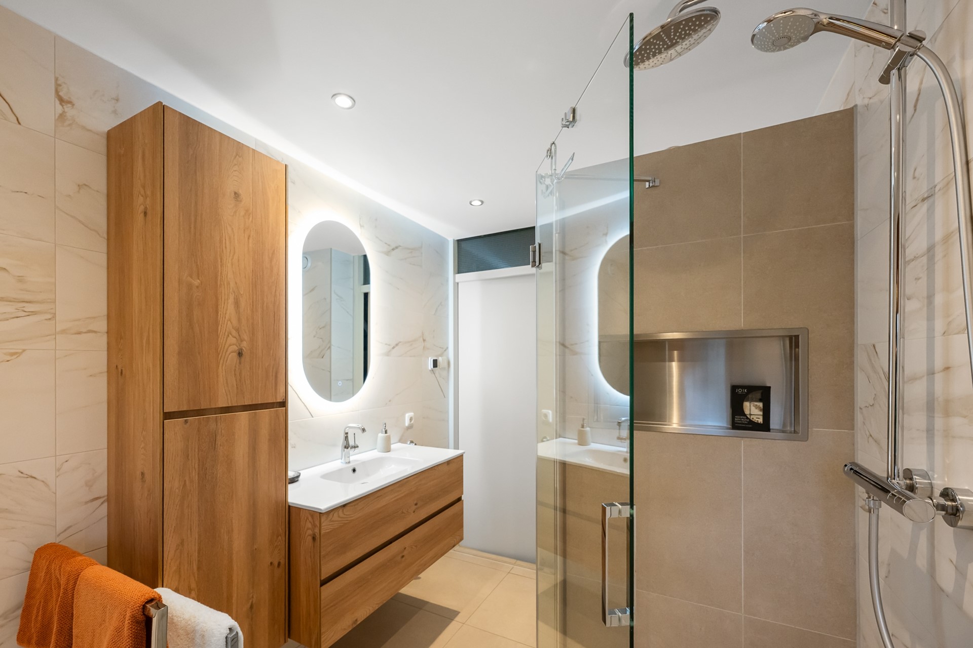De badkamer uit 2023 is modern en luxe afgewerkt, met oog voor comfort en stijl. De badkamer beschikt over een ligbad, een aparte douche, een toilet, een modern wastafelmeubel en vloerverwarming, waardoor het altijd aangenaam warm is, zelfs op koude dagen.