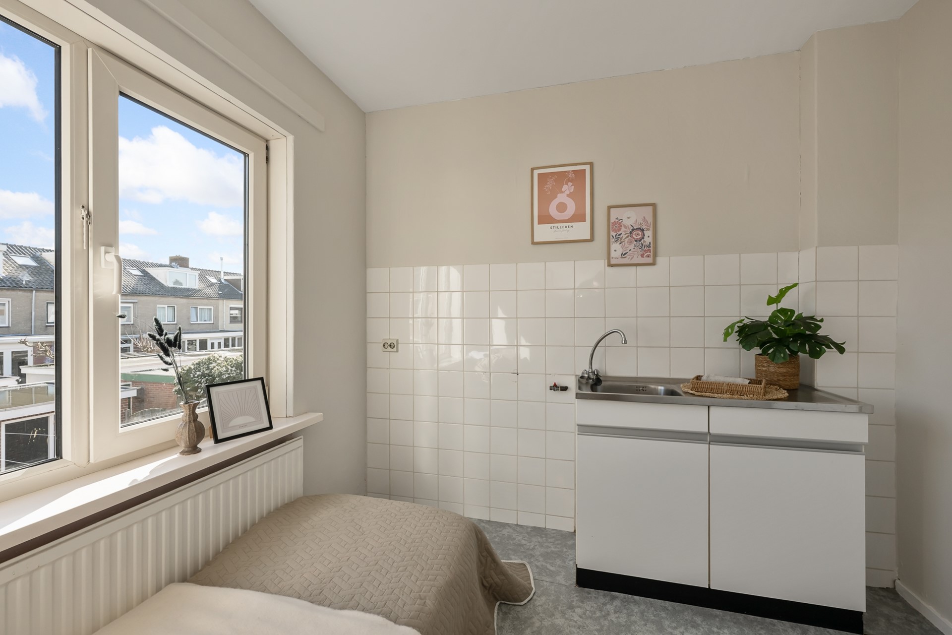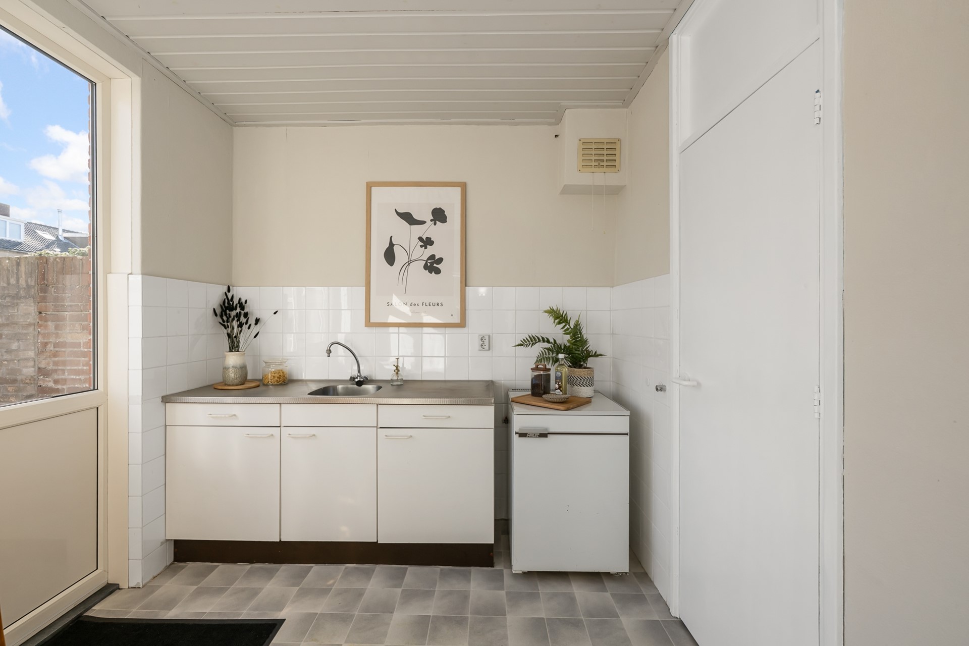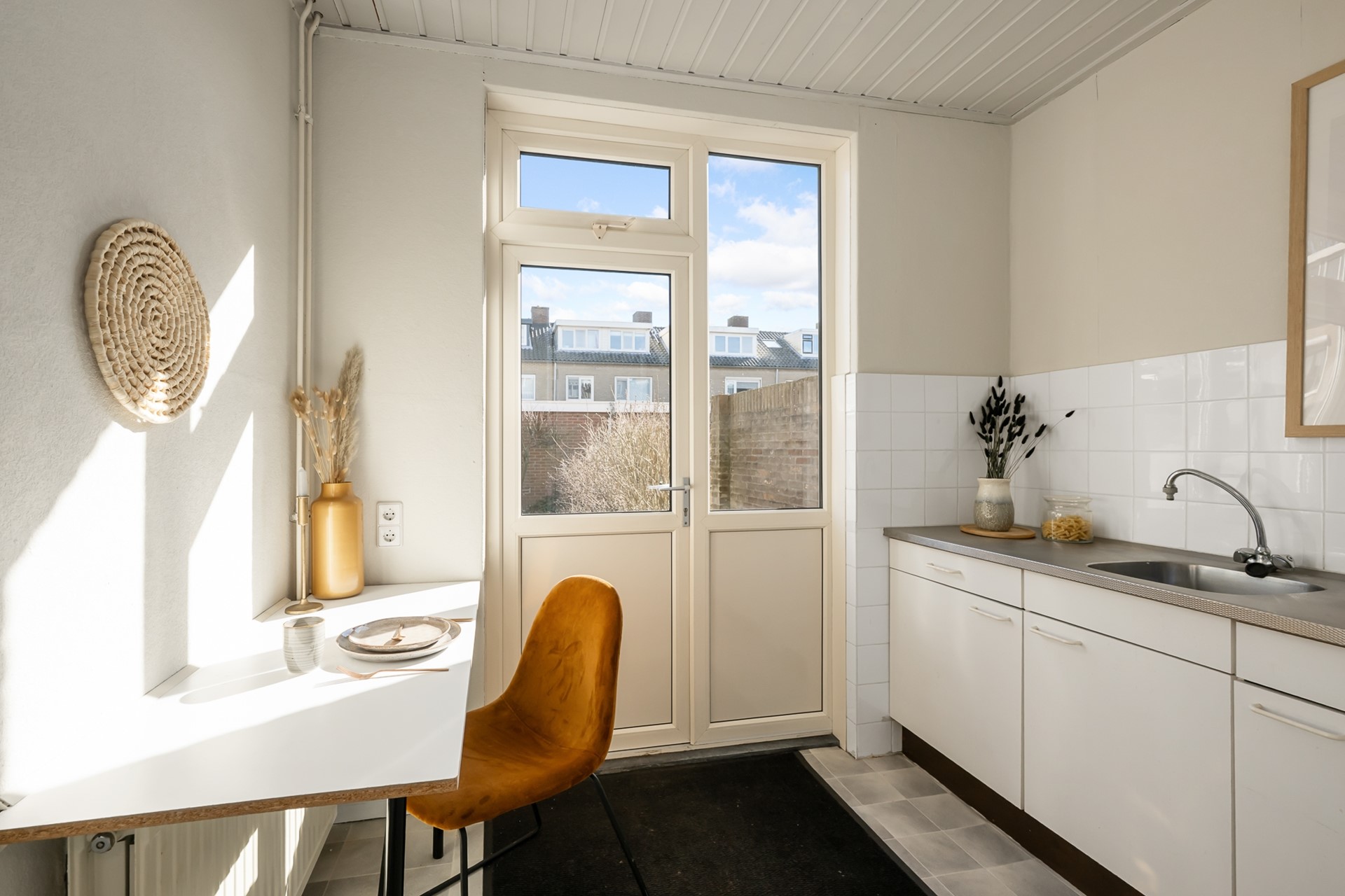 De dichte keuken is voorzien van een eenvoudig keukenblok en biedt toegang tot een royale trapkast: ideaal voor provisie en extra opslag. Vanuit de keuken stap je zo de zonnige achtertuin in.
