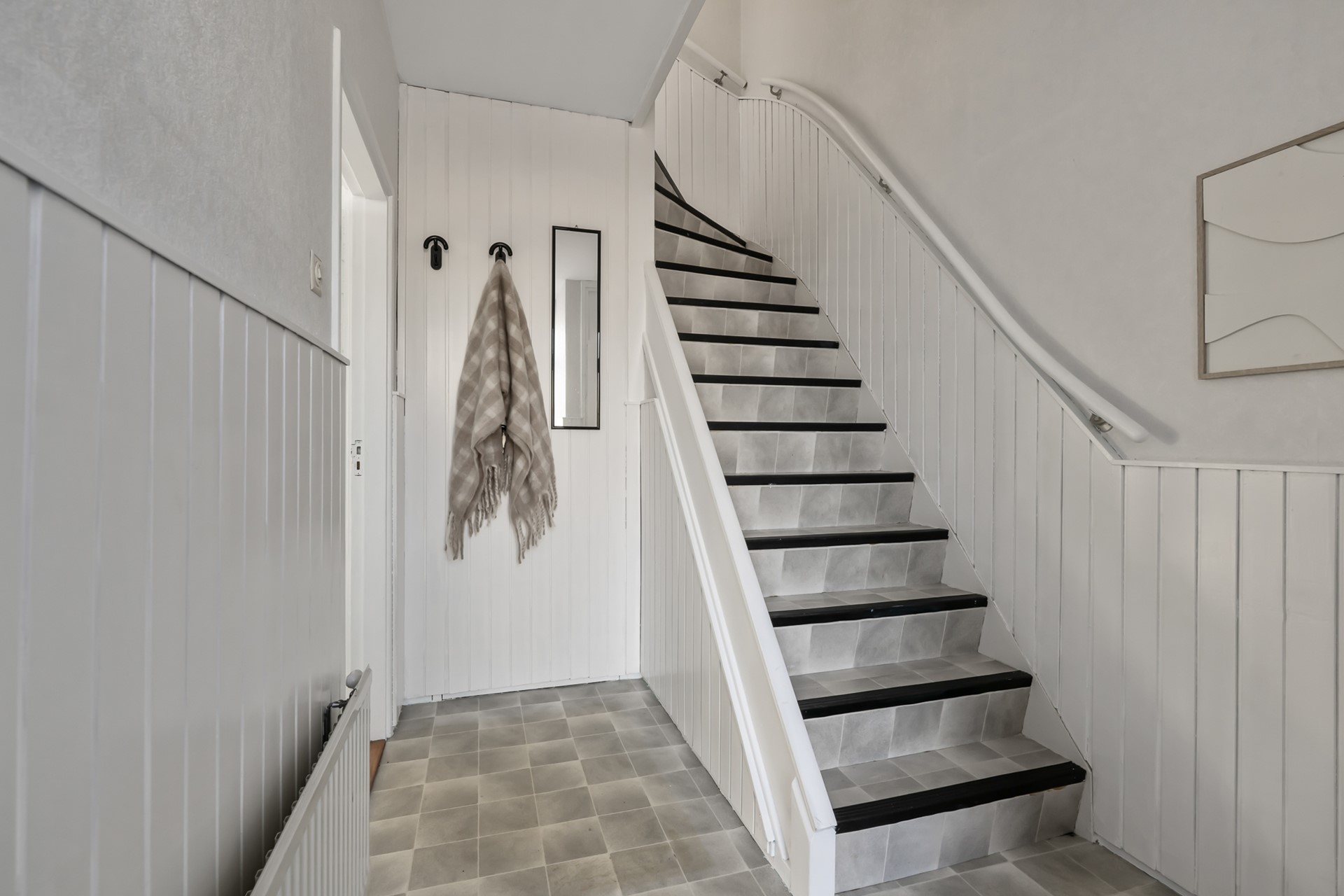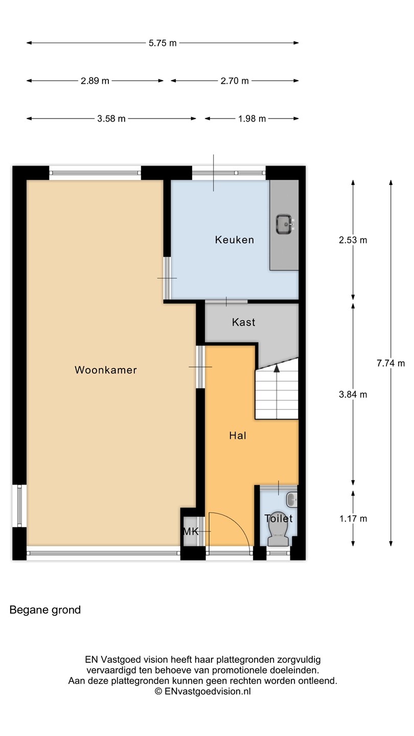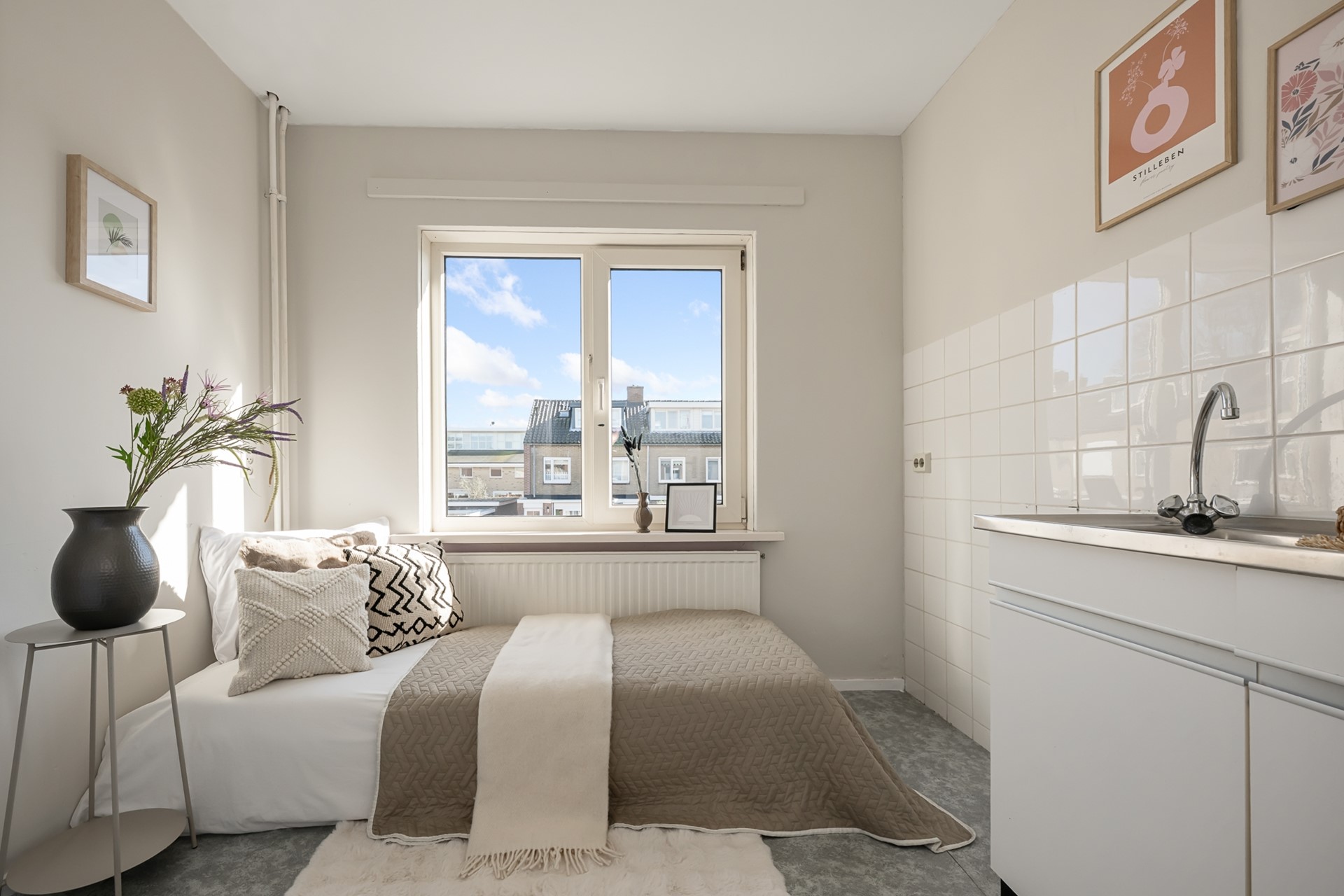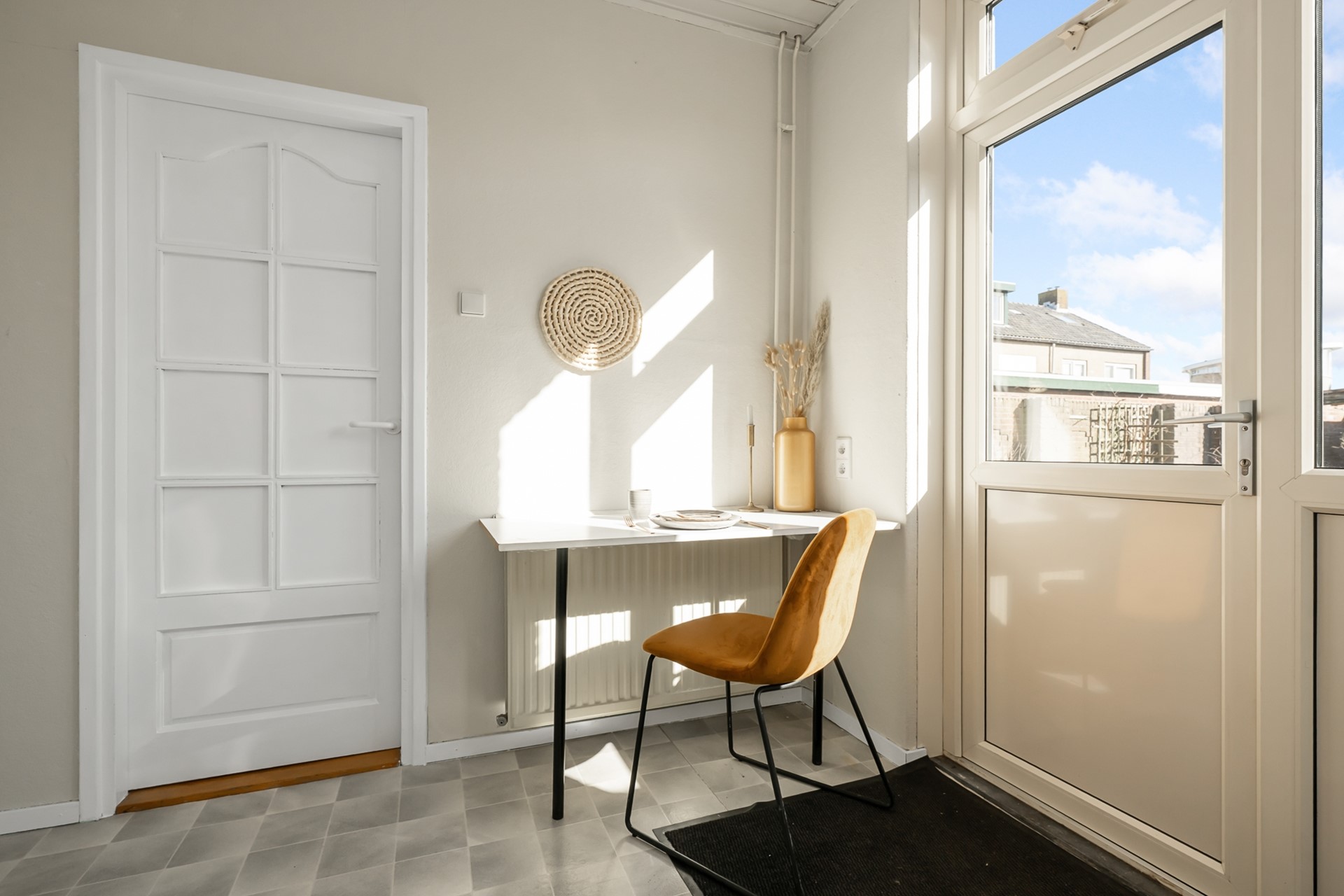 De dichte keuken is voorzien van een eenvoudig keukenblok en biedt toegang tot een royale trapkast: ideaal voor provisie en extra opslag. Vanuit de keuken stap je zo de zonnige achtertuin in.