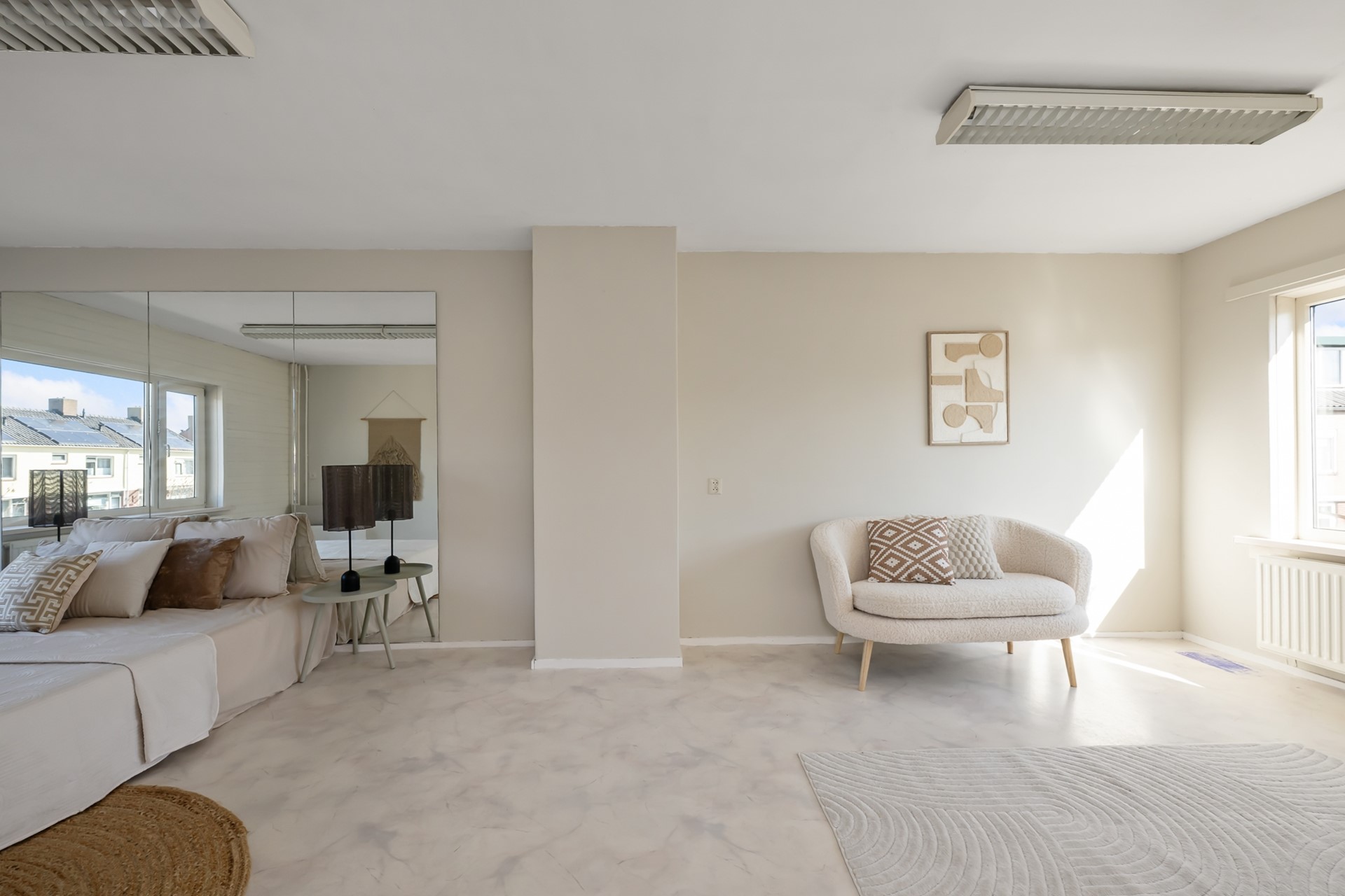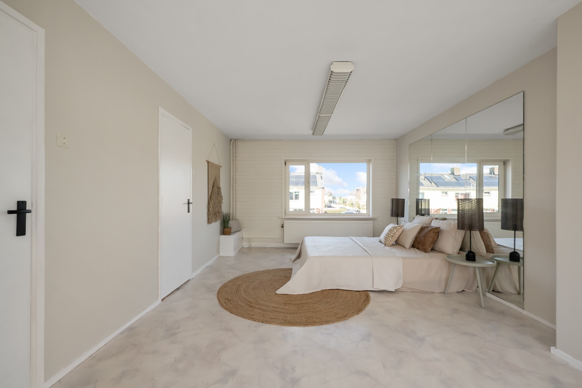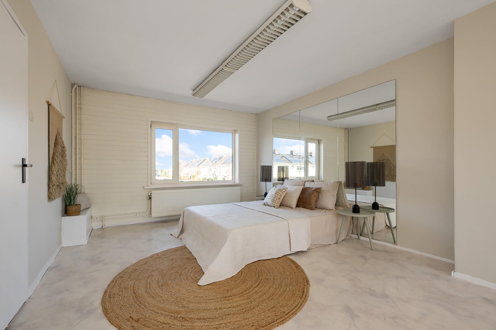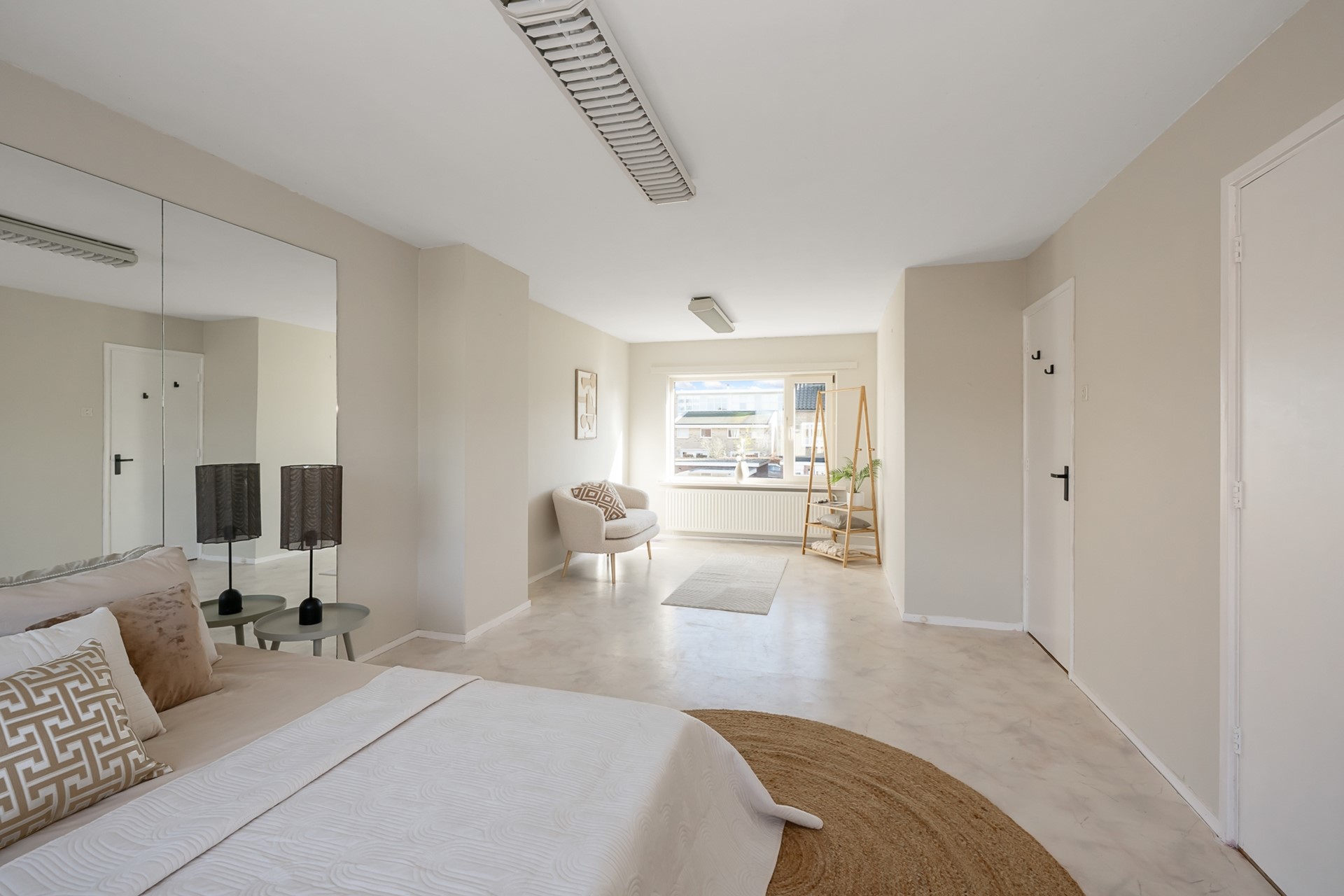 Op de eerste verdieping vind je de overloop, een slaapkamer aan de achterzijde met een klein keukenblok en een inbouwkast, en een ruime masterbedroom. Deze grote kamer biedt bovendien de mogelijkheid om twee slaapkamers te realiseren, ideaal voor gezinnen of thuiswerkers.