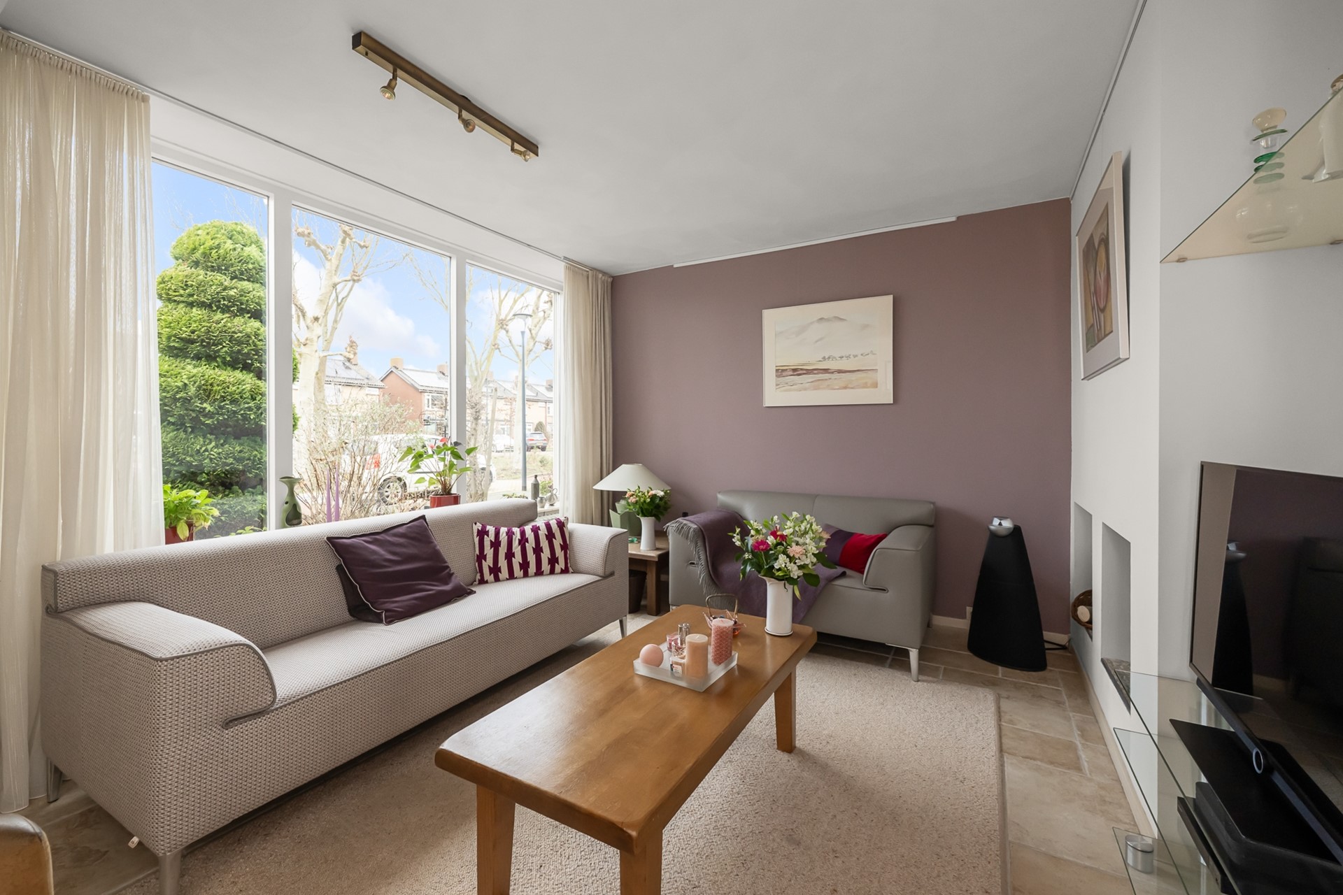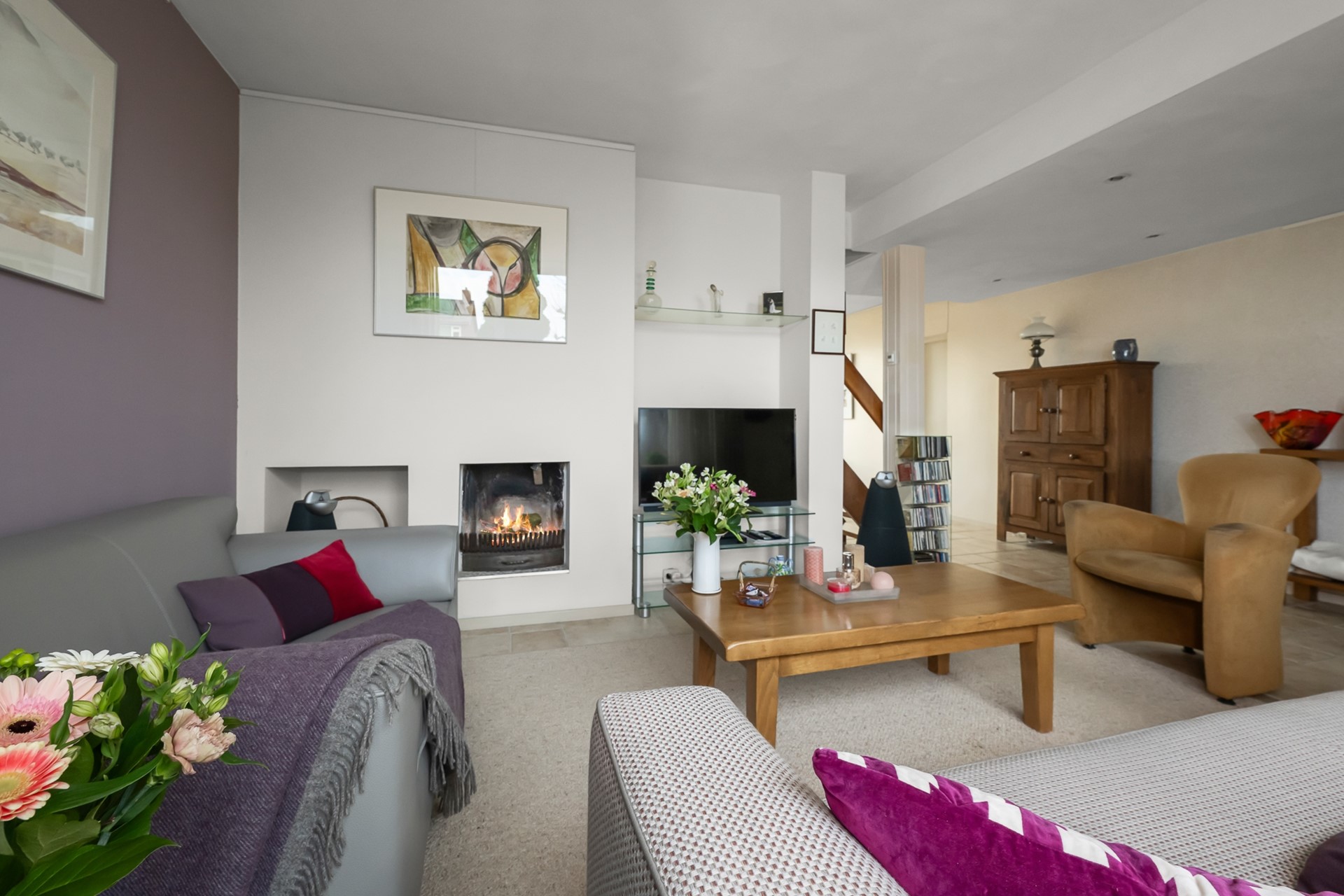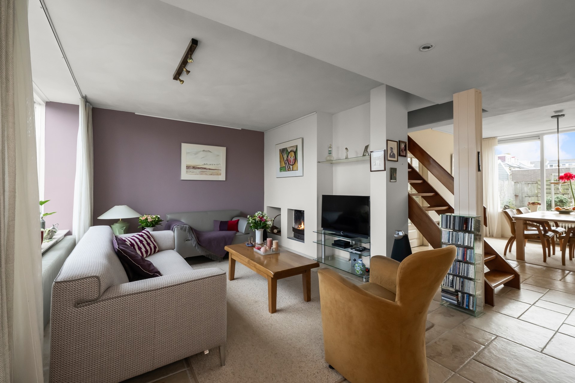 Je komt binnen in de hal met meterkast en toiletruimte. Vanuit hier stap je de lichte woonkamer binnen, waar de open haard direct zorgt voor sfeer en warmte. Dankzij de gedeeltelijke vloerverwarming geniet je hier bovendien van extra comfort. Een heerlijke plek voor lange avonden met familie en vrienden.