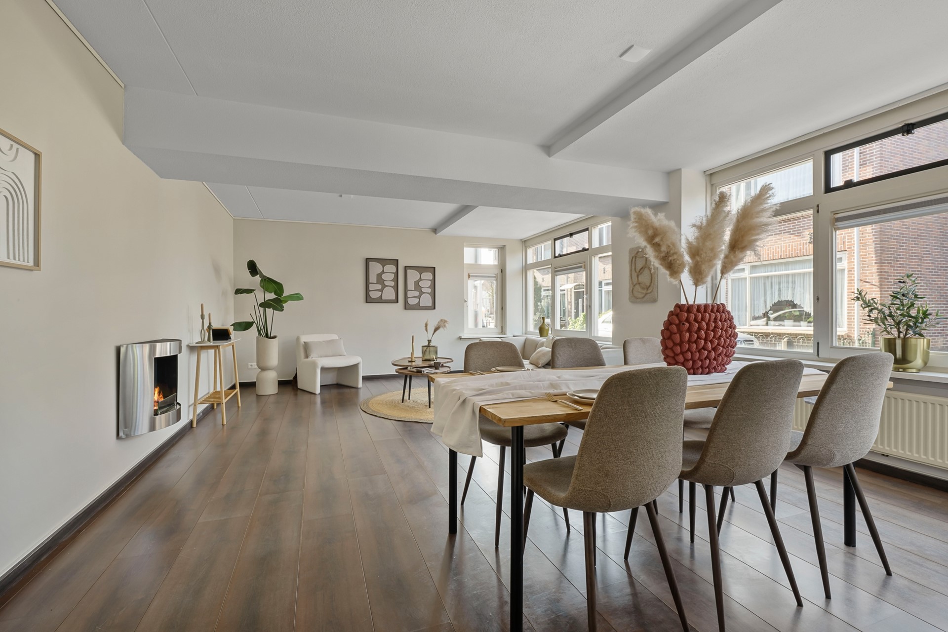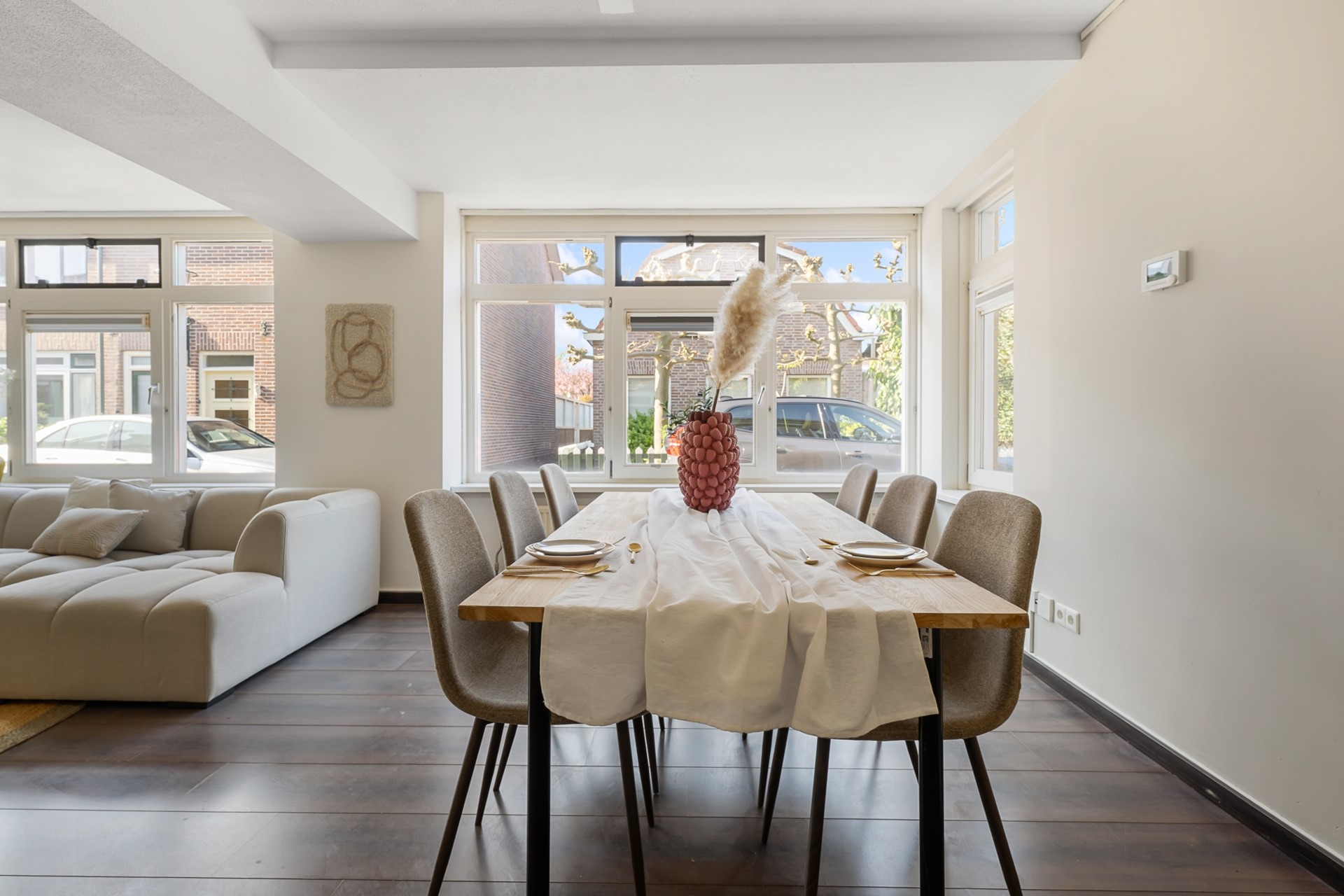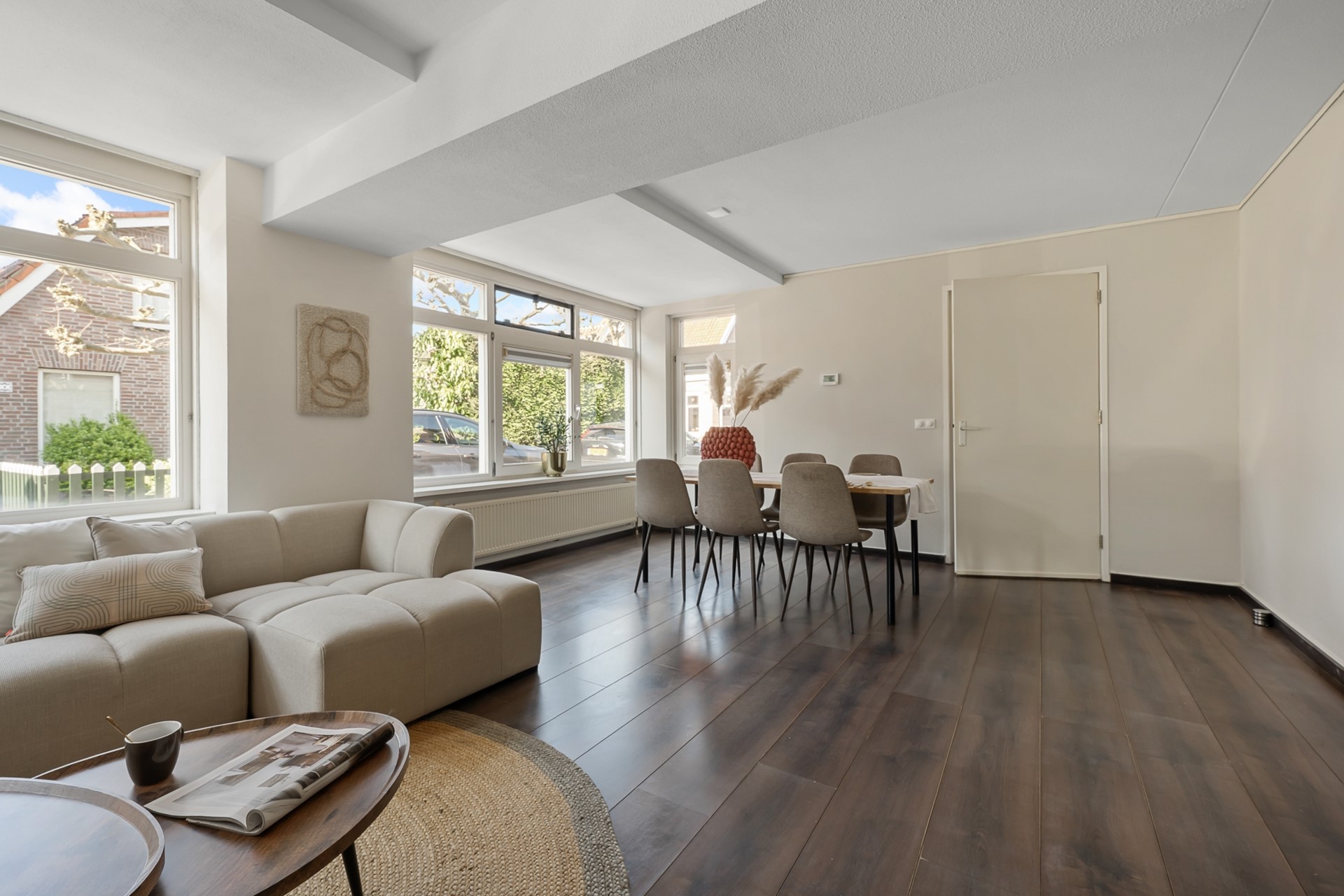 De royale woonkamer valt direct op door de grote raampartijen en de prettige lichtinval, waardoor de woning extra ruim en aangenaam aanvoelt.