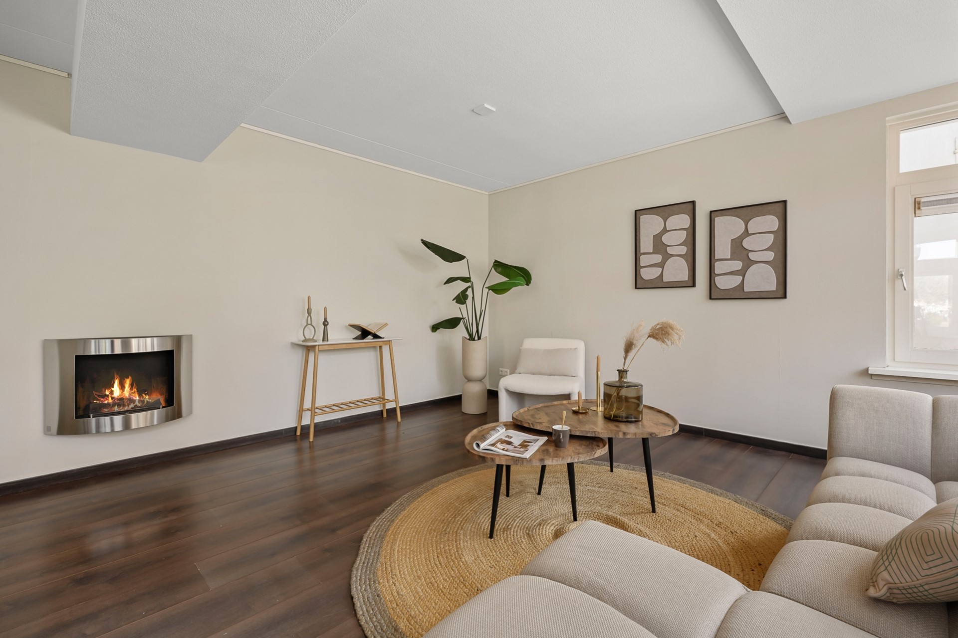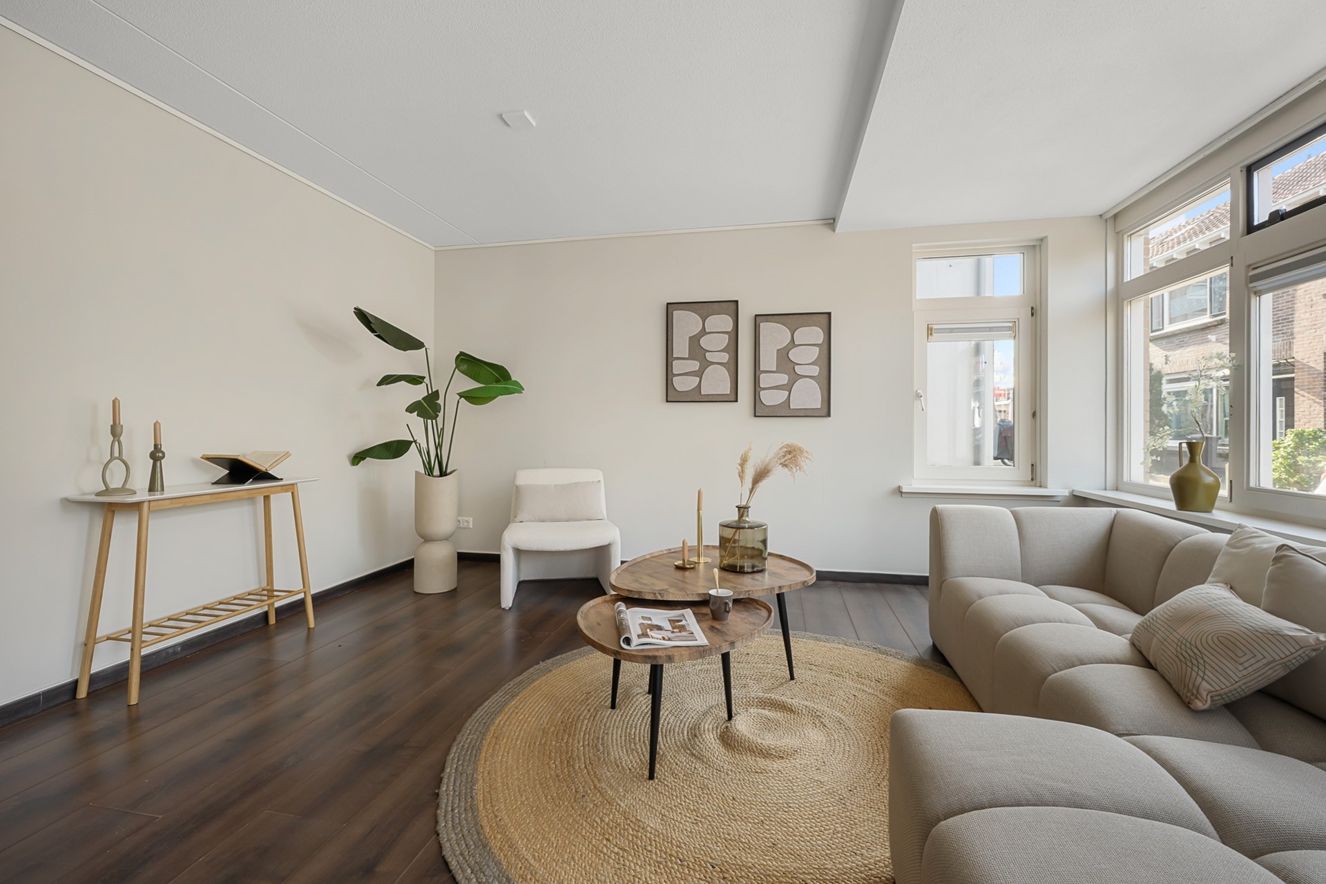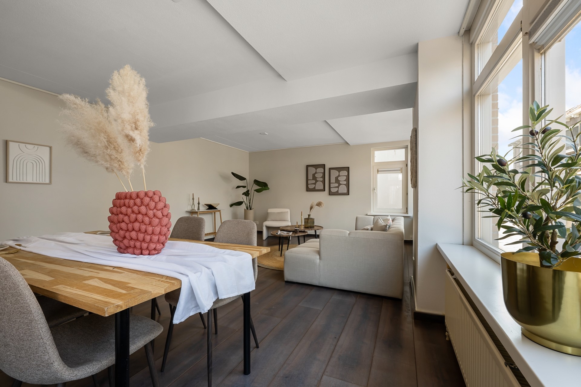 De royale woonkamer valt direct op door de grote raampartijen en de prettige lichtinval, waardoor de woning extra ruim en aangenaam aanvoelt.