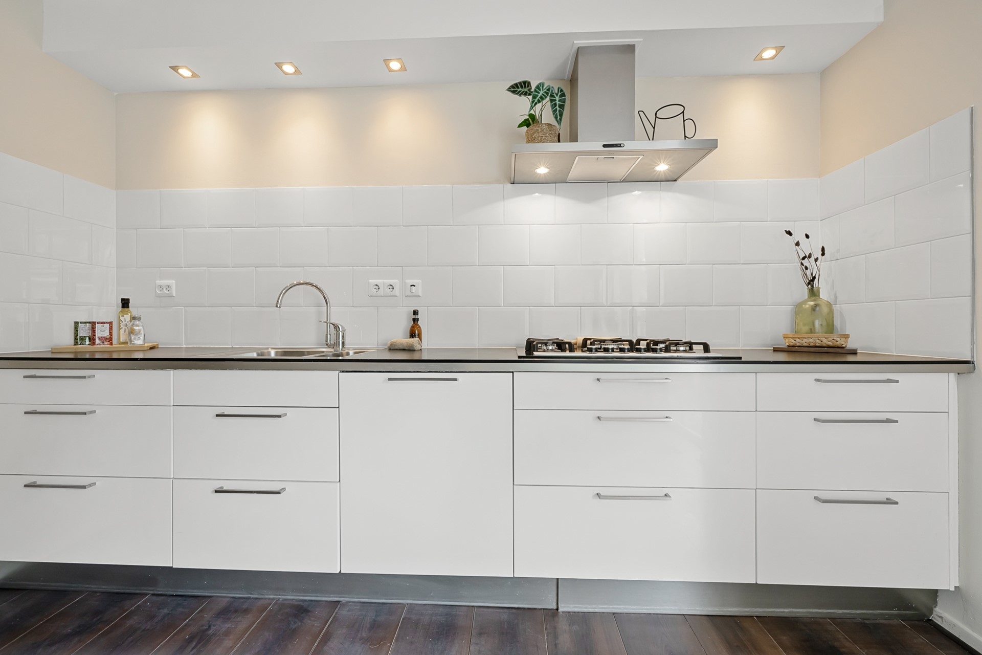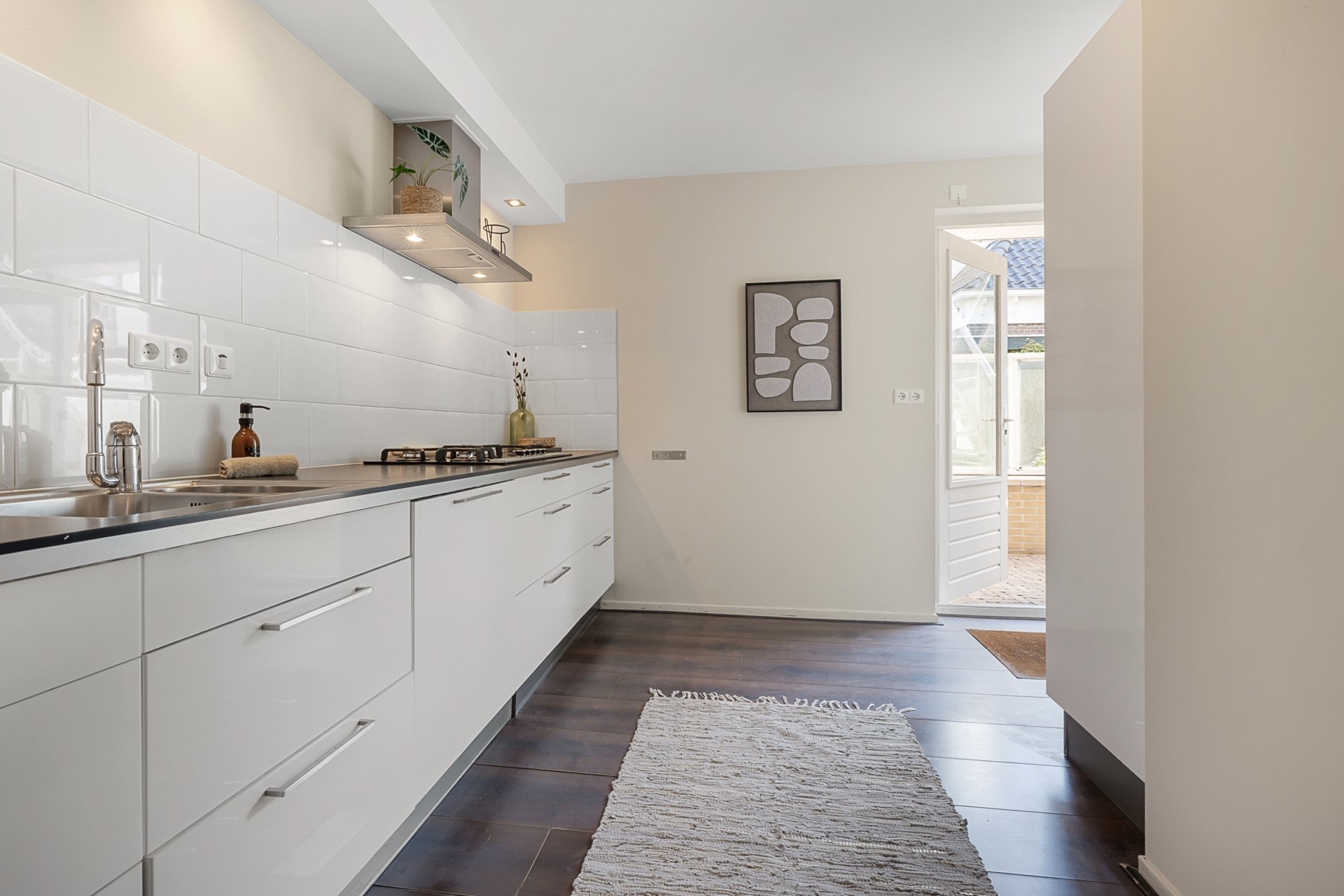 De gesloten keuken beschikt over veel opbergruimte en biedt directe toegang tot het eigen terras, een heerlijke plek om buiten te zitten en te genieten van rust en privacy.