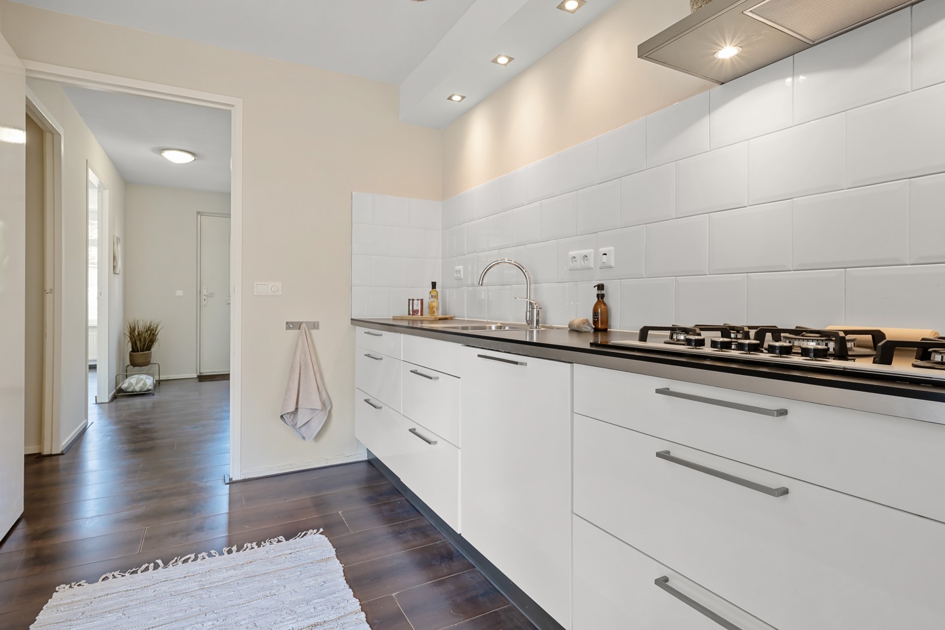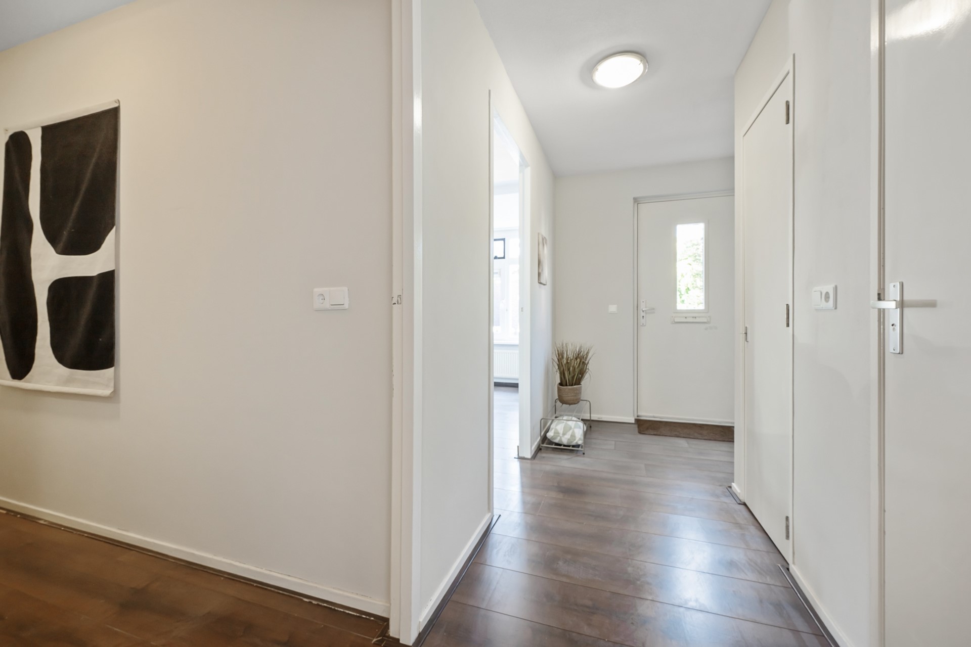 Entree met toilet en meterkast en toegang tot de woonkamer, de keuken en een lange hal die leidt naar de overige vertrekken van de woning.