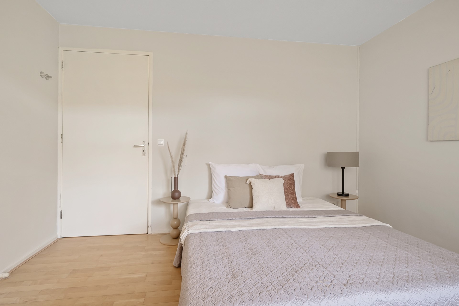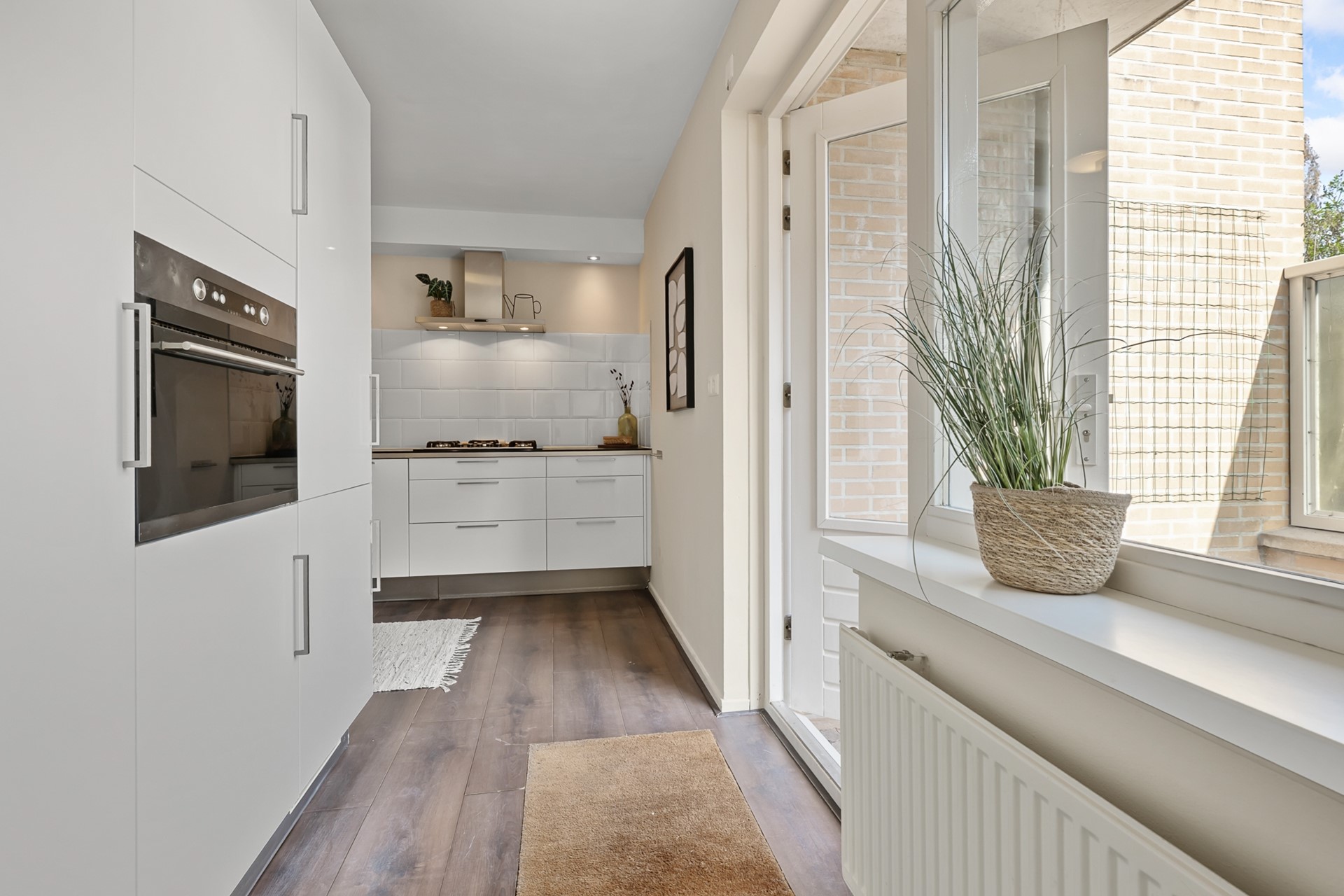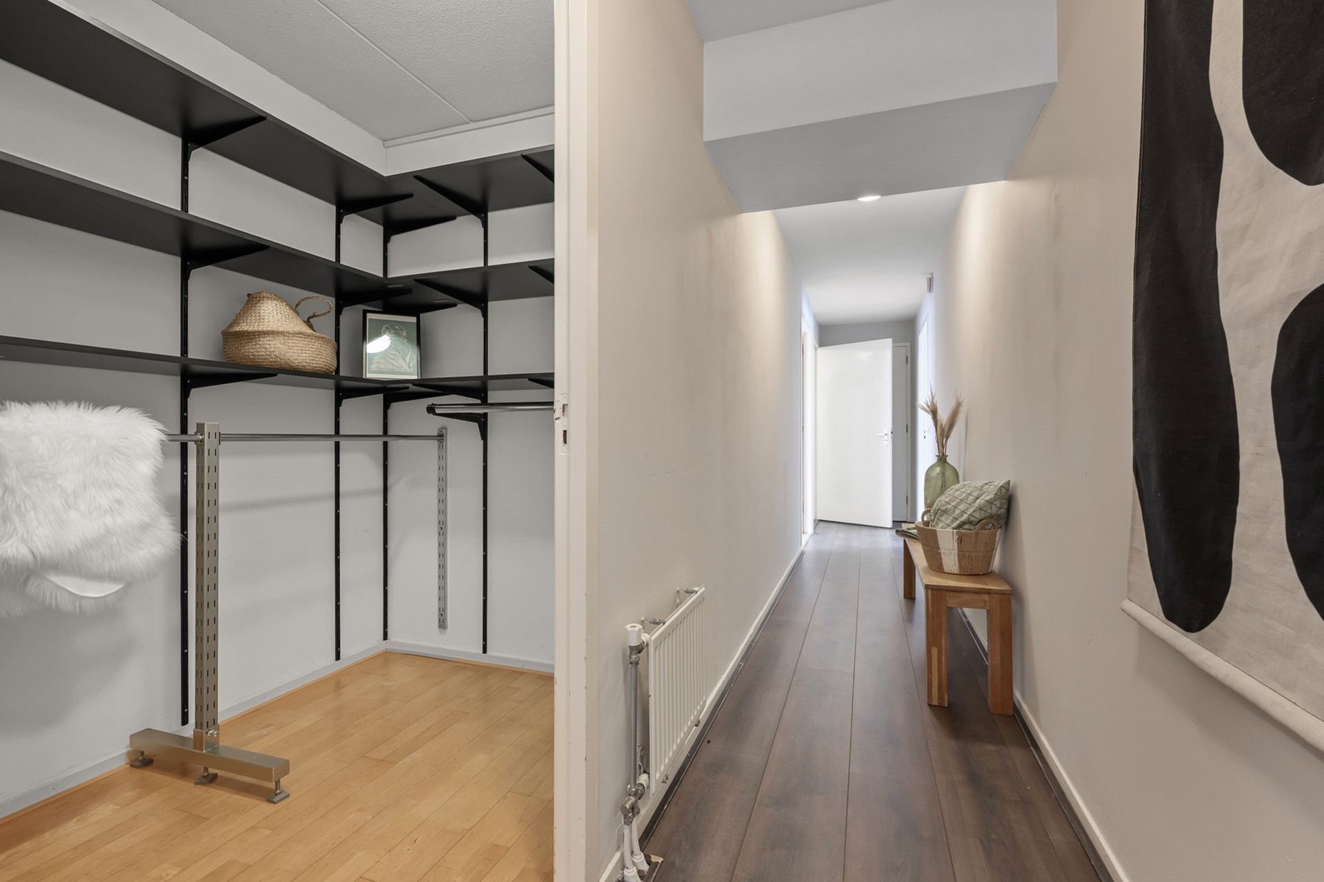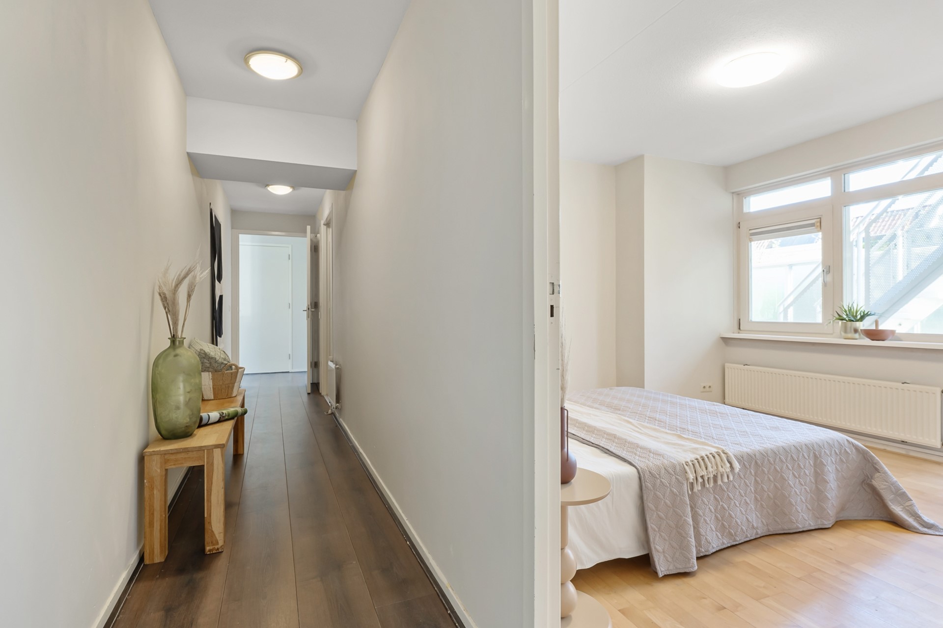 Via de lange hal bereikt u de verschillende ruimtes in het appartement. Hier bevindt zich een praktische inloopkast/berging voor extra opslag. Het appartement beschikt over twee slaapkamers: een ruime hoofdslaapkamer met eveneens toegang tot het terras en een tweede, kleinere slaapkamer die perfect dienst kan doen als werk-, logeer- of kinderkamer.