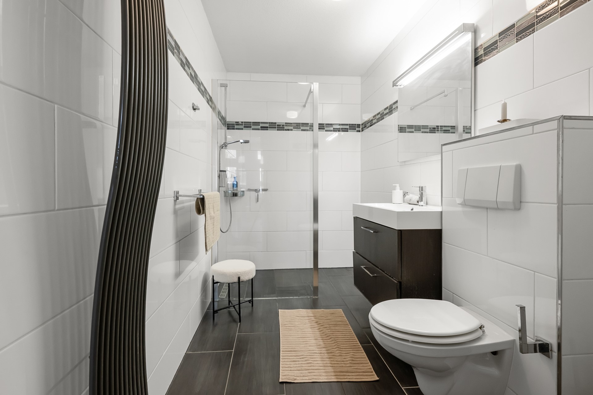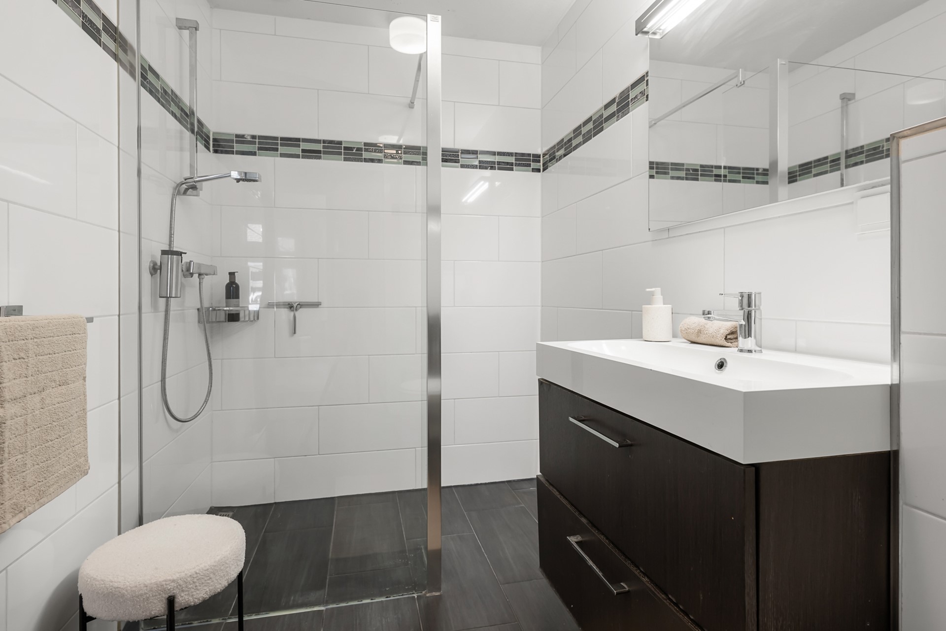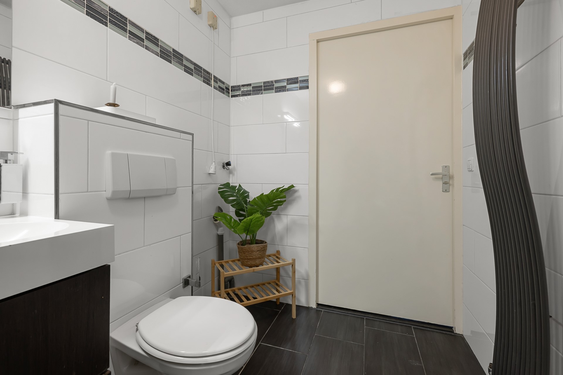 De badkamer is royaal en voorzien van een wastafelmeubel, douche en toilet. Ook is er een aparte berging met opstelling van de CV-ketel.