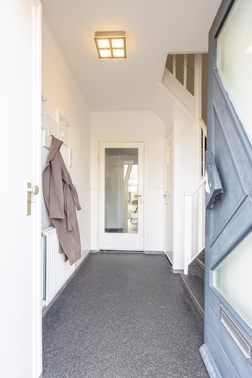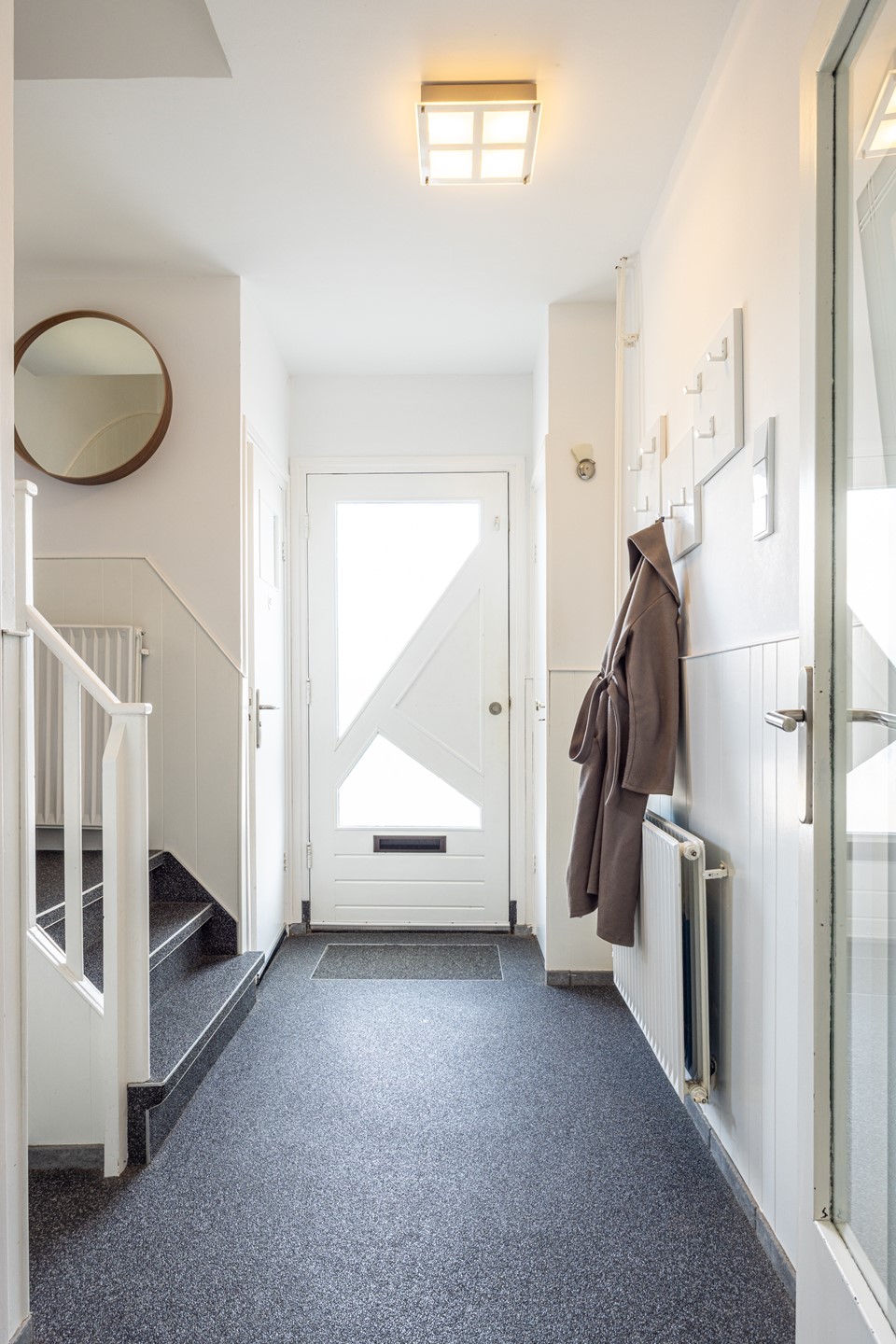 Binnenkomend in de hal valt de grindvloer meteen op: onderhoudsvriendelijk, strak en passend bij de rest van de begane grond. In de hal bevinden zich de garderobe, het toilet met fonteintje en de toegang tot de kelder. De kelder is een echte bergruimte met voldoende plek voor opslag. Hier vind je ook de witgoedaansluitingen, ideaal om de wasmachine en droger uit de leefruimtes te houden.