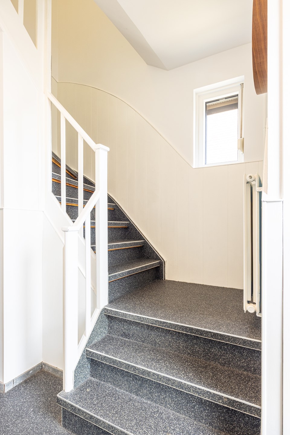 Via de houten trap, die is afgewerkt met dezelfde grindvloer als beneden, bereik je de eerste verdieping. De overloop is licht dankzij het raam met HR++ glas en biedt toegang tot drie slaapkamers en de badkamer.