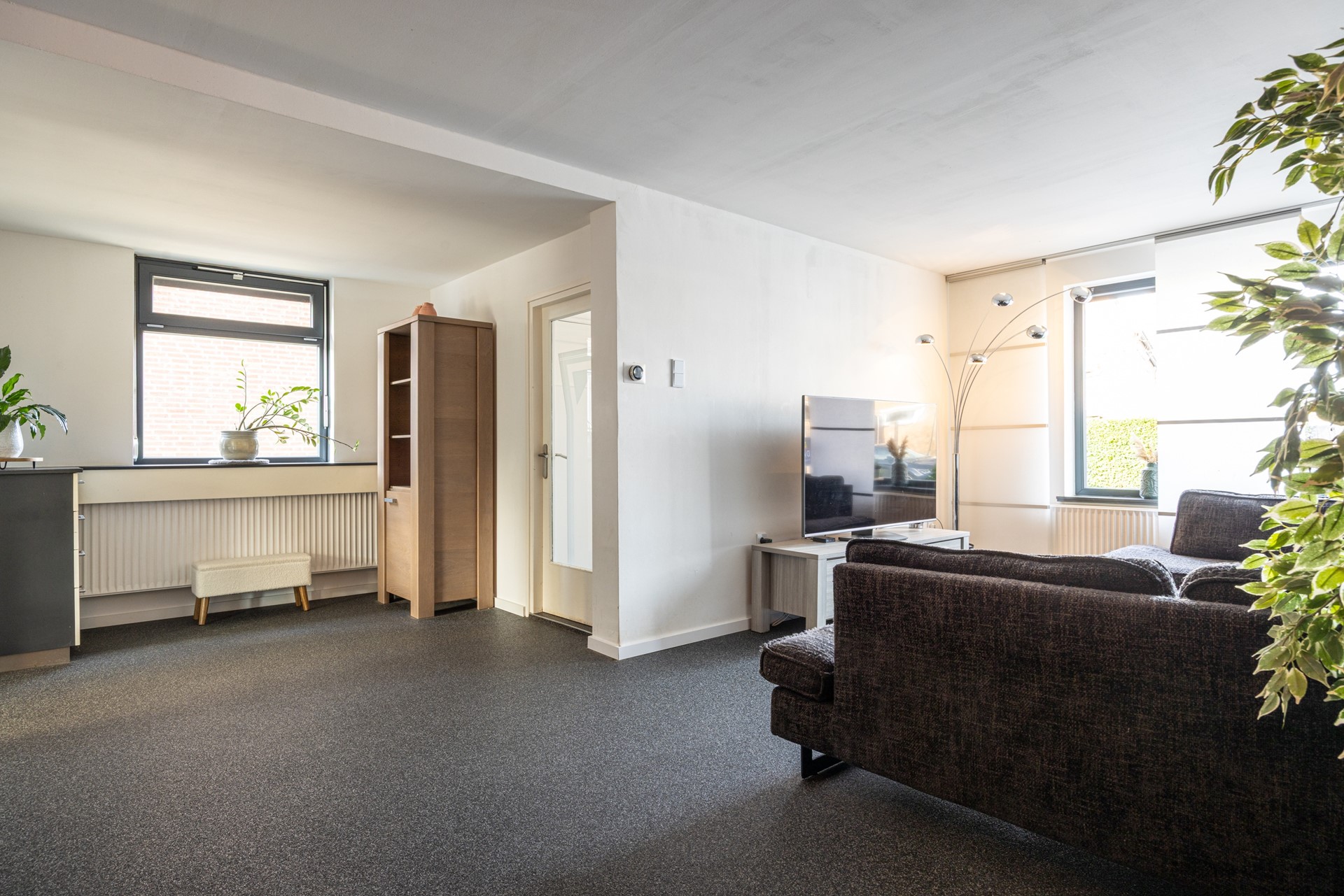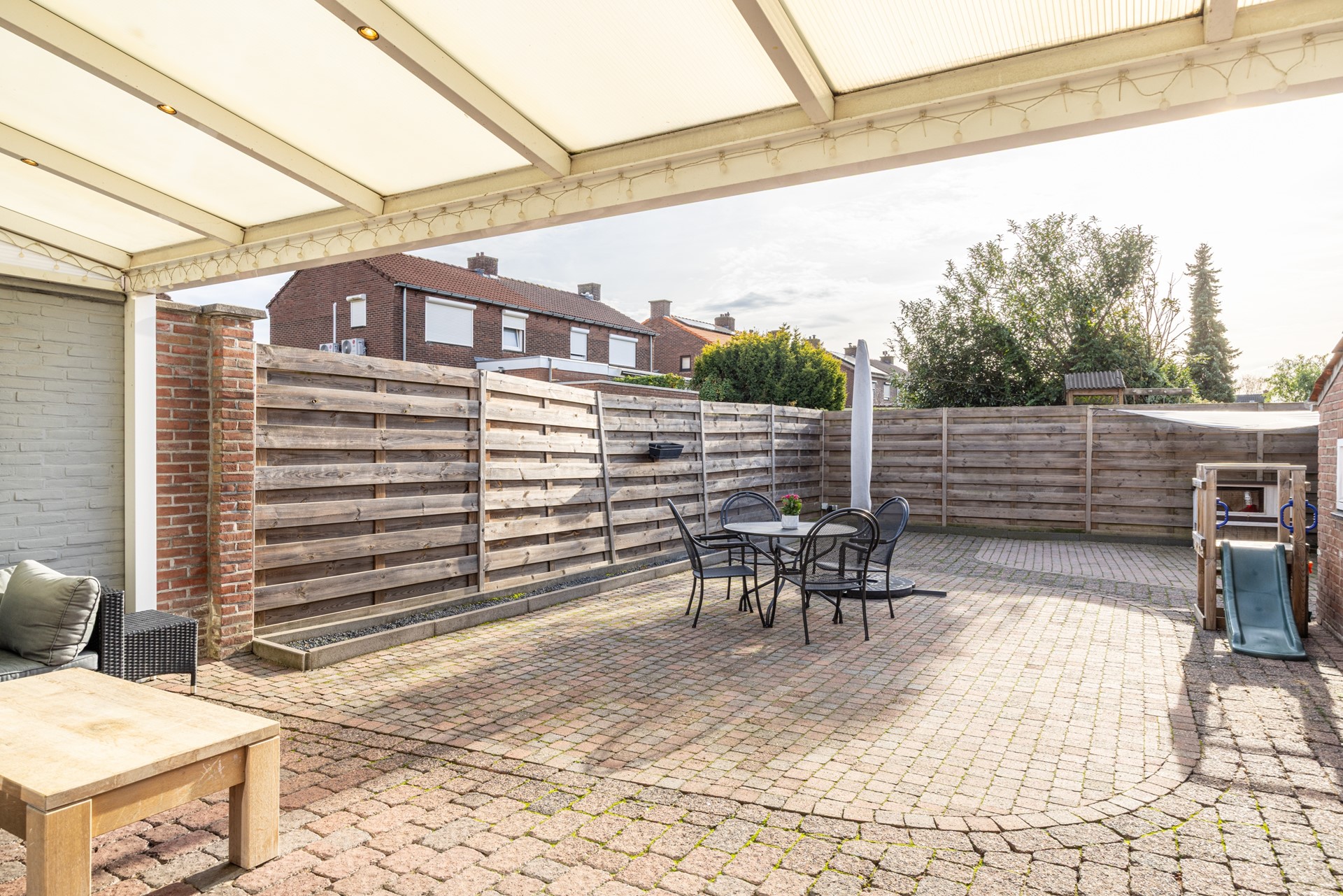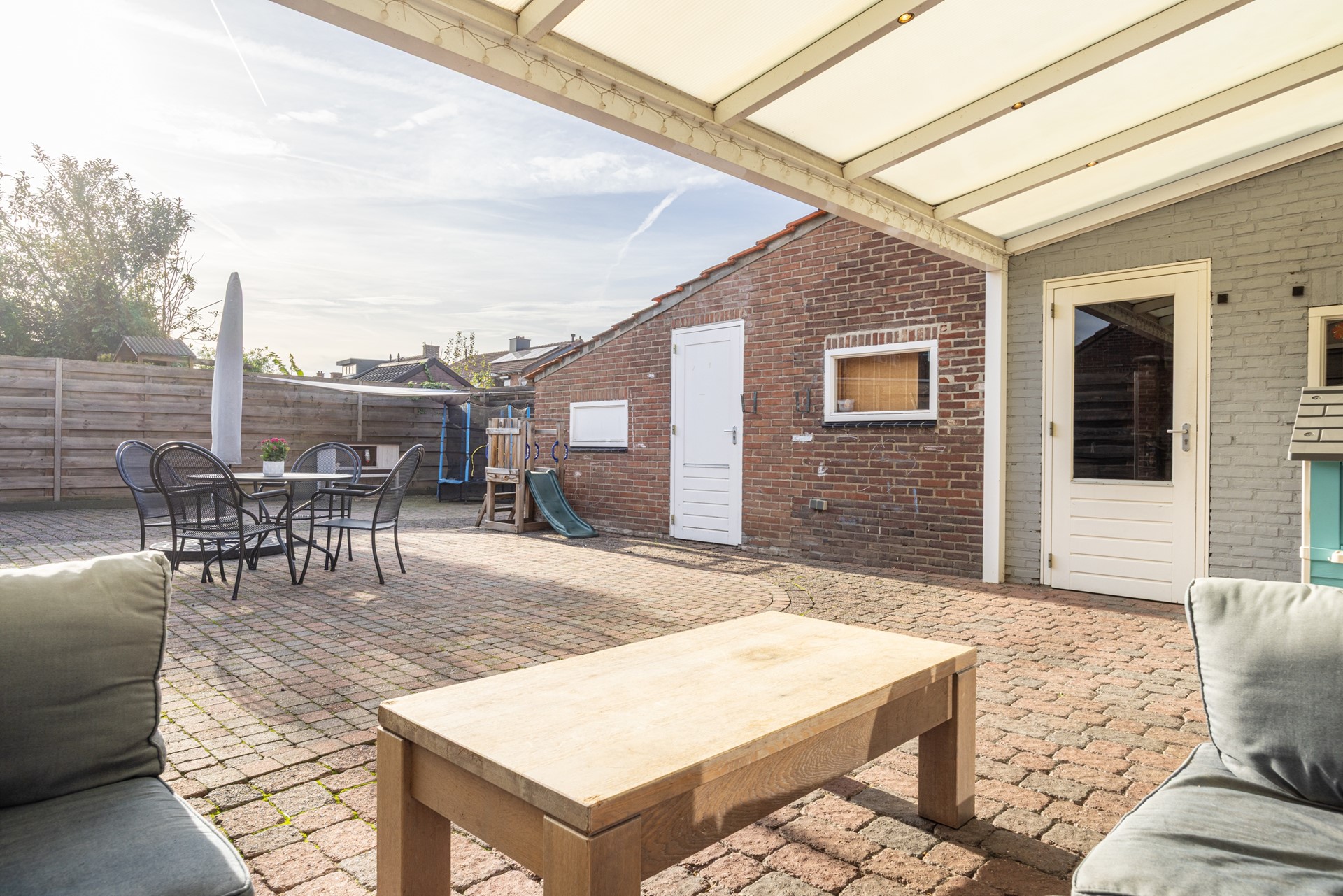 Door de schuifpui aan de achterzijde heb je rechtstreeks toegang tot de overkapping in de tuin, waardoor binnen en buiten makkelijk in elkaar overlopen.