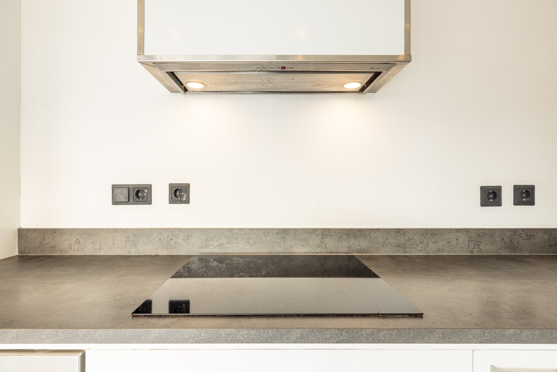 De halfopen keuken is praktisch ingedeeld met veel werk- en kastruimte. De grindvloer loopt hier mooi door. De keuken is uitgerust met: 4-pits inductiekookplaat, afzuigkap, koelkast en vaatwasser.