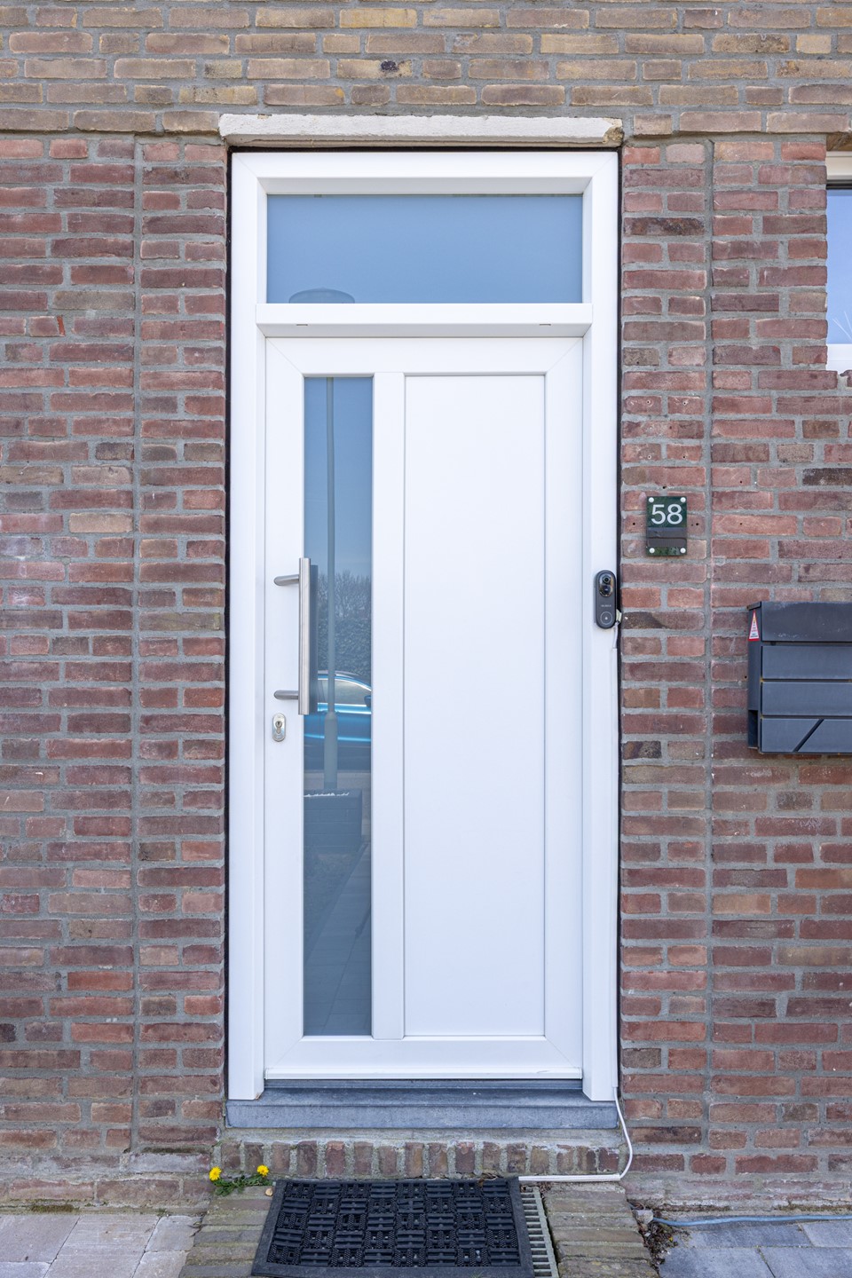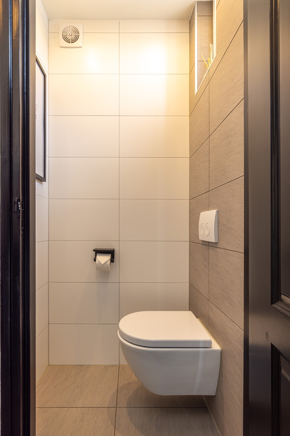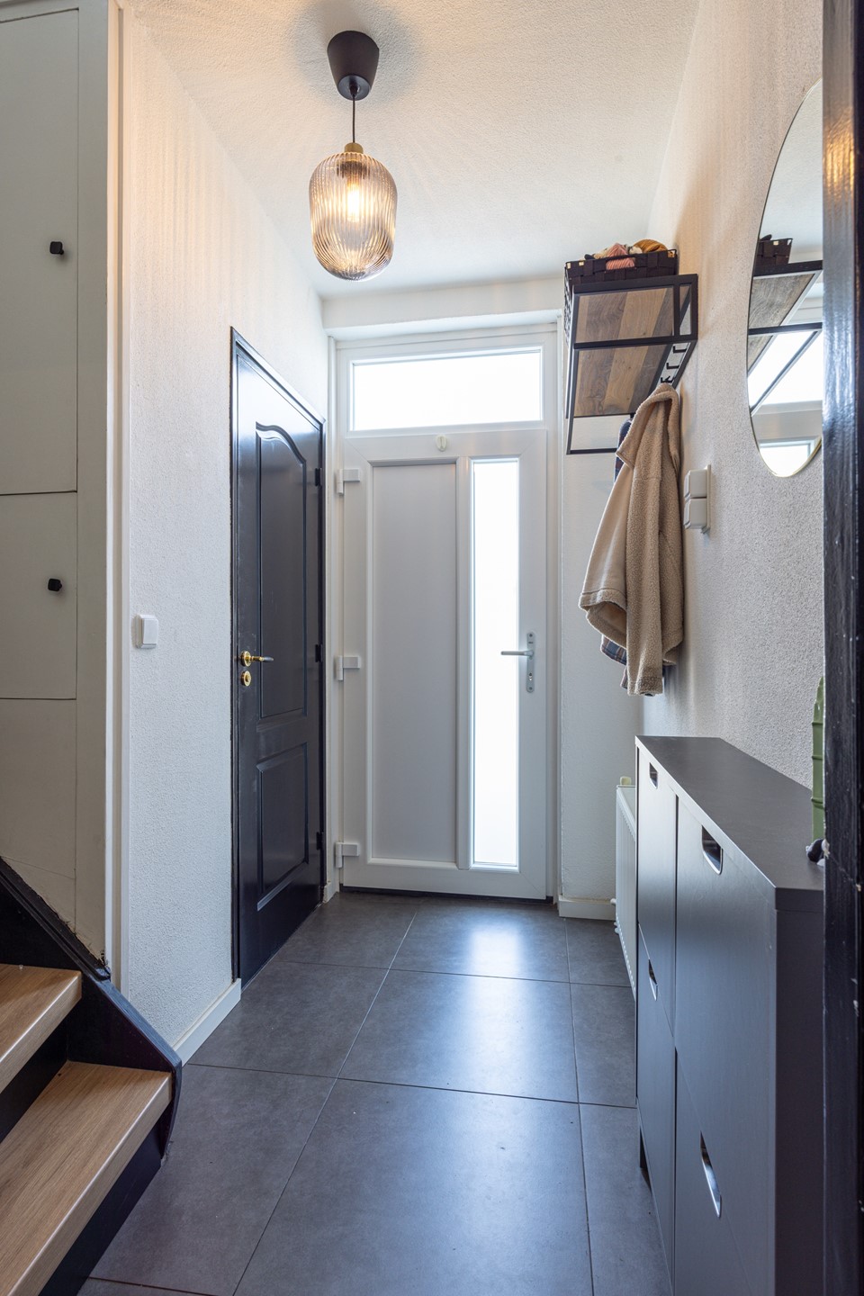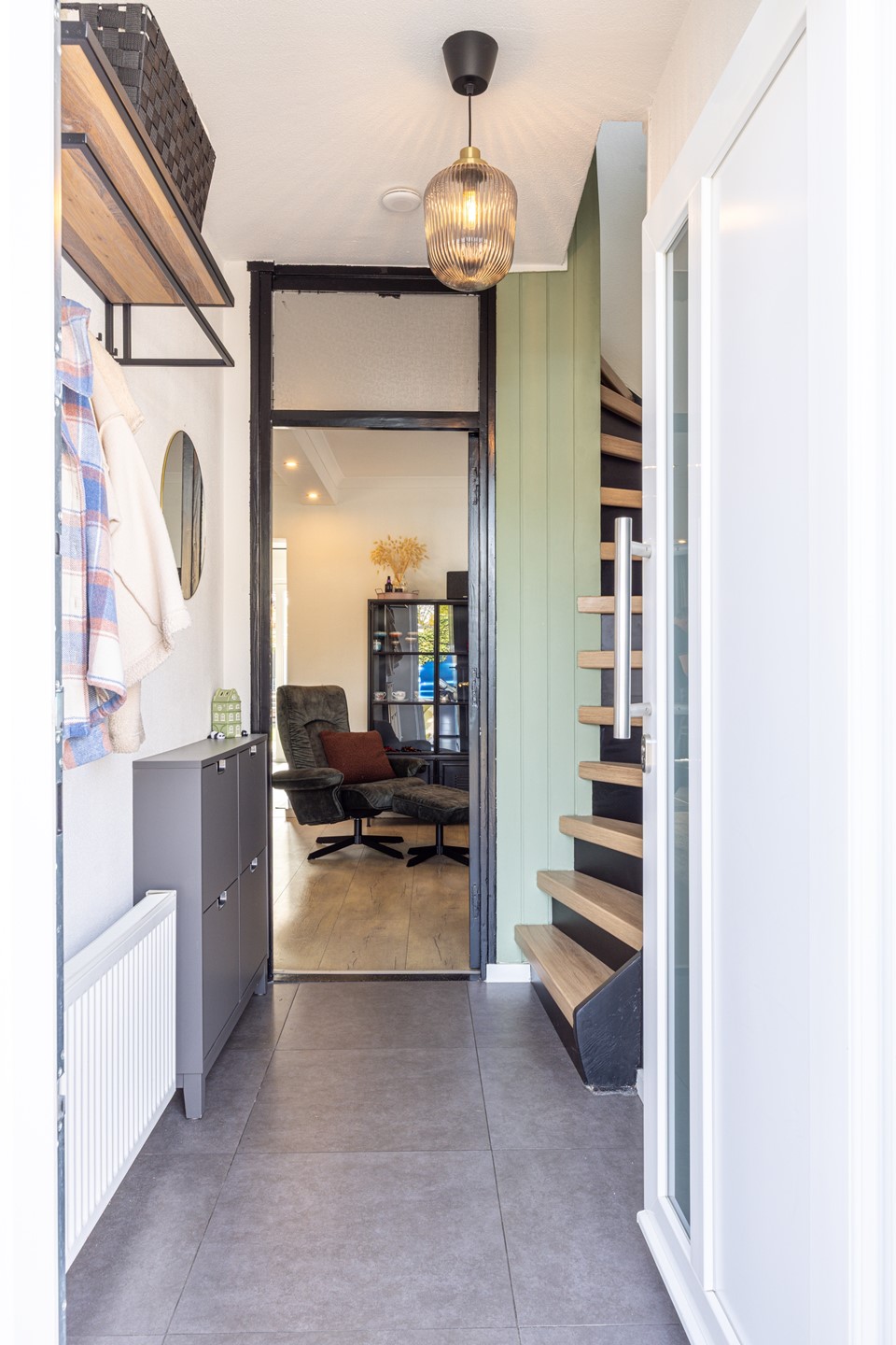 Via de eigen oprit bereik je de woning, waar de verzorgde voortuin direct een nette eerste indruk geeft en zorgt voor een prettige binnenkomst. Bij binnenkomst in de ontvangsthal valt de praktische indeling direct op. De hal is afgewerkt met een tegelvloer en biedt toegang tot de meterkast en het toilet. Het toilet is uitgevoerd met een zwevend closet en beschikt over een raampje met HR++ beglazing, wat zorgt voor natuurlijke ventilatie en daglicht.