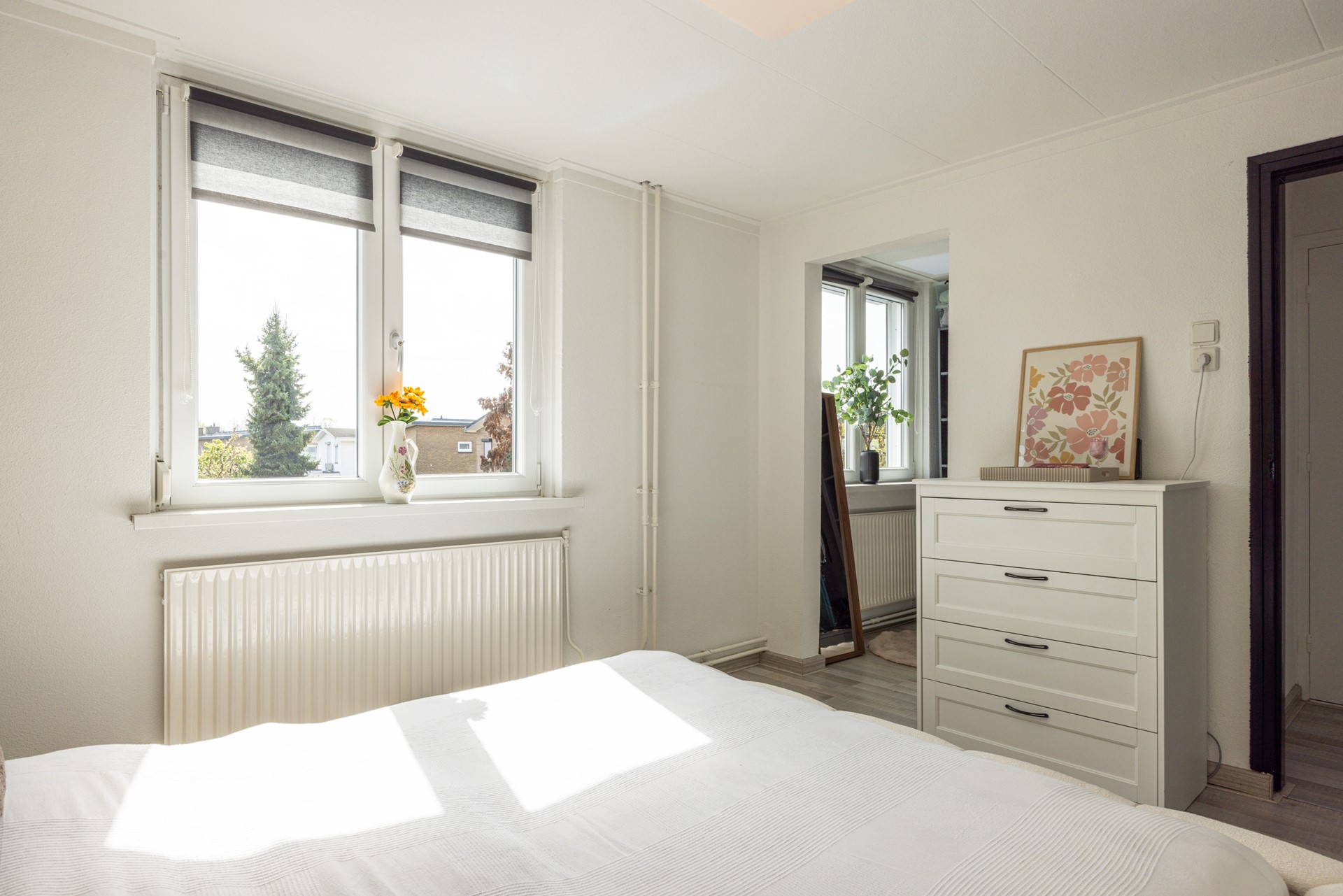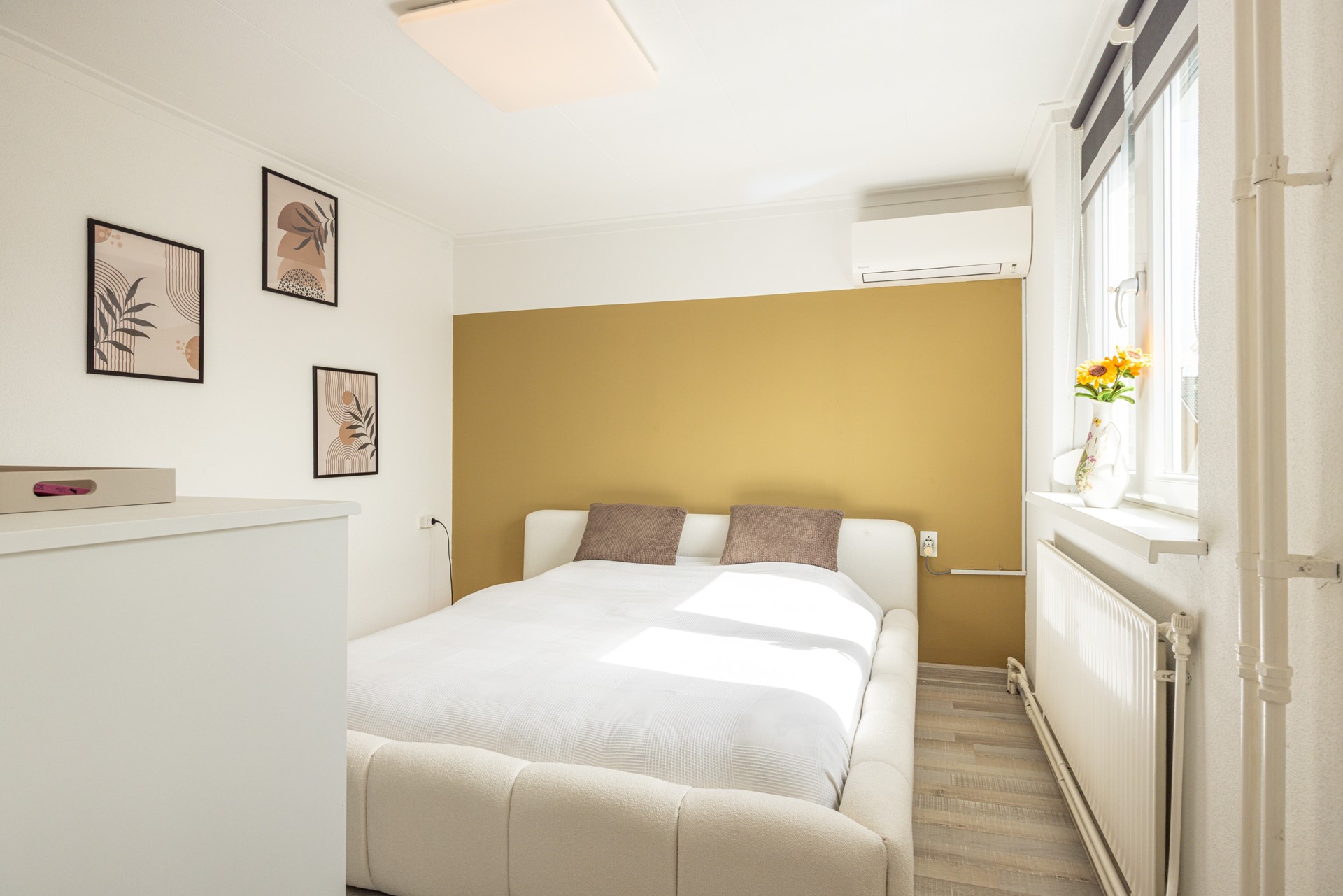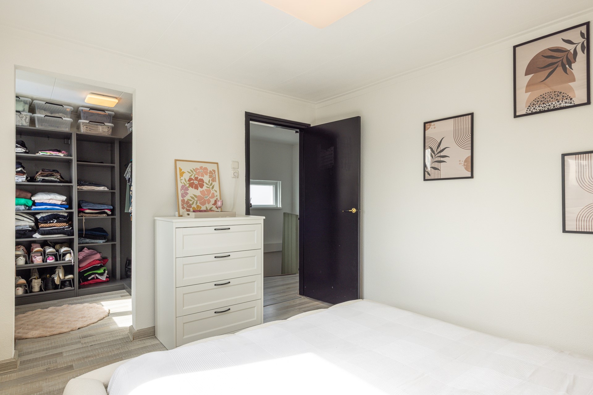 Via een houten trap bereik je de eerste verdieping. De overloop is afgewerkt met een laminaatvloer en beschikt over kunststof kozijnen met melkglas, wat zorgt voor daglicht met behoud van privacy. Daarnaast is er toegang tot een praktisch berghok voor extra opslag. De verdieping beschikt over twee slaapkamers, beide van goed formaat en prettig in gebruik. De kamers zijn afgewerkt met laminaatvloeren, voorzien van kunststof kozijnen met HR++ beglazing en rolluiken. Dankzij de raampartijen valt er veel daglicht binnen, wat de ruimtes licht en aangenaam maakt. De hoofdslaapkamer aan de voorzijde is daarnaast uitgerust met een airco-installatie en beschikt over een aangrenzende inloopkast. Deze inloopkast vormt een mooie aanvulling op de slaapkamer, maar kan met een relatief eenvoudige aanpassing weer worden teruggebracht naar een derde slaapkamer.