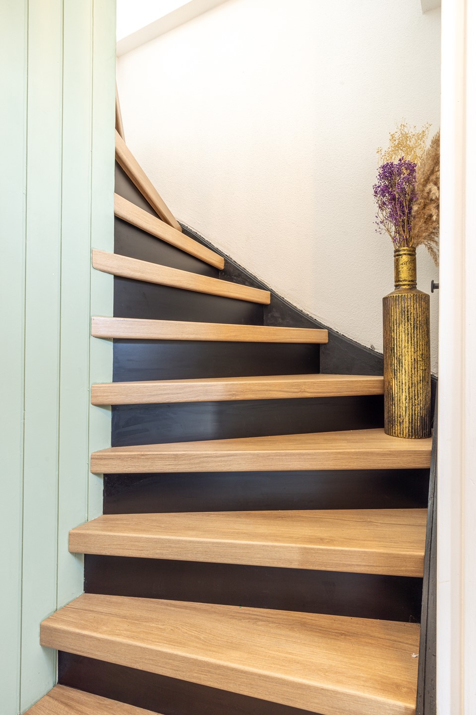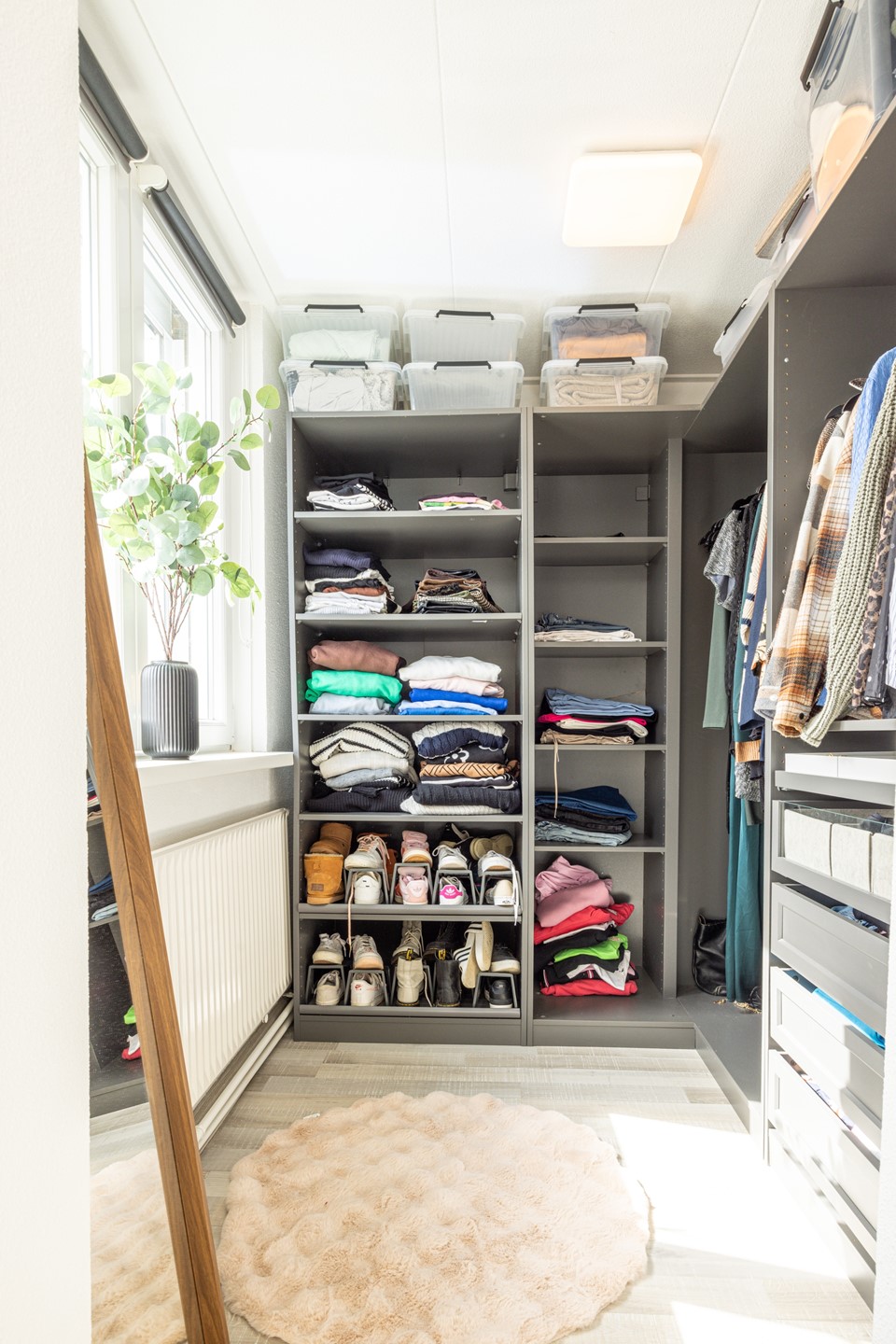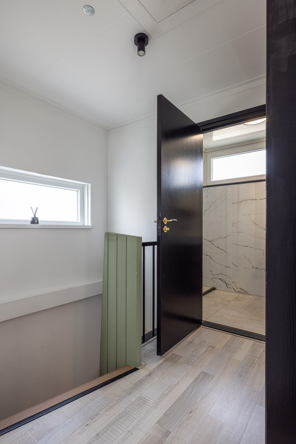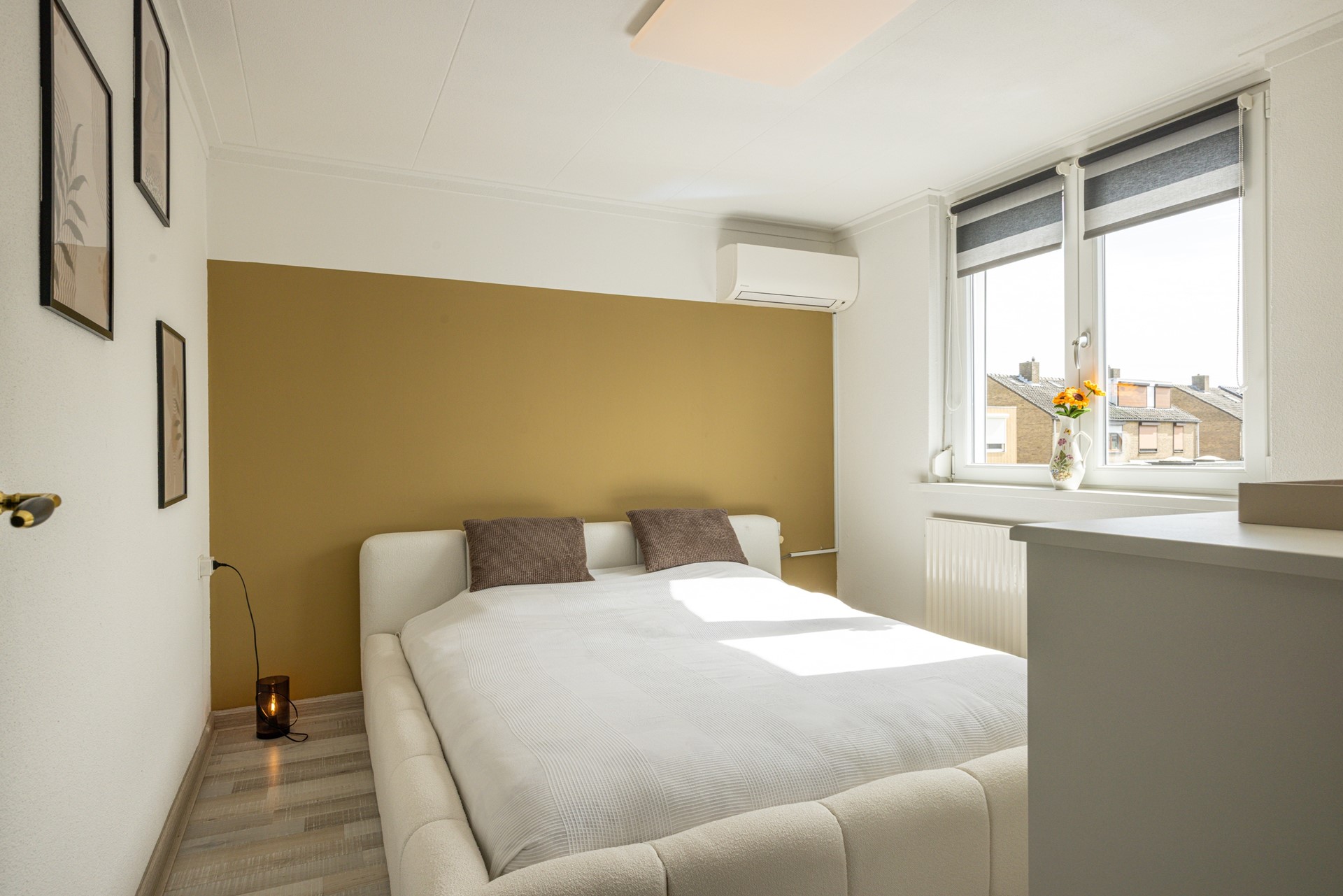Via een houten trap bereik je de eerste verdieping. De overloop is afgewerkt met een laminaatvloer en beschikt over kunststof kozijnen met melkglas, wat zorgt voor daglicht met behoud van privacy. Daarnaast is er toegang tot een praktisch berghok voor extra opslag. De verdieping beschikt over twee slaapkamers, beide van goed formaat en prettig in gebruik. De kamers zijn afgewerkt met laminaatvloeren, voorzien van kunststof kozijnen met HR++ beglazing en rolluiken. Dankzij de raampartijen valt er veel daglicht binnen, wat de ruimtes licht en aangenaam maakt. De hoofdslaapkamer aan de voorzijde is daarnaast uitgerust met een airco-installatie en beschikt over een aangrenzende inloopkast. Deze inloopkast vormt een mooie aanvulling op de slaapkamer, maar kan met een relatief eenvoudige aanpassing weer worden teruggebracht naar een derde slaapkamer.