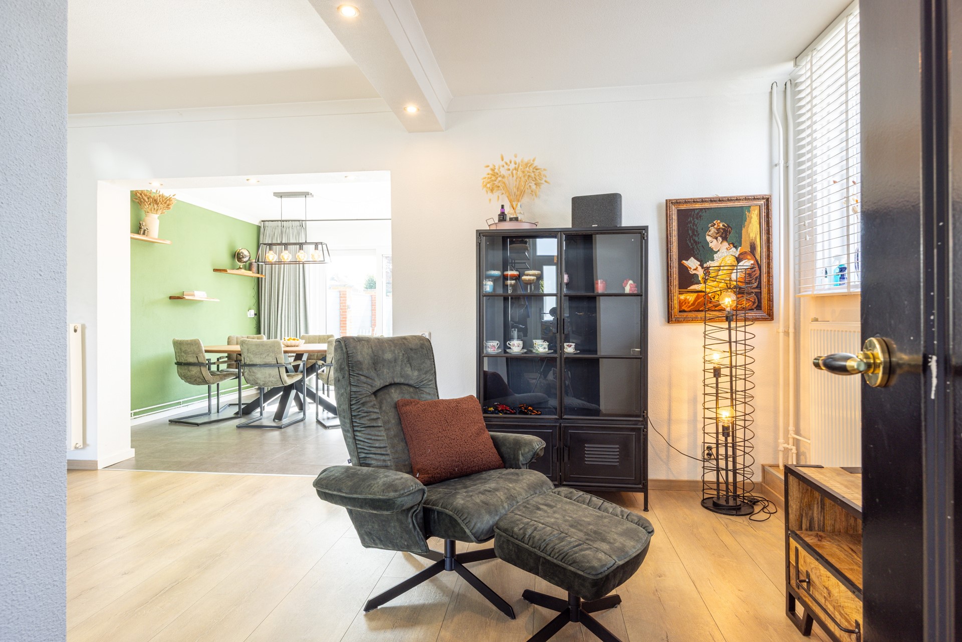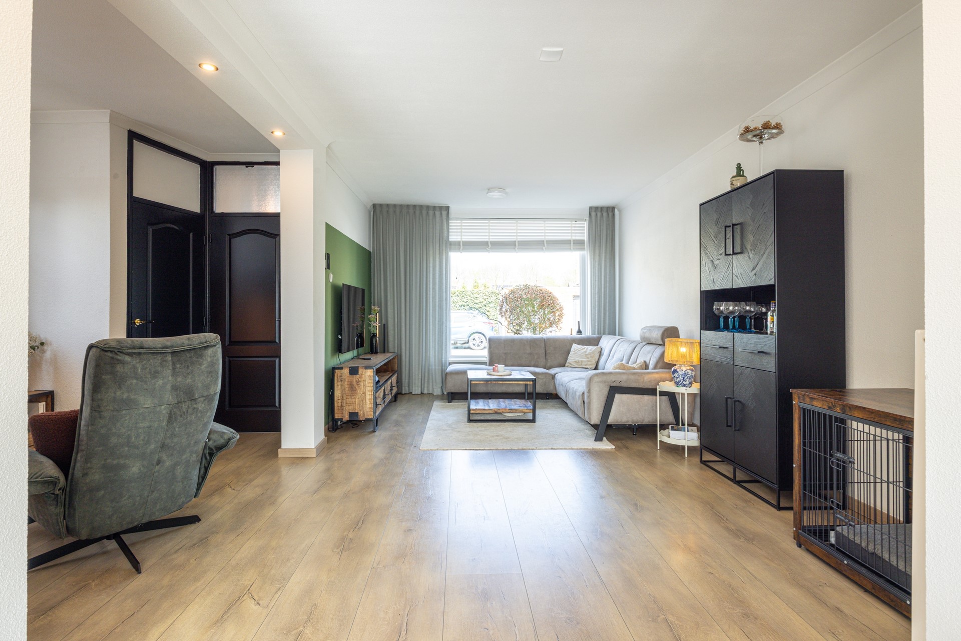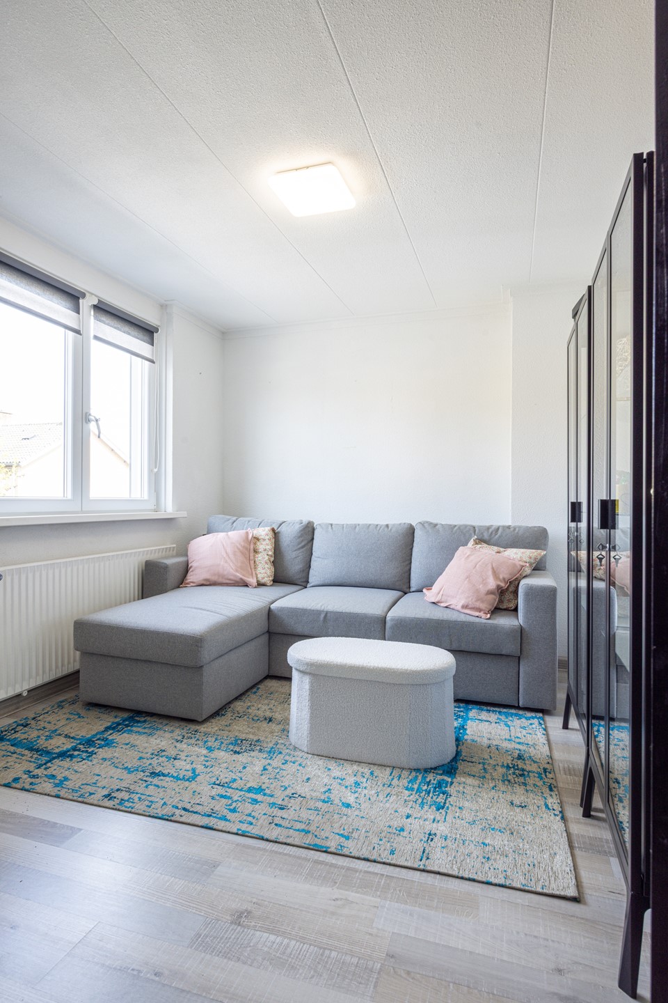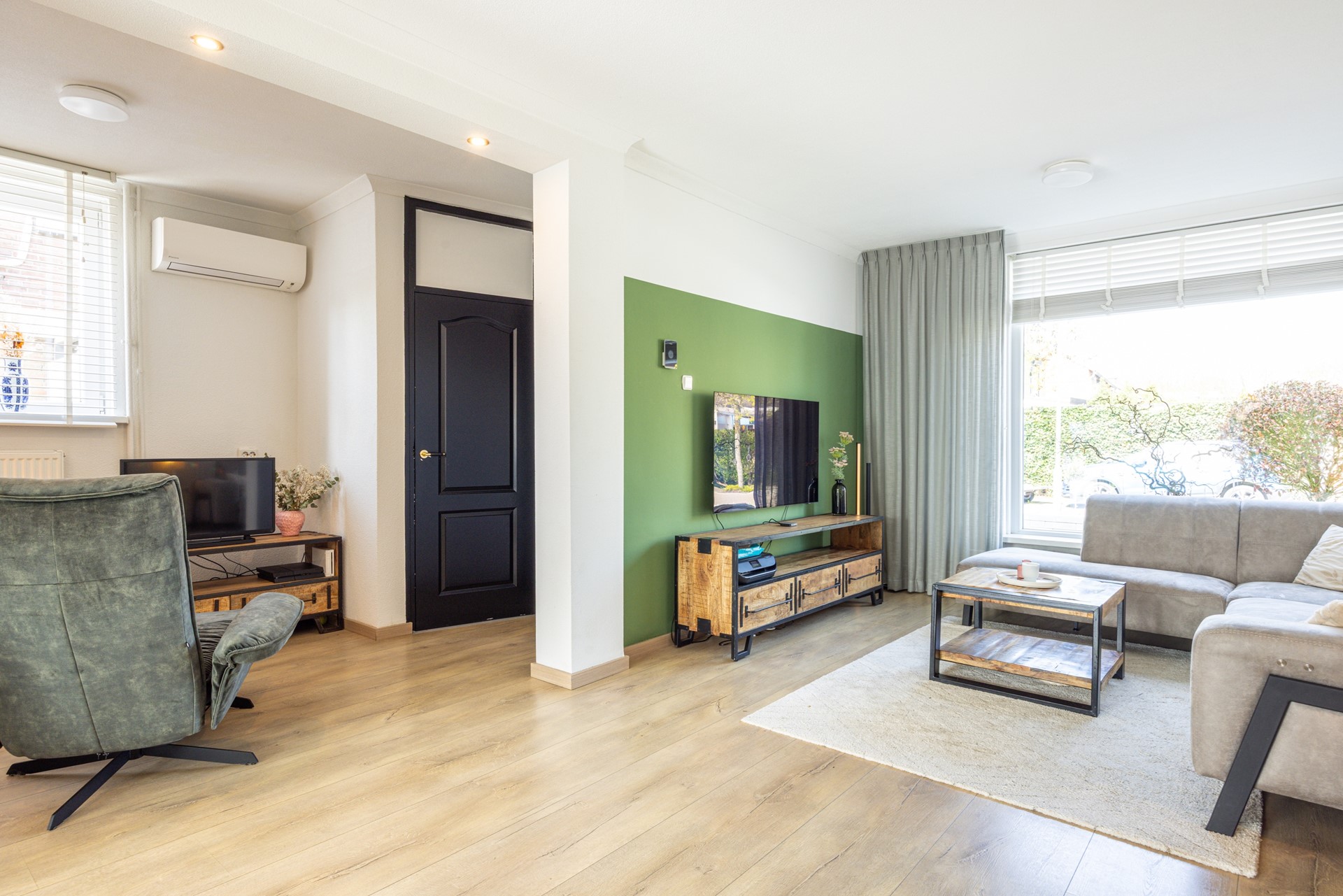 Vanuit de hal kom je in de woonkamer, die ruim is opgezet en zich kenmerkt door een prettige lichtinval dankzij de grote raampartijen aan de voorzijde. Hierdoor voelt de ruimte open en aangenaam aan gedurende de dag. De woonkamer is afgewerkt met een laminaatvloer en voorzien van kunststof kozijnen met HR++ beglazing en een rolluik aan de voorzijde. De indeling biedt voldoende ruimte voor zowel een zit- als eetgedeelte, waardoor de ruimte flexibel in te richten is. De aanwezige airco-installatie zorgt hier voor extra comfort, zowel tijdens warme zomerdagen als in de koudere maanden.