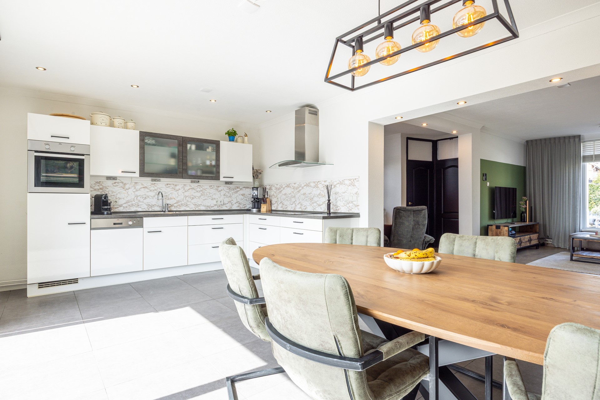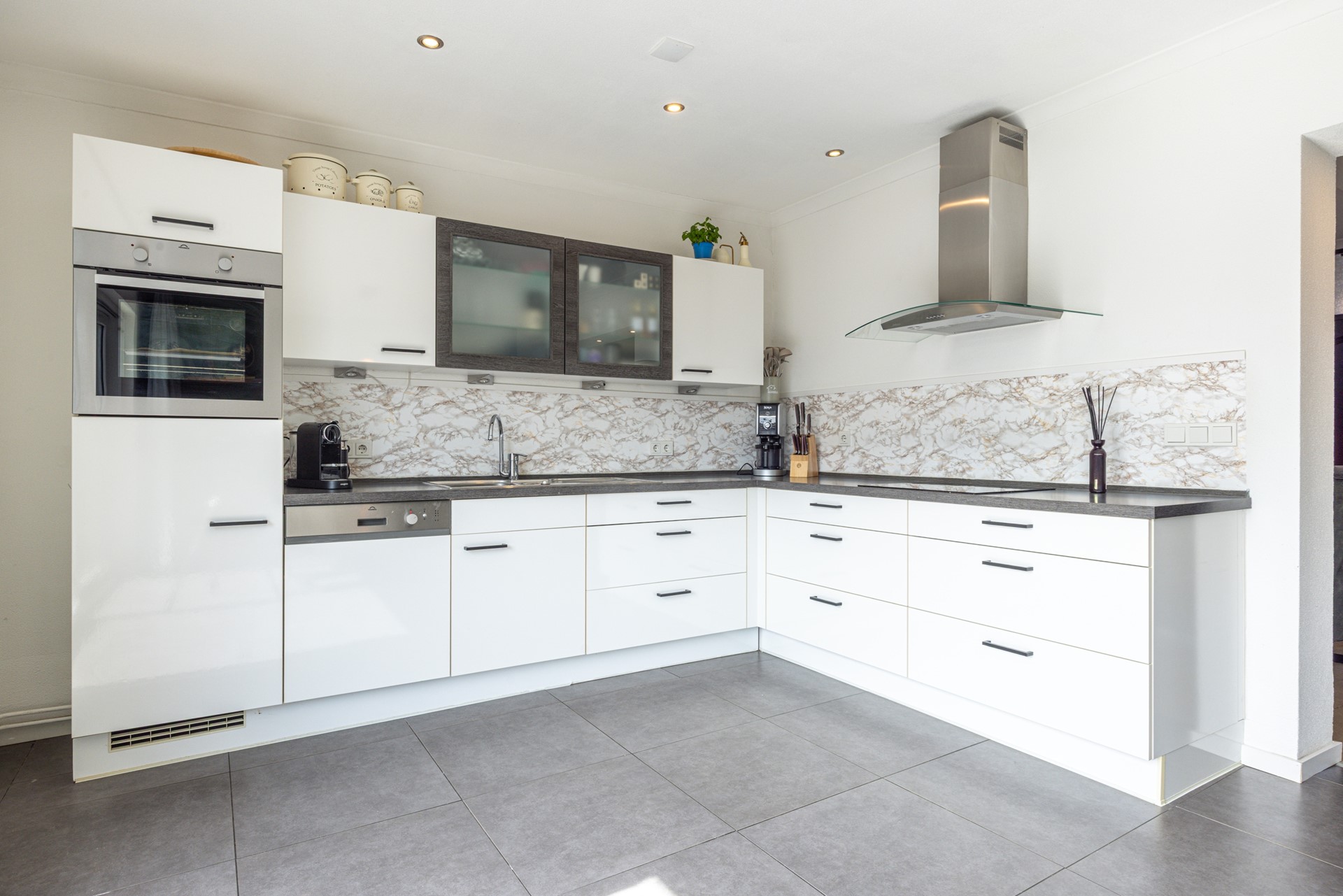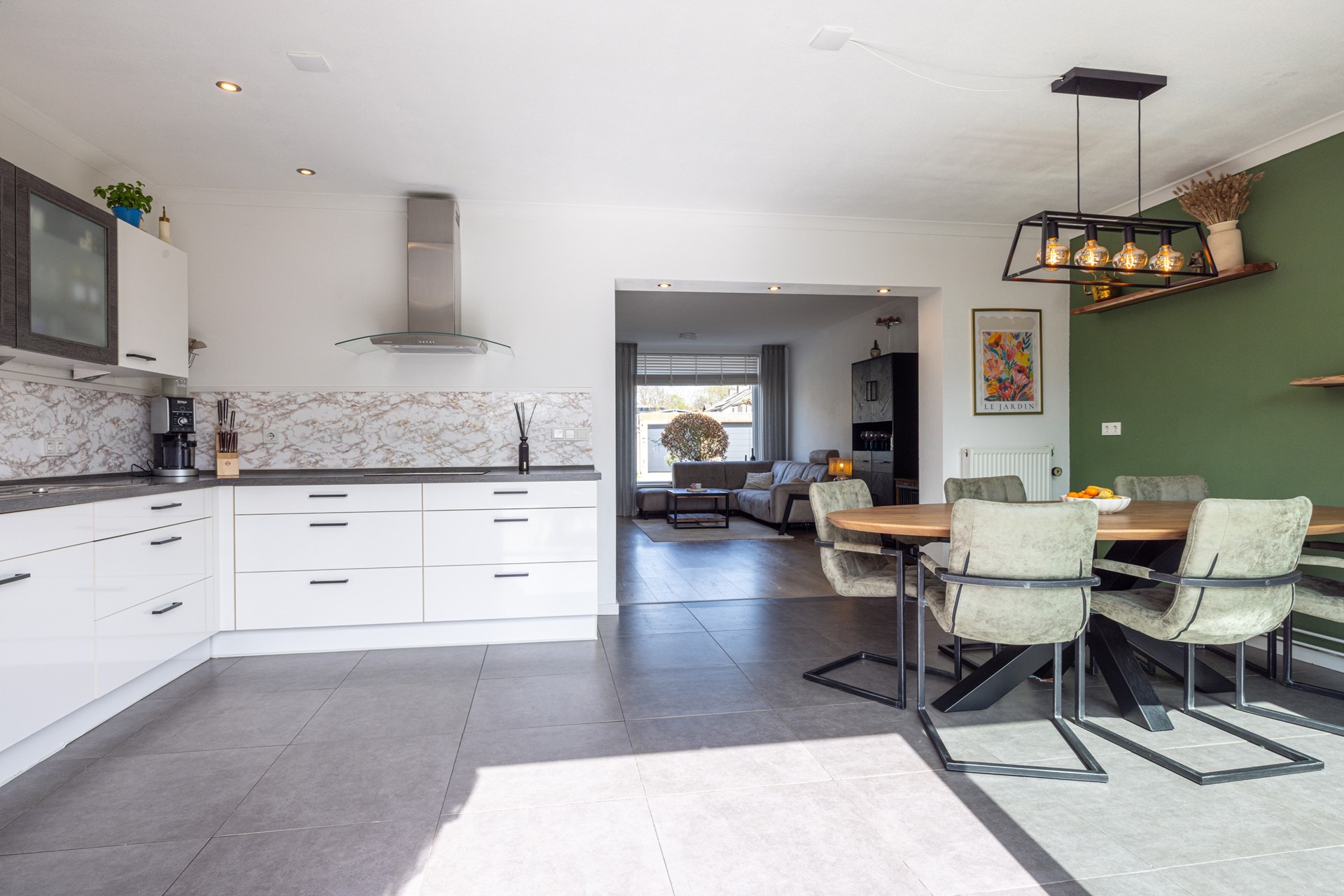 De open keuken staat in directe verbinding met de woonkamer en vormt een ruime leefkeuken met voldoende plaats voor een grote eettafel. Dankzij de grote schuifpui aan de achterzijde staat deze ruimte in open contact met de tuin en valt er veel daglicht binnen. De keuken is afgewerkt met een tegelvloer en biedt volop kast- en werkruimte, waardoor deze zeer geschikt is voor dagelijks gebruik. Daarnaast is de keuken voorzien van diverse inbouwapparatuur, waaronder een 4-pits inductiekookplaat, afzuigkap, heteluchtoven, koelkast en vaatwasser. Ook hier zijn kunststof kozijnen met HR++ beglazing aanwezig, wat bijdraagt aan het wooncomfort. Tevens is er vanuit de keuken de provisiekelder bereikbaar, voorzien van witgoedaansluitingen.