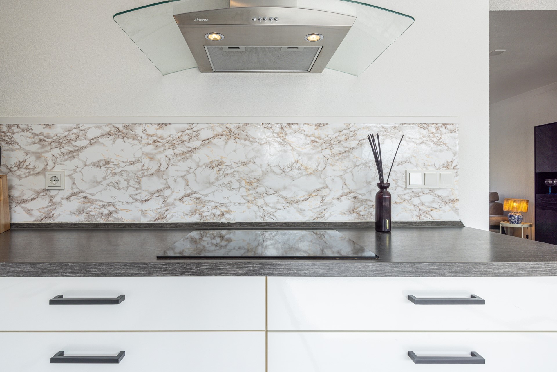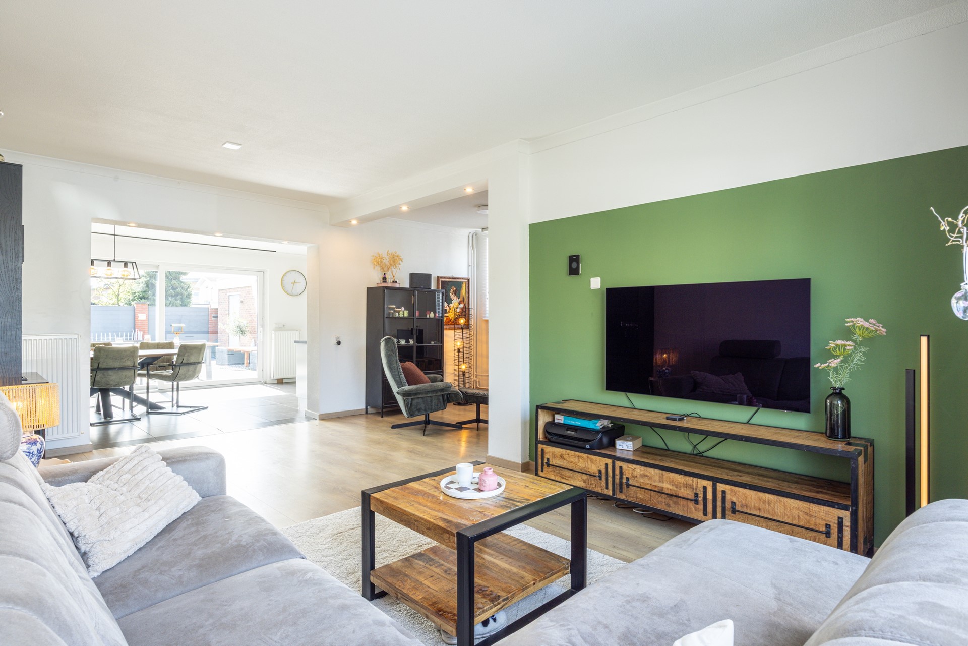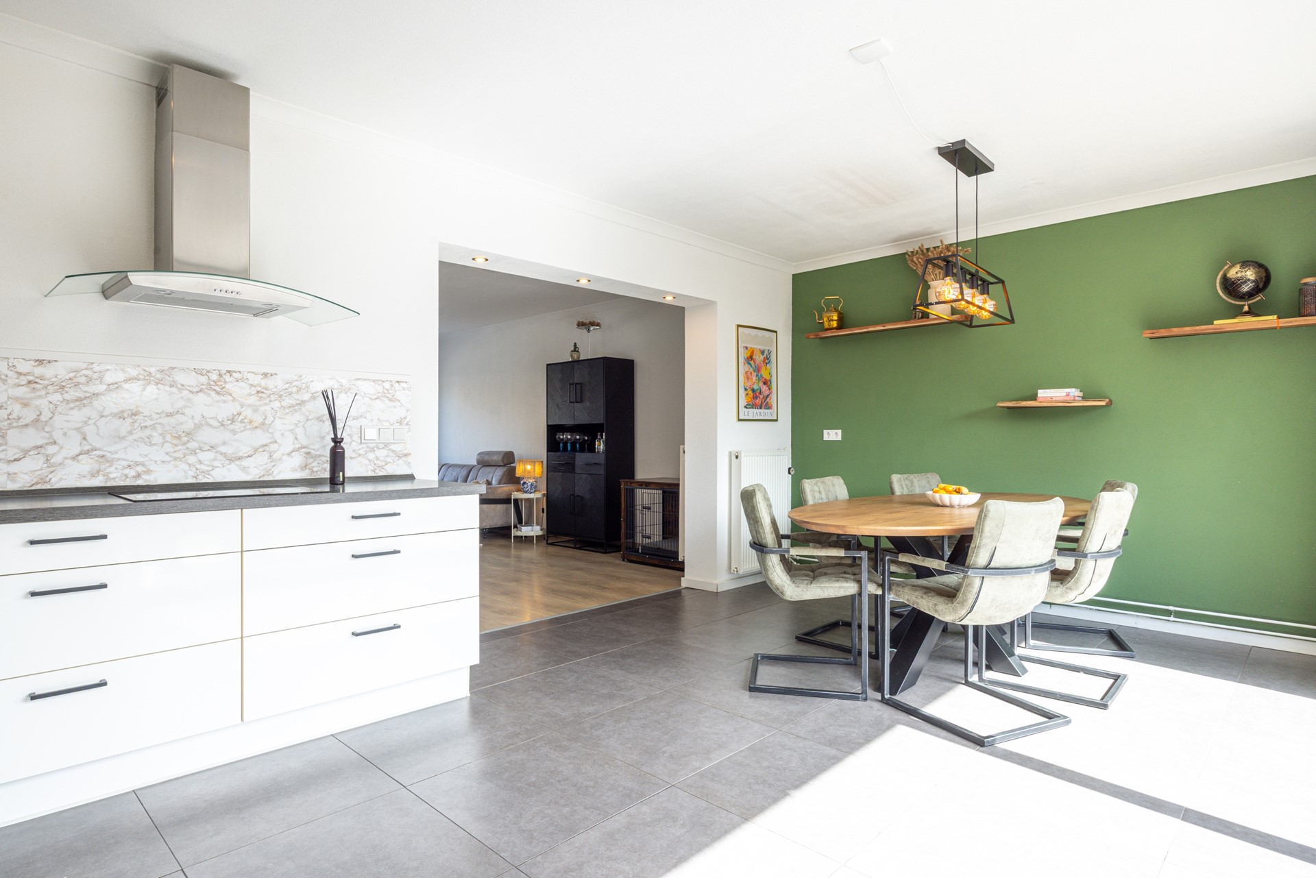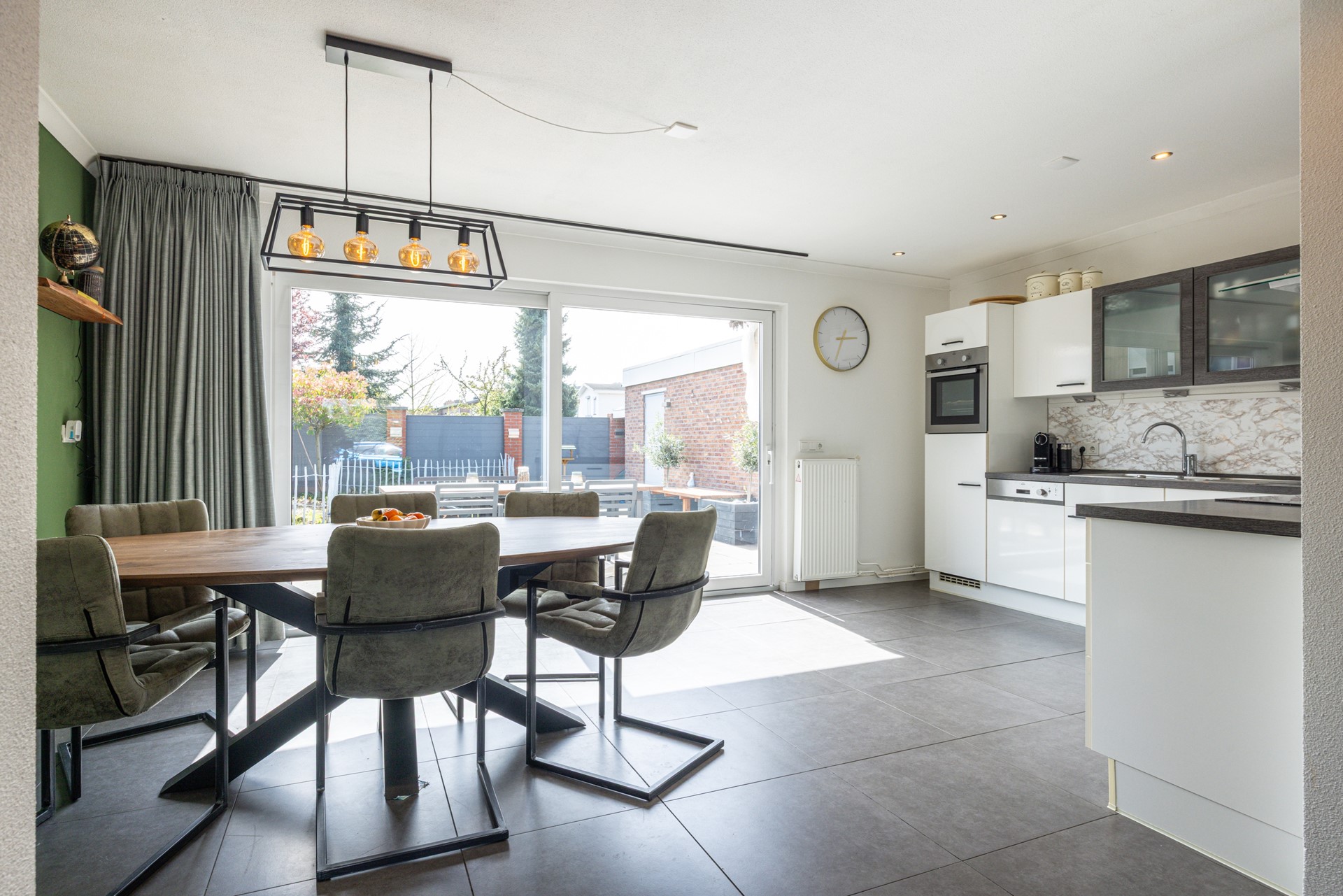 De open keuken staat in directe verbinding met de woonkamer en vormt een ruime leefkeuken met voldoende plaats voor een grote eettafel. Dankzij de grote schuifpui aan de achterzijde staat deze ruimte in open contact met de tuin en valt er veel daglicht binnen. De keuken is afgewerkt met een tegelvloer en biedt volop kast- en werkruimte, waardoor deze zeer geschikt is voor dagelijks gebruik. Daarnaast is de keuken voorzien van diverse inbouwapparatuur, waaronder een 4-pits inductiekookplaat, afzuigkap, heteluchtoven, koelkast en vaatwasser. Ook hier zijn kunststof kozijnen met HR++ beglazing aanwezig, wat bijdraagt aan het wooncomfort. Tevens is er vanuit de keuken de provisiekelder bereikbaar, voorzien van witgoedaansluitingen.