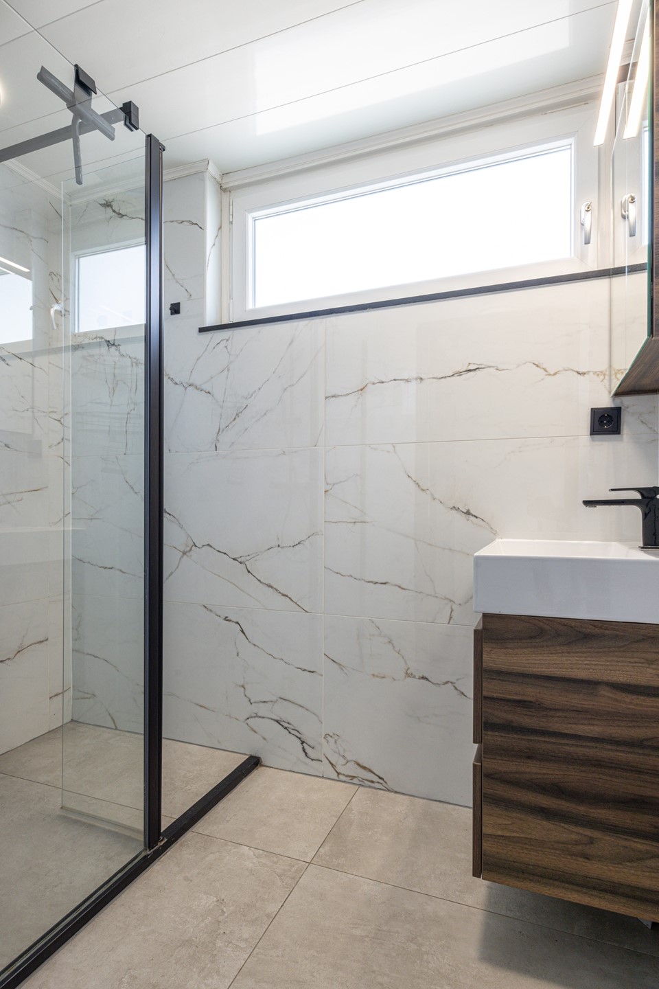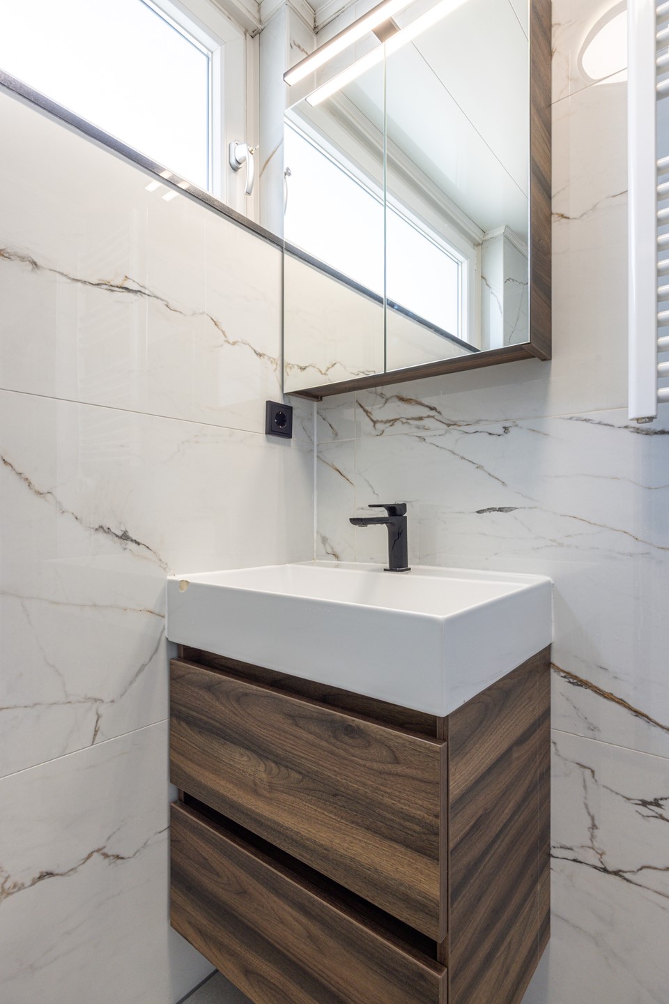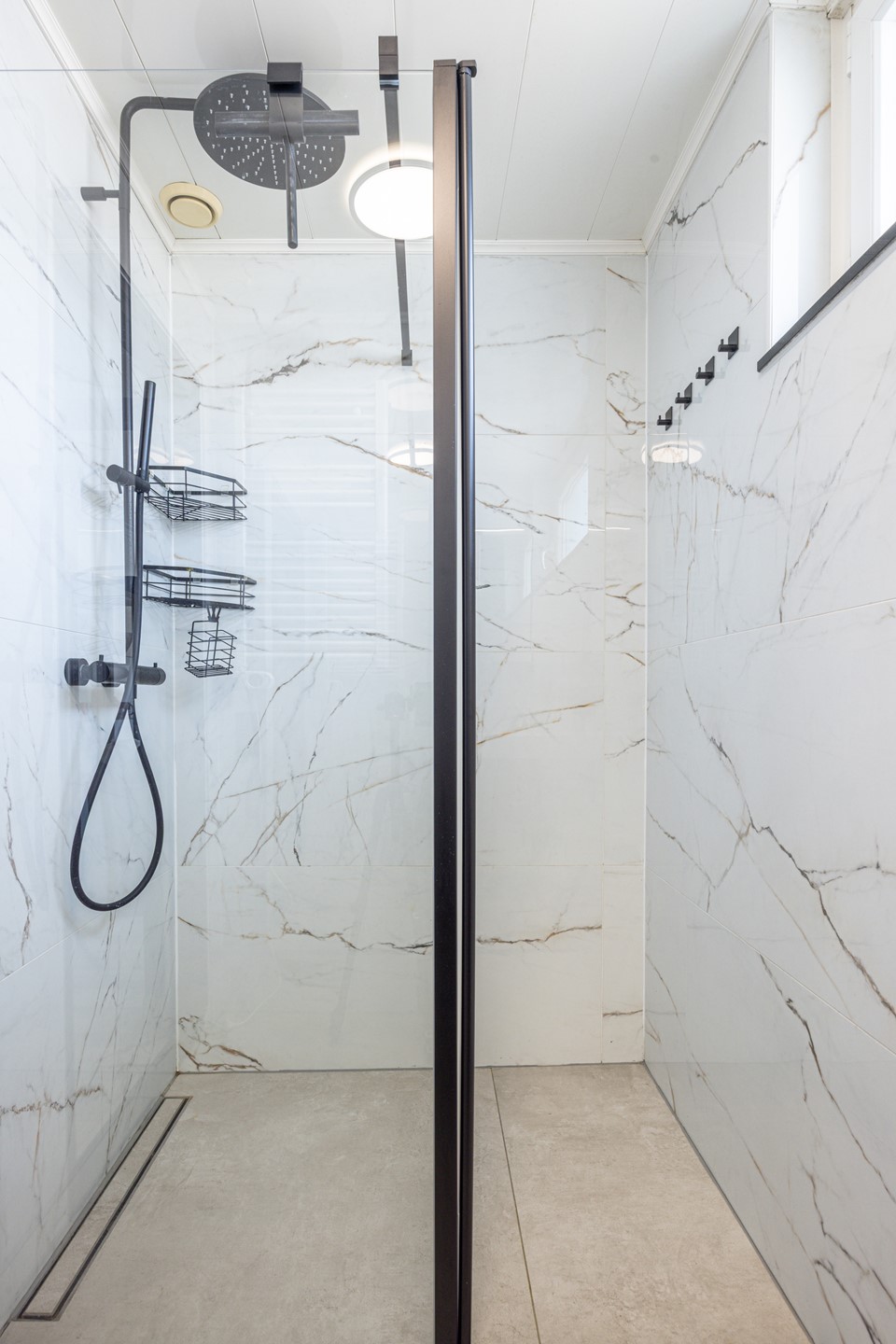 De badkamer is volledig betegeld en verzorgd uitgevoerd. Deze is ingericht met een inloopdouche met glazen douchewand, een badkamermeubel met wastafel en spiegel, en een designradiator. Het geheel vormt een functionele en nette ruimte voor dagelijks gebruik.