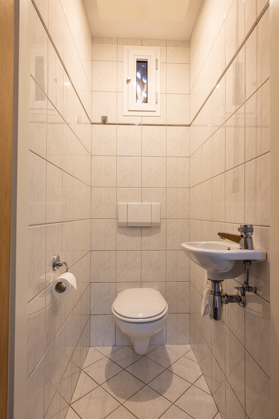 Via de voortuin met oprit bereik je de entree van de woning en de inpandige garage met openslaande deuren. Bij binnenkomst kom je in de ontvangsthal, afgewerkt met een grindvloer en met een garderobe. Hier bevinden zich de meterkast en het volledig betegelde, zwevende toilet met fonteintje. Dankzij het raam met kunststof kozijn is er natuurlijke ventilatie en prettig daglicht aanwezig.