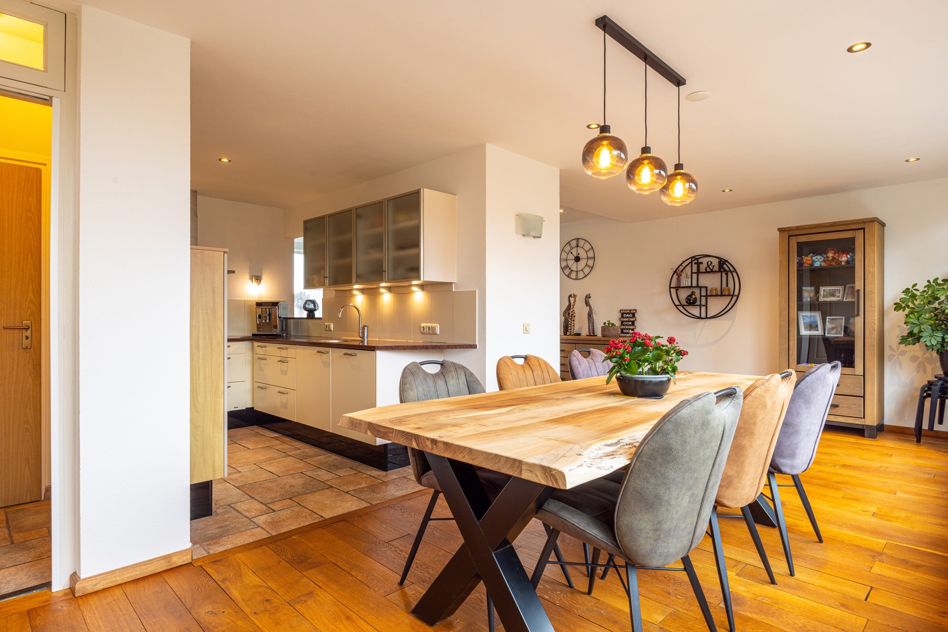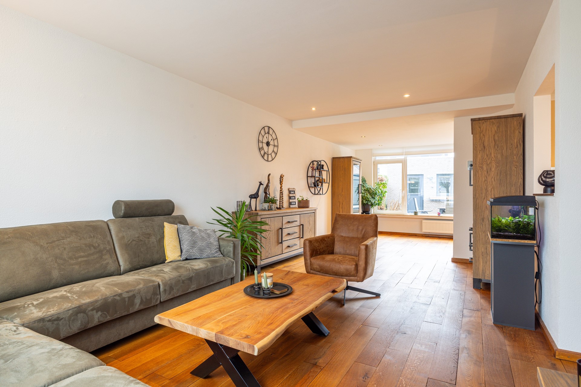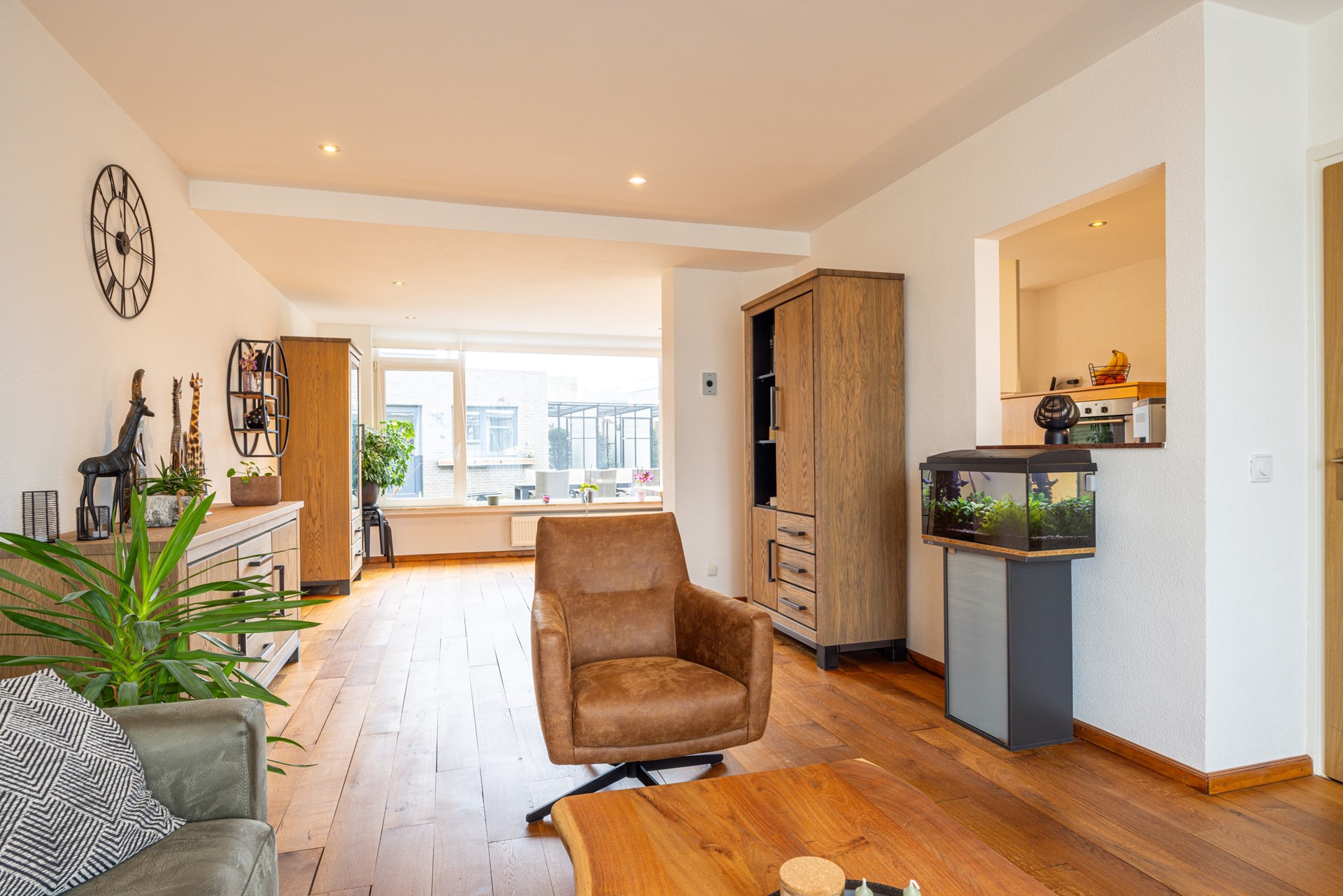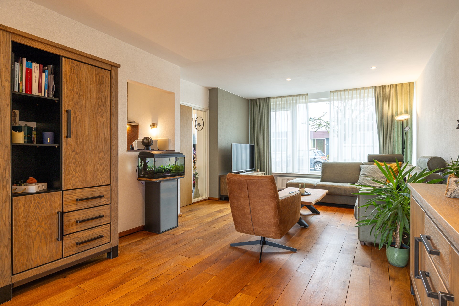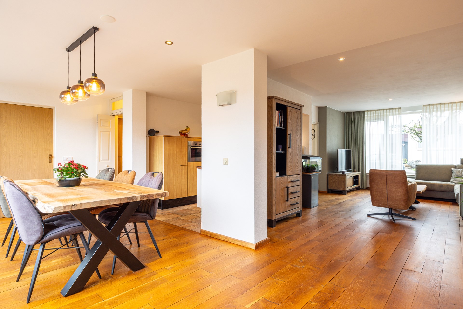 De woonkamer is ruim van opzet en geniet van veel lichtinval door de grote raampartijen met kunststof kozijnen, voorzien van dubbel en HR+ glas. De eikenhouten vloer, eind 2021 behandeld, geeft de ruimte een warme en verzorgde uitstraling. De woonkamer loopt vloeiend over in de eetkamer, waardoor er een open en ruimtelijk geheel ontstaat.