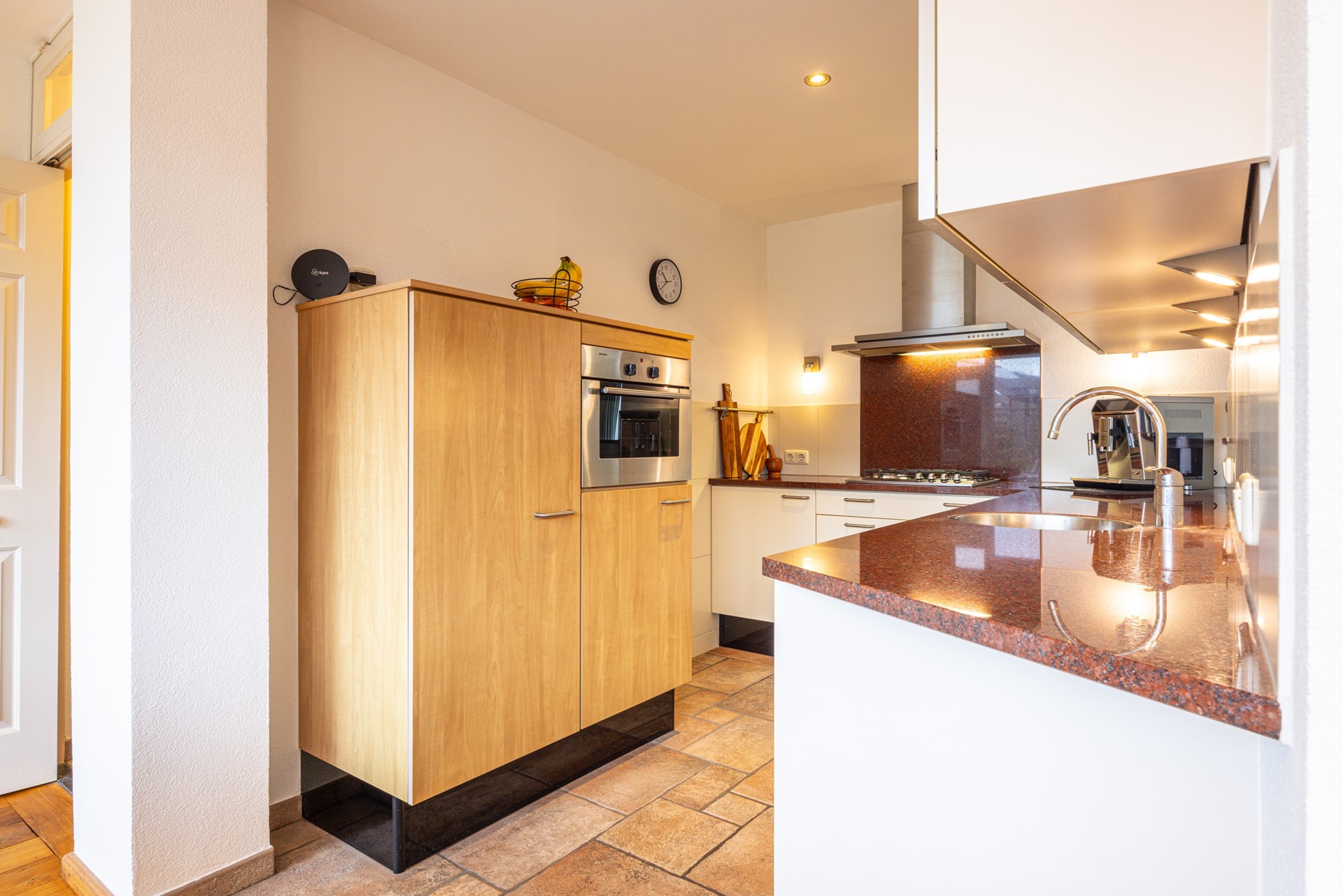 De halfopen keuken sluit praktisch aan op de eetkamer en beschikt over voldoende kast- en werkruimte. De keuken is voorzien van een 4-pits gasfornuis, afzuigkap, heteluchtoven, koelkast en vaatwasser. Een functionele en overzichtelijke ruimte waar koken prettig en efficiënt verloopt.