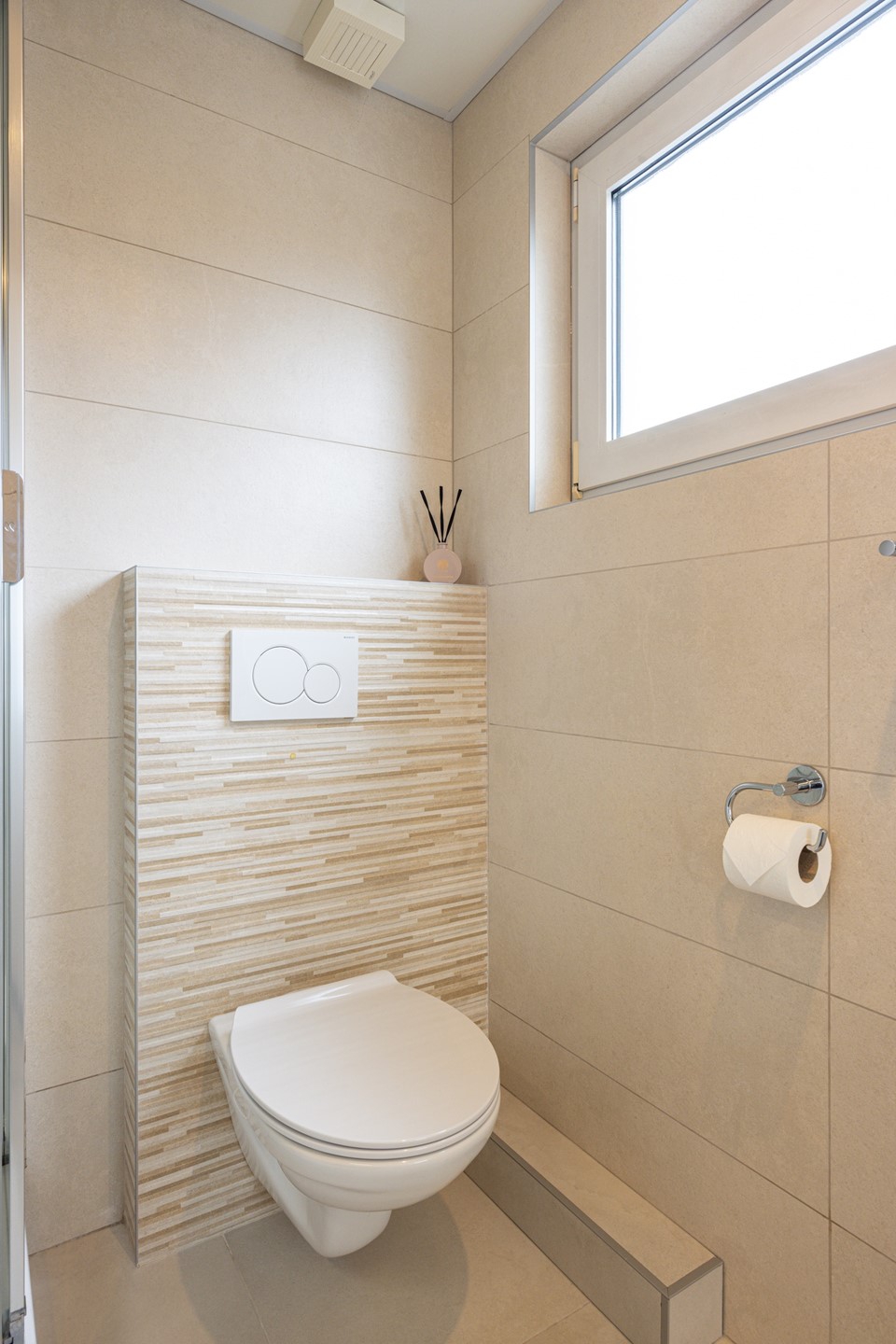 De badkamer is in 2022 vernieuwd en modern afgewerkt. De ruimte is volledig betegeld en functioneel ingedeeld. Je vindt hier een douchecabine, een zwevend toilet, een wastafelmeubel met wasbak en een spiegelkast. Het kunststof kozijn met dubbelglas zorgt voor natuurlijke lichtinval en ventilatiemogelijkheden. Daarnaast is er een infraroodpaneel in het plafond aanwezig, wat bijdraagt aan extra comfort. Een eigentijdse badkamer waar afwerking en gebruiksgemak samenkomen.