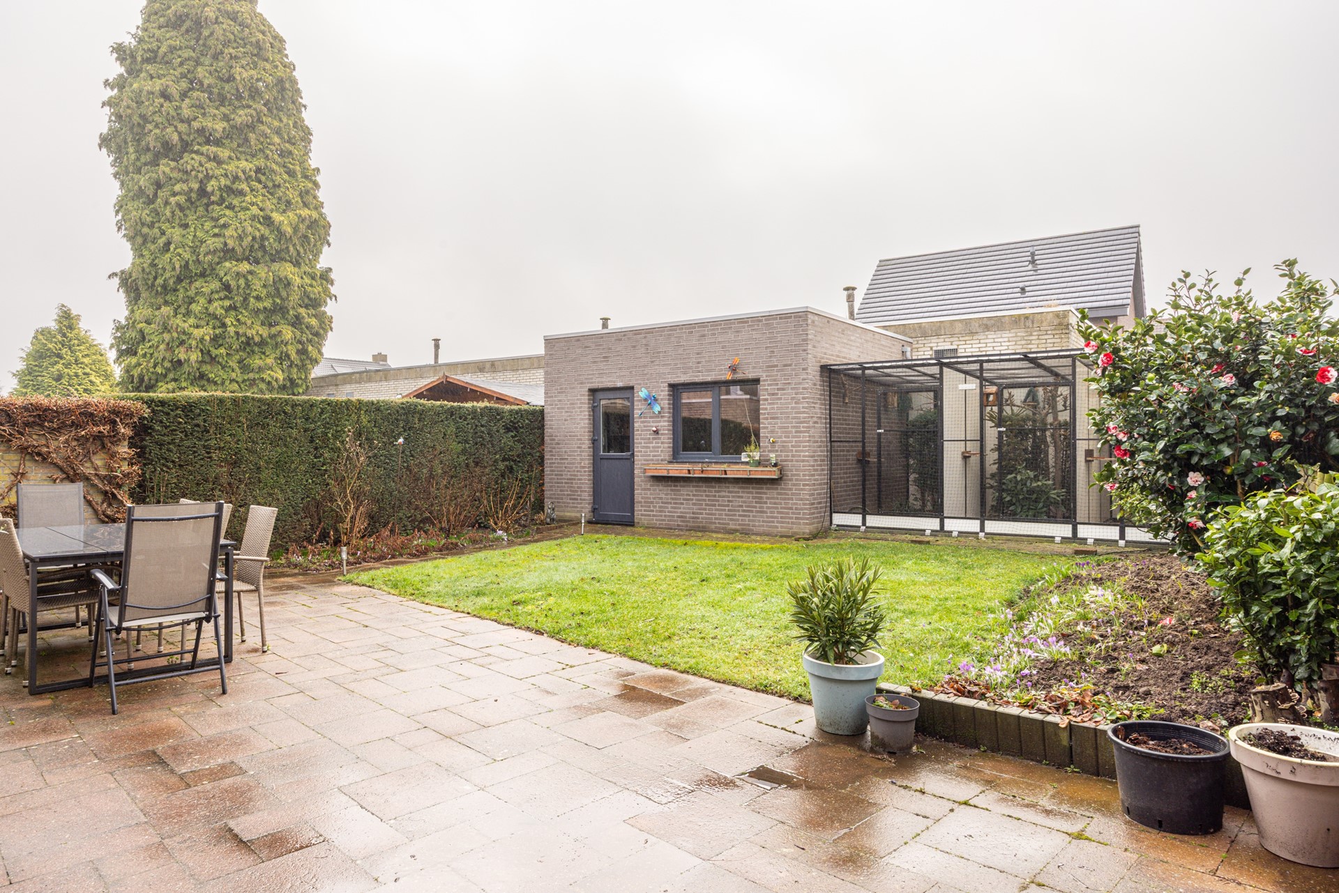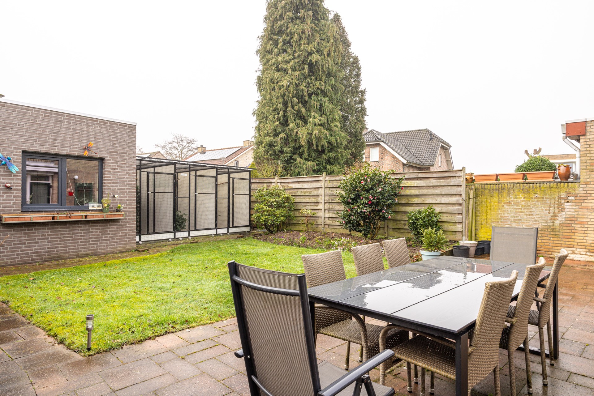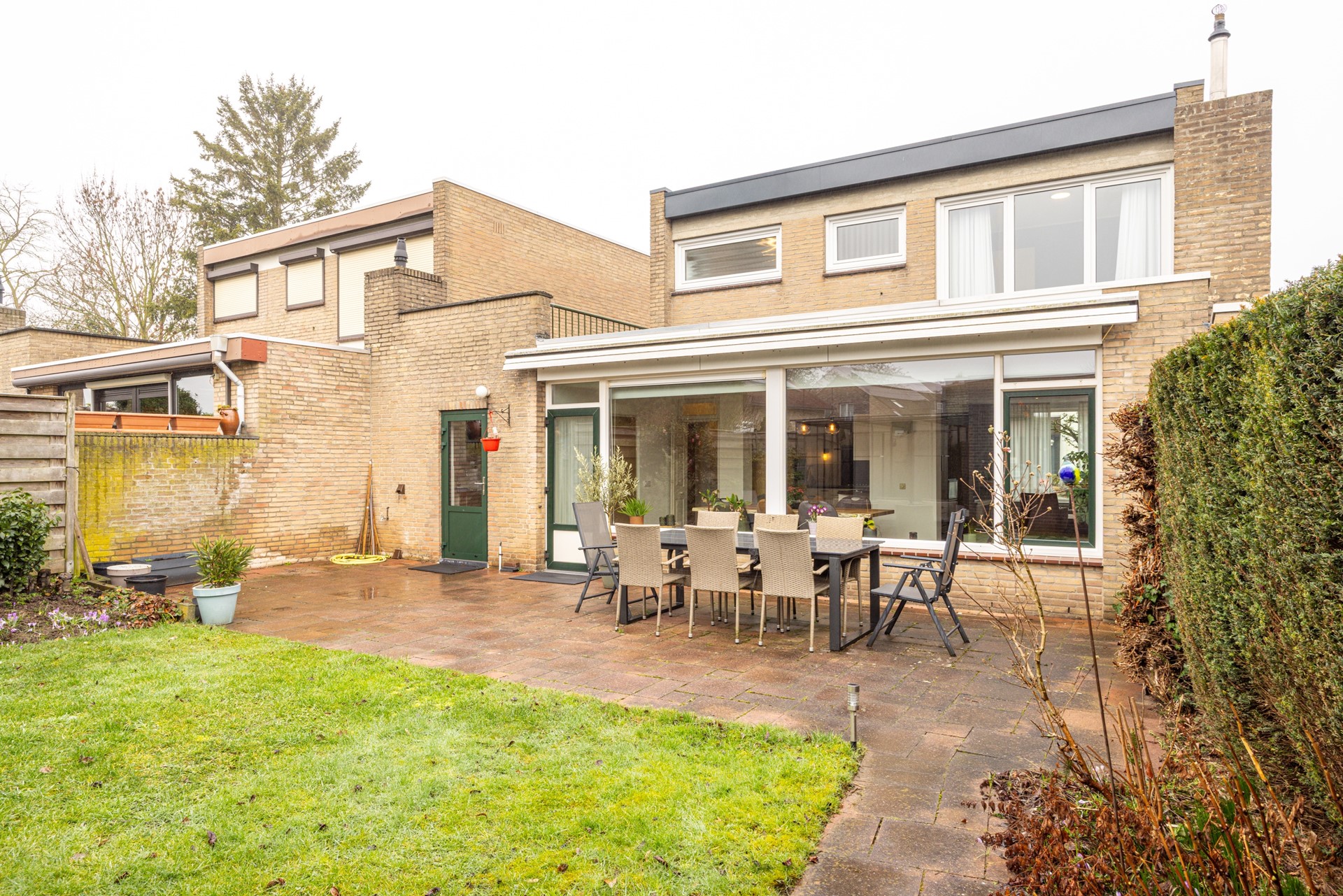 De achtertuin is verzorgd aangelegd en biedt een prettige combinatie van bestrating en gazon. Dankzij de indeling is er voldoende ruimte voor een terras en groen, waardoor je hier zowel kunt ontspannen als gezellig buiten kunt dineren. De tuin biedt veel privacy en vormt een fijne verlenging van de leefruimte.
