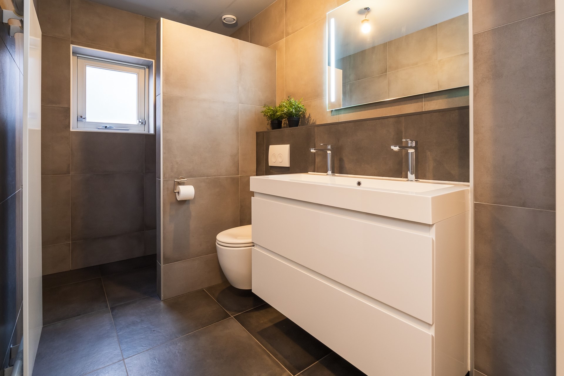 De badkamer van 2021 voelt modern en luxe aan. Laat de drukte van de dag van je afglijden in de inloopdouche met regen- en handdouche. Verfris jezelf aan het duo-wastafelmeubel met spiegel inclusief ledverlichting en spiegelverwarming. Het wandcloset maakt het sanitair compleet. De radiator, de mechanische ventilatie en het raam dragen tenslotte bij aan een comfortabele temperatuur en een frisse atmosfeer.