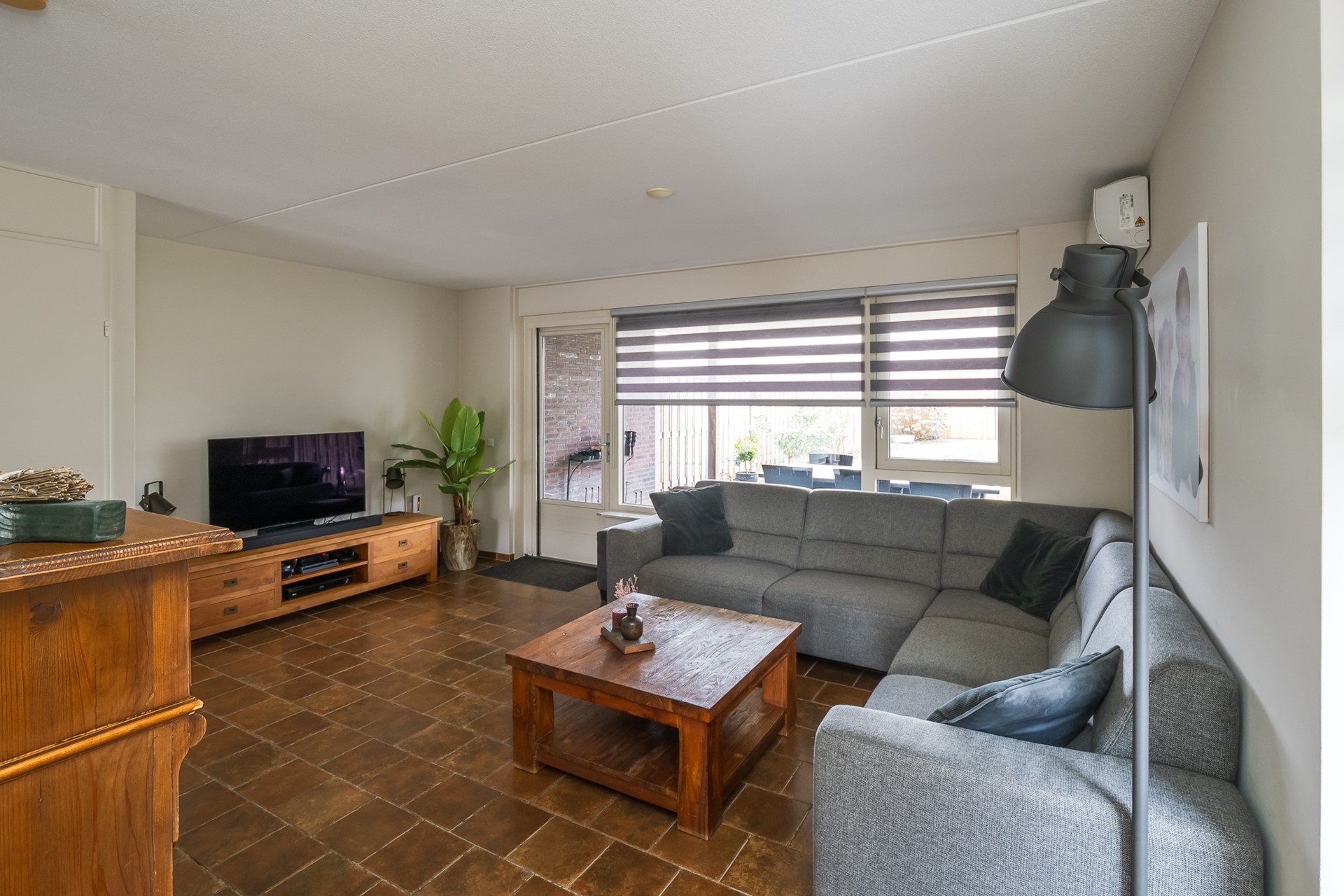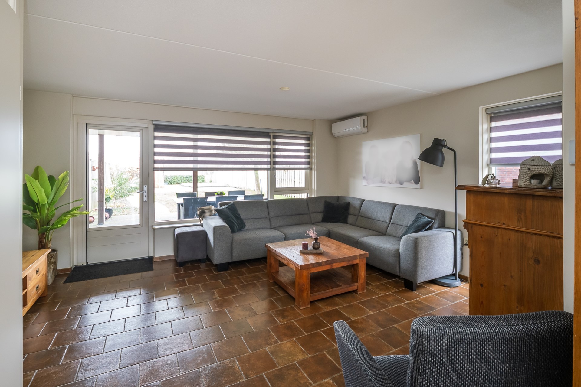 Het is écht thuiskomen in de royale living, een plek om te ontspannen of gezellige momenten met familie of vrienden te beleven. De grote raampartij en de openslaande deur zorgen voor een heerlijke verbondenheid met de aan het huis gebouwde veranda en de tuin. Het langwerpige raam in de zijgevel zorgt voor extra lichtinval. De airconditioner kan koelen en verwarmen en voorziet de volledige begane grond van een prettig binnenklimaat.