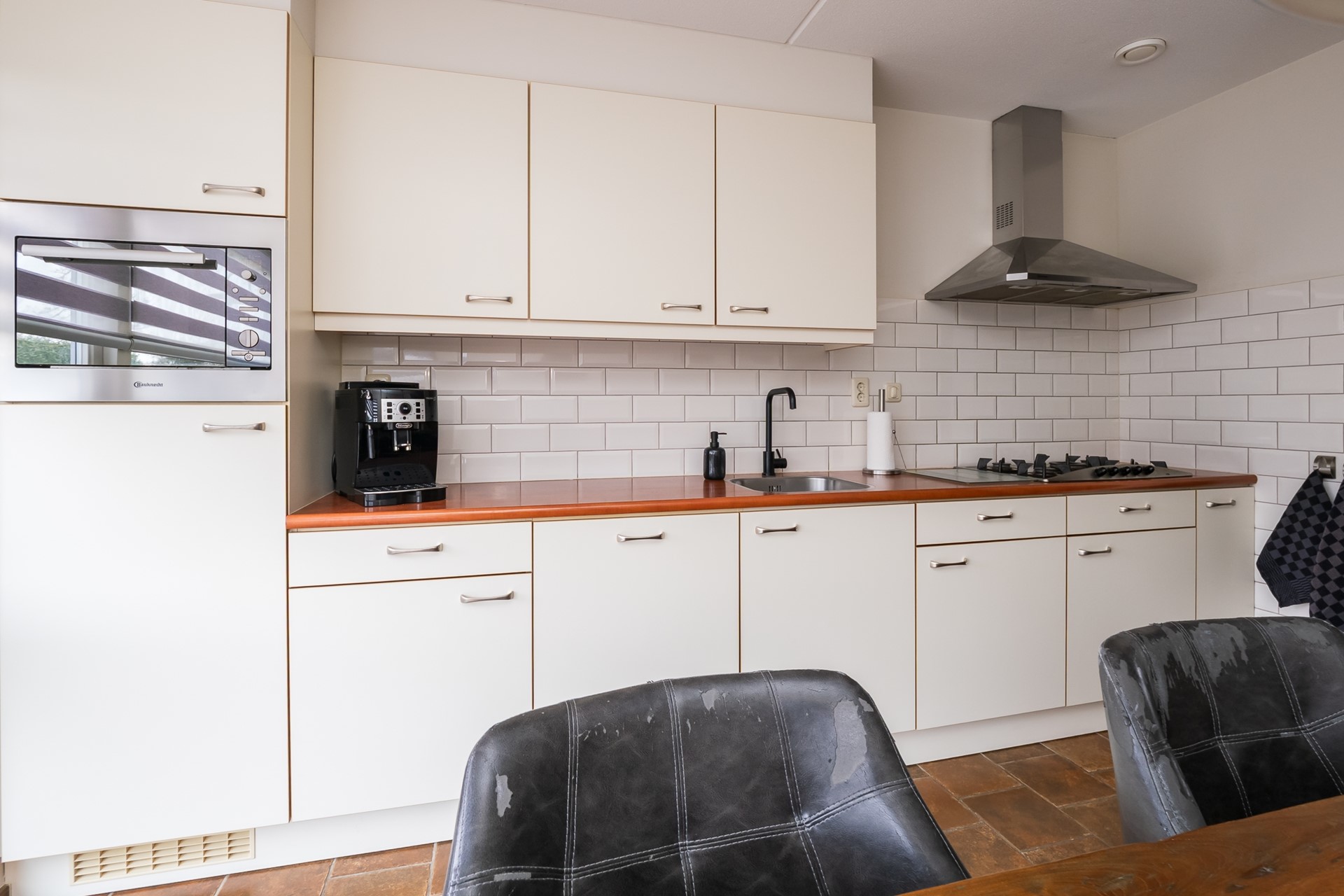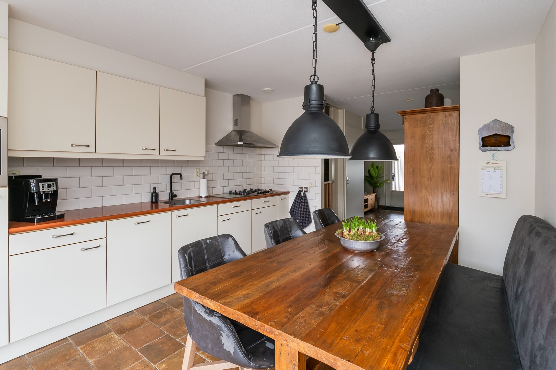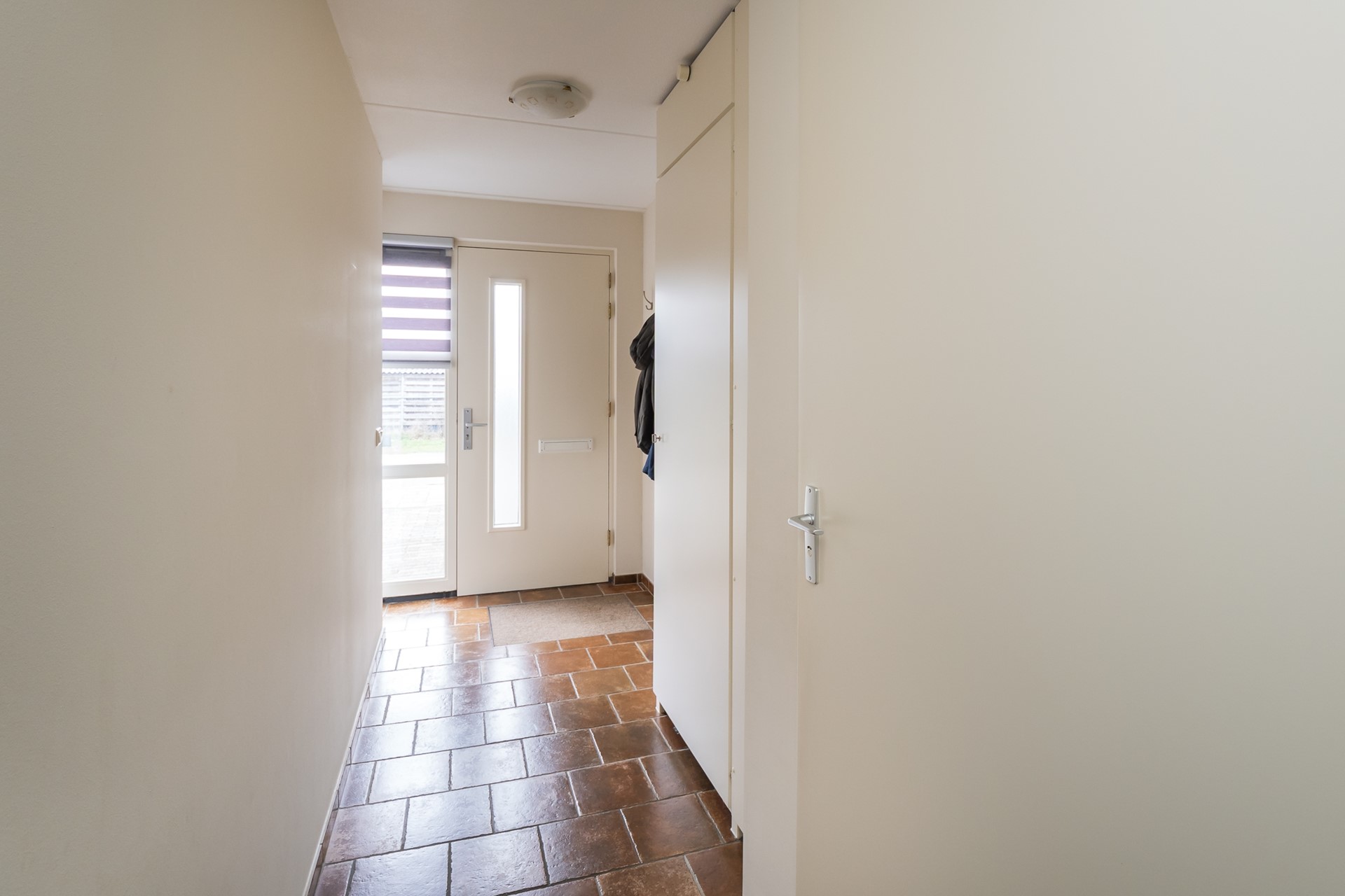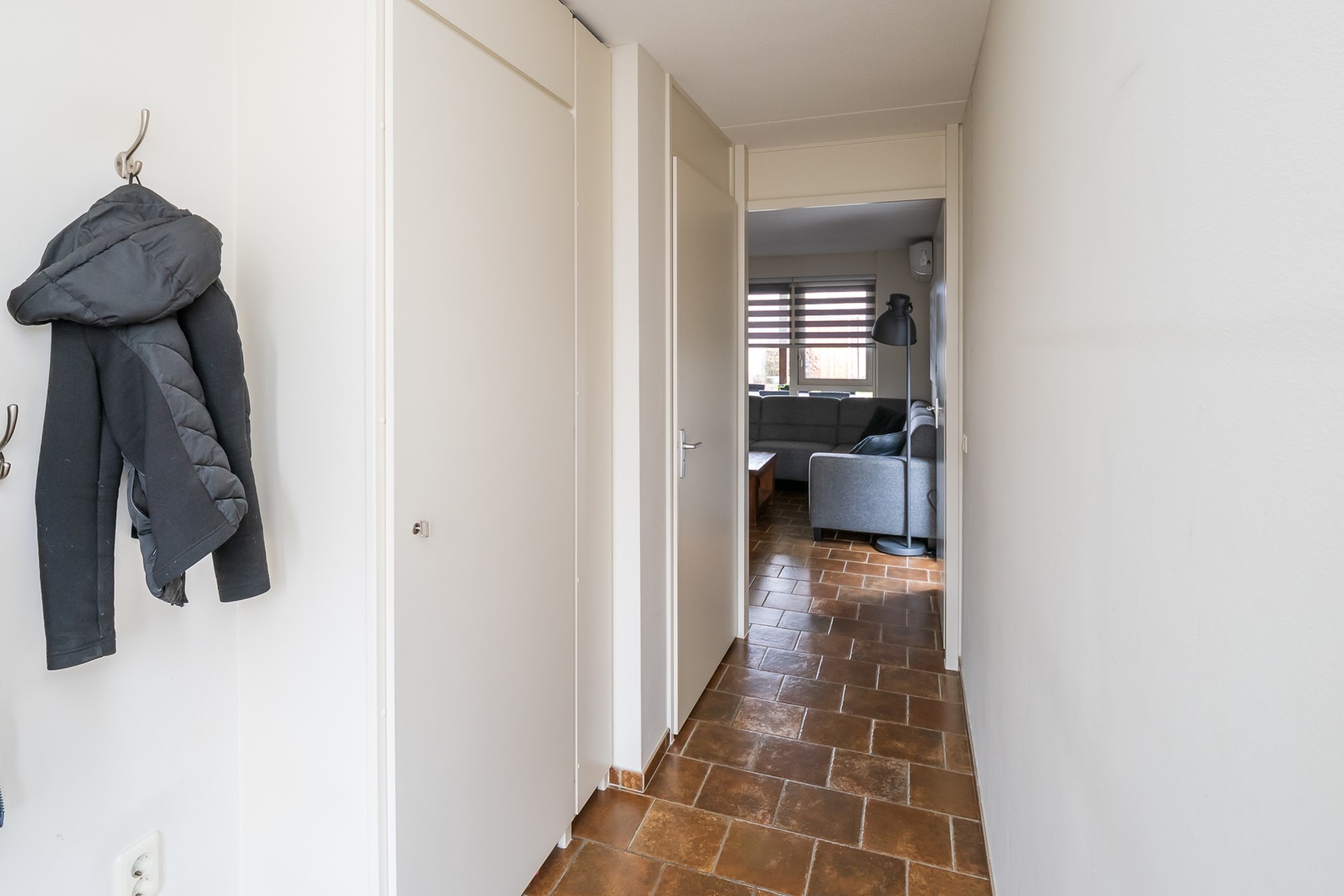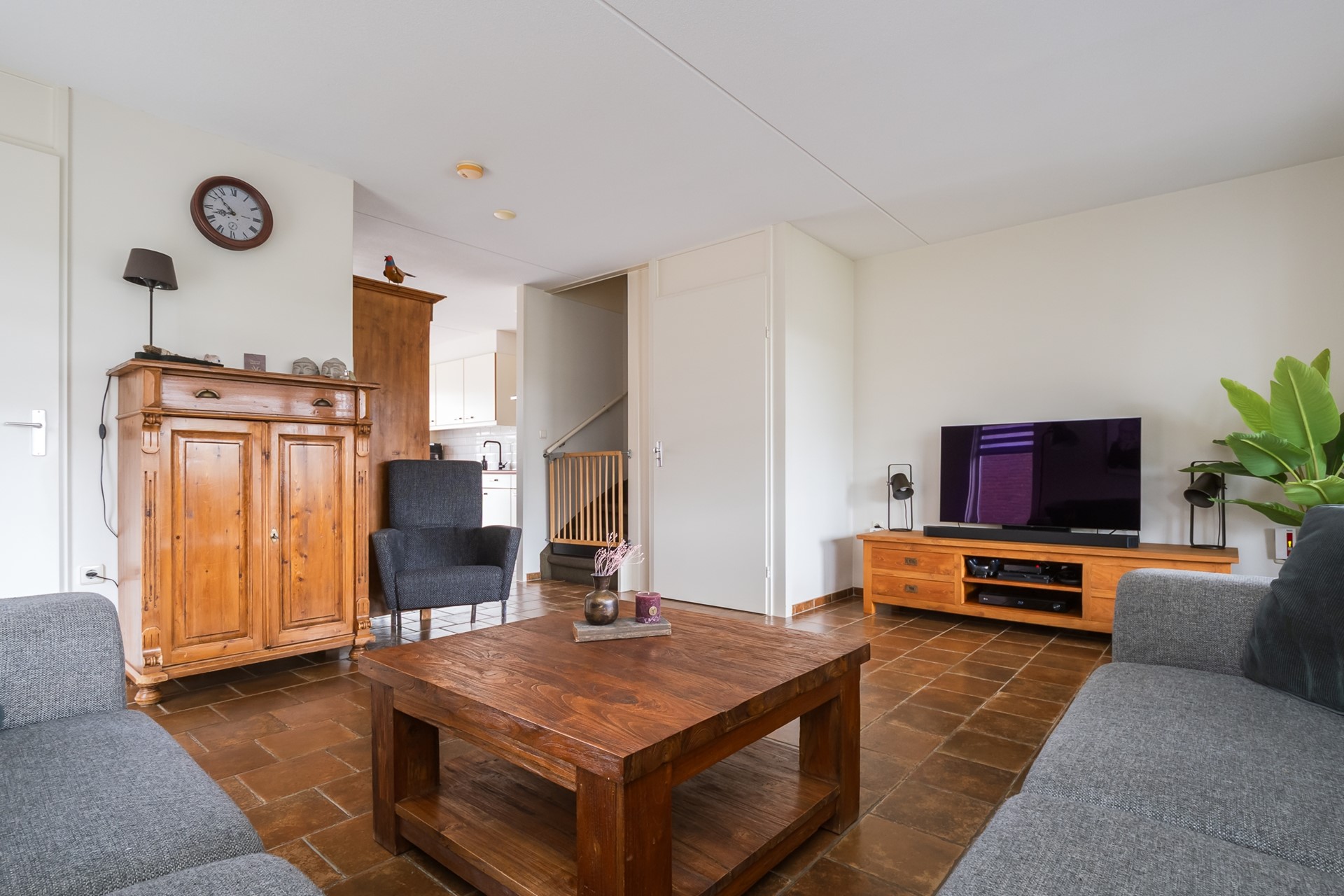 Bij binnenkomst voel je direct de aangename sfeer van de woning. De hal met langwerpige ramen en duo-rolgordijnen laat een speels lichtspel toe en geeft een warm welkom. De garderobe, de meterkast en de toiletruimte met fontein en mechanische ventilatie zorgen voor praktische gemakken. Op de hele begane grond ligt comfortabele vloerverwarming onder boeren plavuizen. Samen met de strak gestucte wanden en het gespoten plafond ontstaat een rustige, sfeervolle eenheid met een hoog wooncomfort. Liever een andere look? Dan is het ook prima mogelijk pvc over deze vloer aan te brengen.
