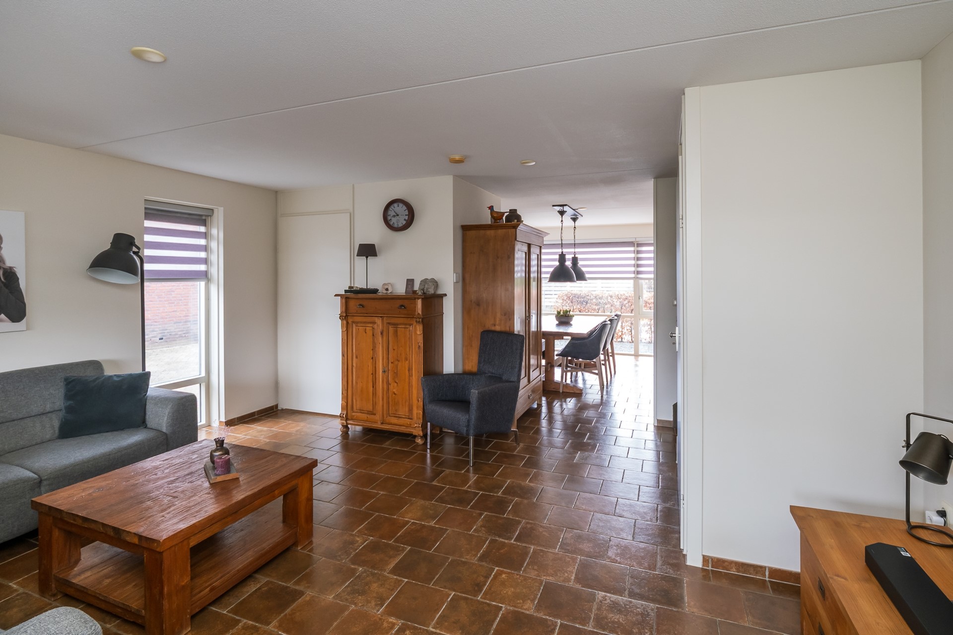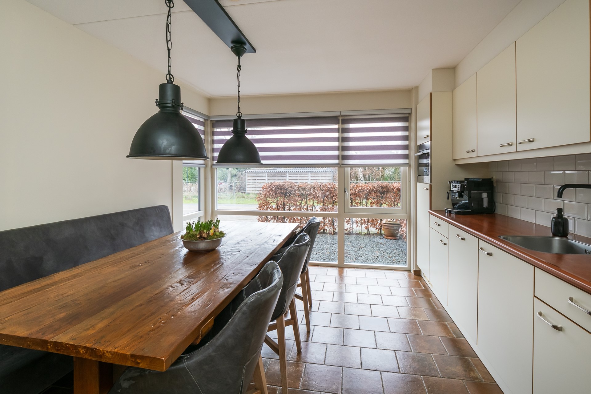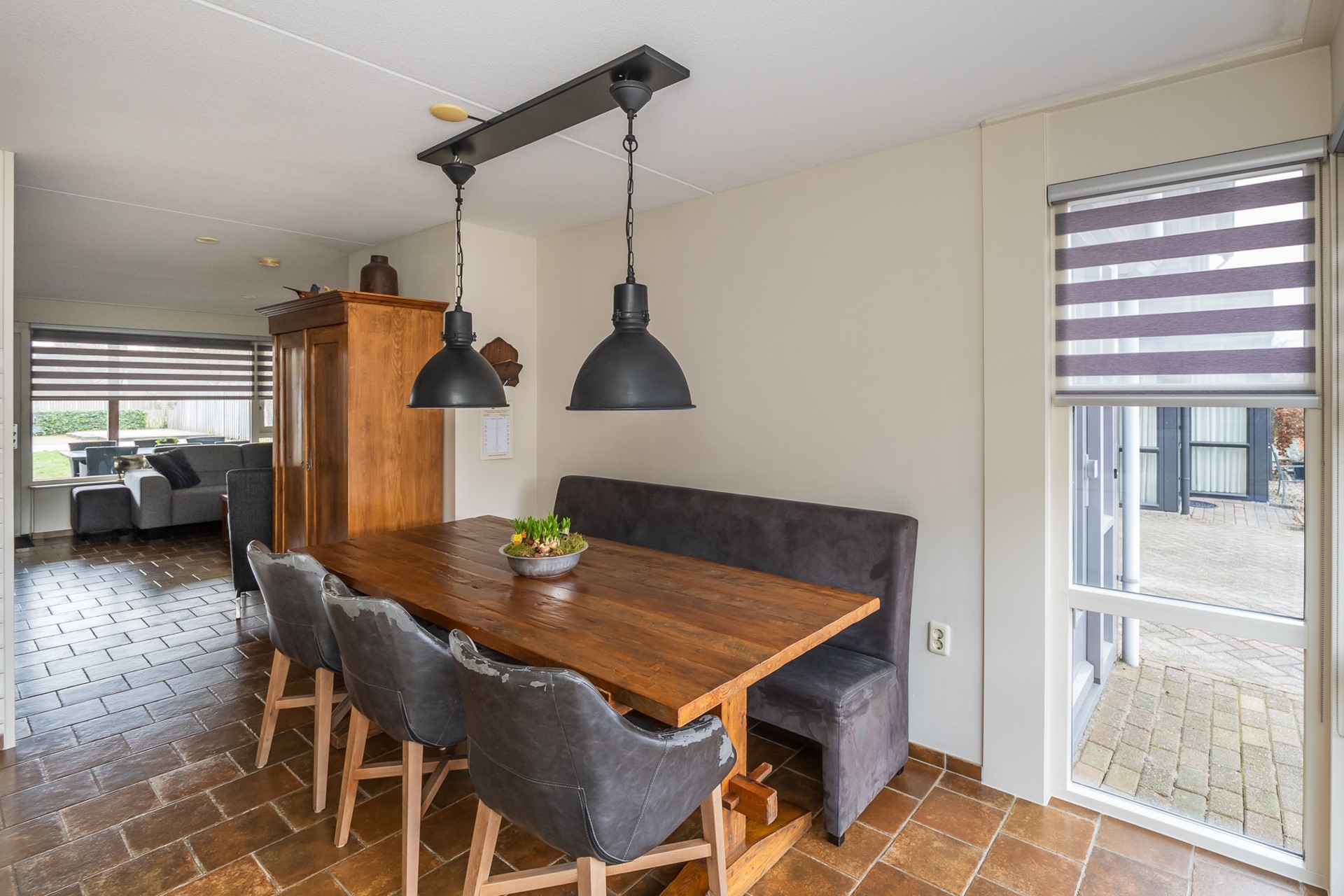 De ramen van deze living en woonkeuken zijn uitgevoerd met duo-rolgordijnen, waarmee je het daglicht en de privacy kunt doseren.