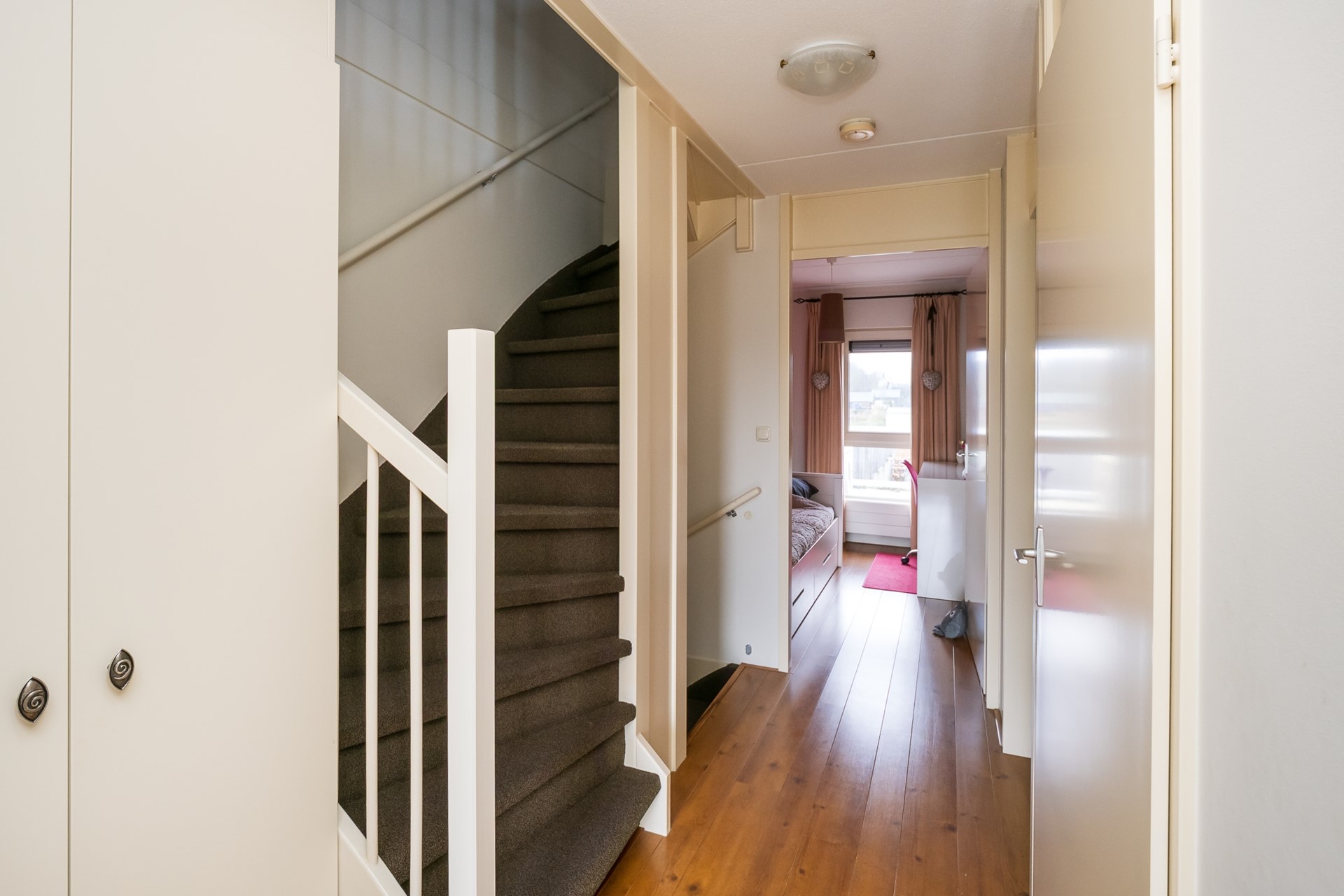 Vanuit de living brengt de gestoffeerde trapopgang je naar de overloop van de 1ste verdieping. Deze slaapverdieping ademt comfort en privacy. De frisse en strakke afwerking valt direct op. Het laminaat op de vloer in combinatie met de glad gestucte wanden en plafonds vormt een elegante en rustige basis. Vanaf de overloop heb je toegang tot drie magnifieke slaapkamers, een moderne badkamer en een praktische vaste kast.