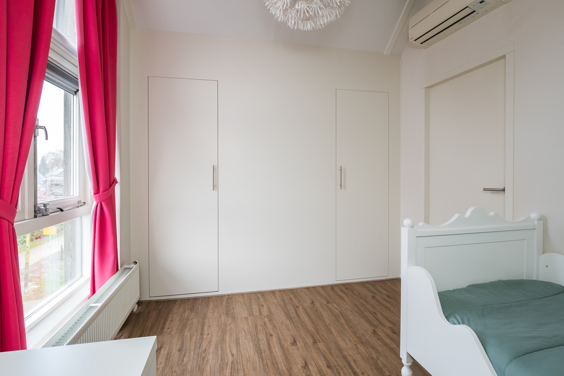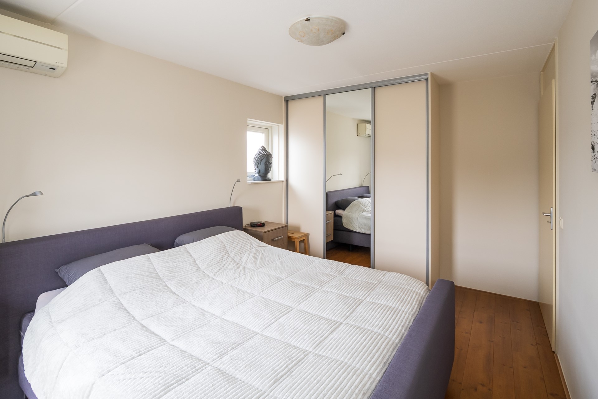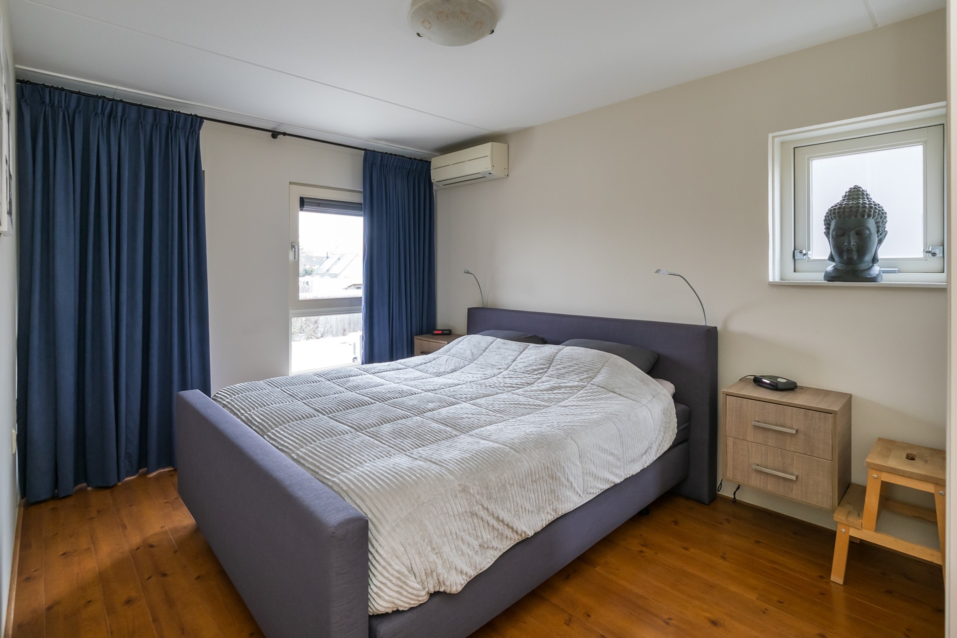 De royale masterbedroom aan de tuinzijde is er zo één waar je vanzelf tot rust komt. Wakker worden met uitzicht over het achtergelegen weiland voelt elke dag als buiten wonen. De vaste schuifkastenwand biedt ruimte voor een uitgebreide garderobe. Dankzij de airconditioner, die kan koelen en verwarmen, geniet je hier - en op de hele slaapverdieping - het hele jaar door van een aangenaam binnenklimaat.