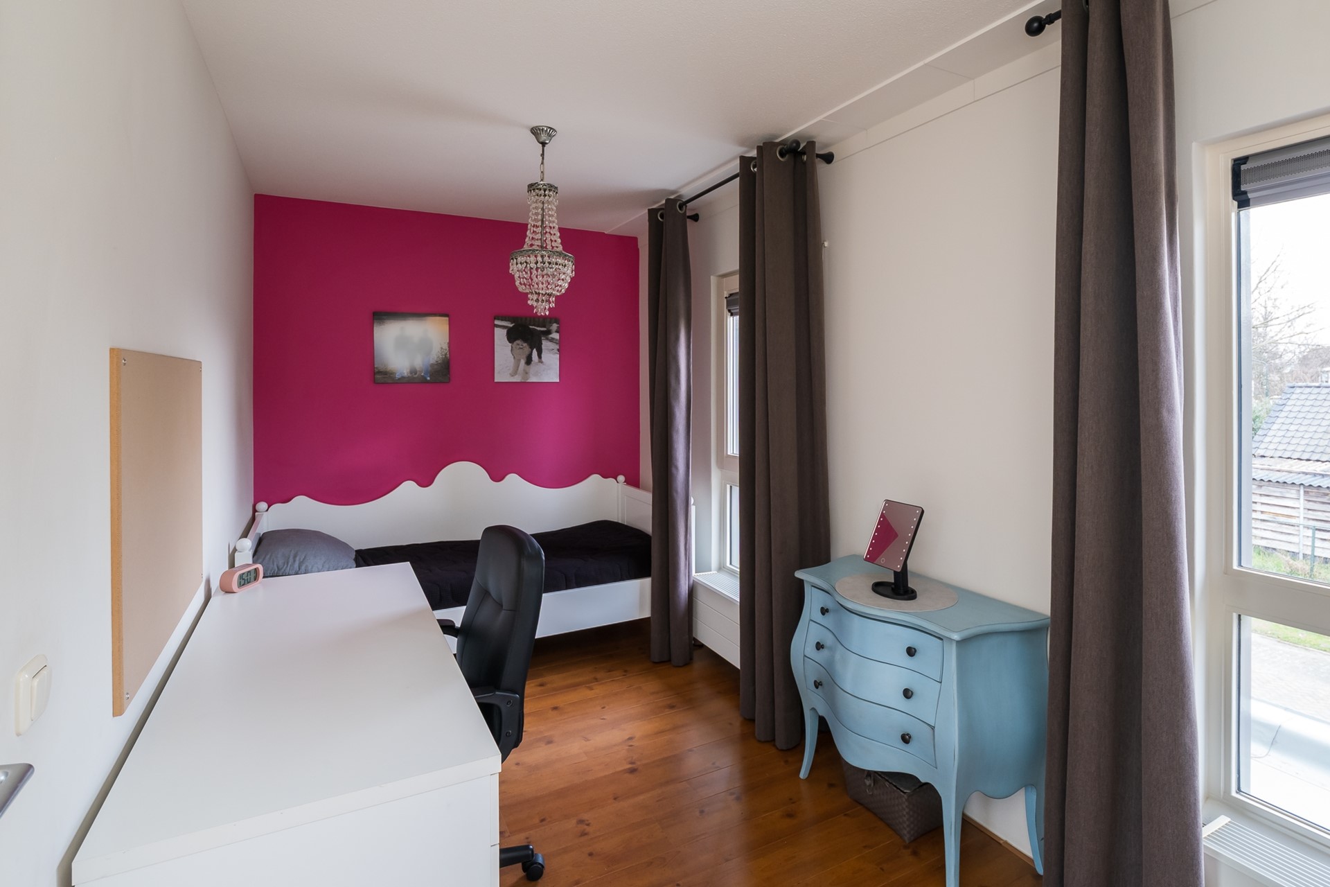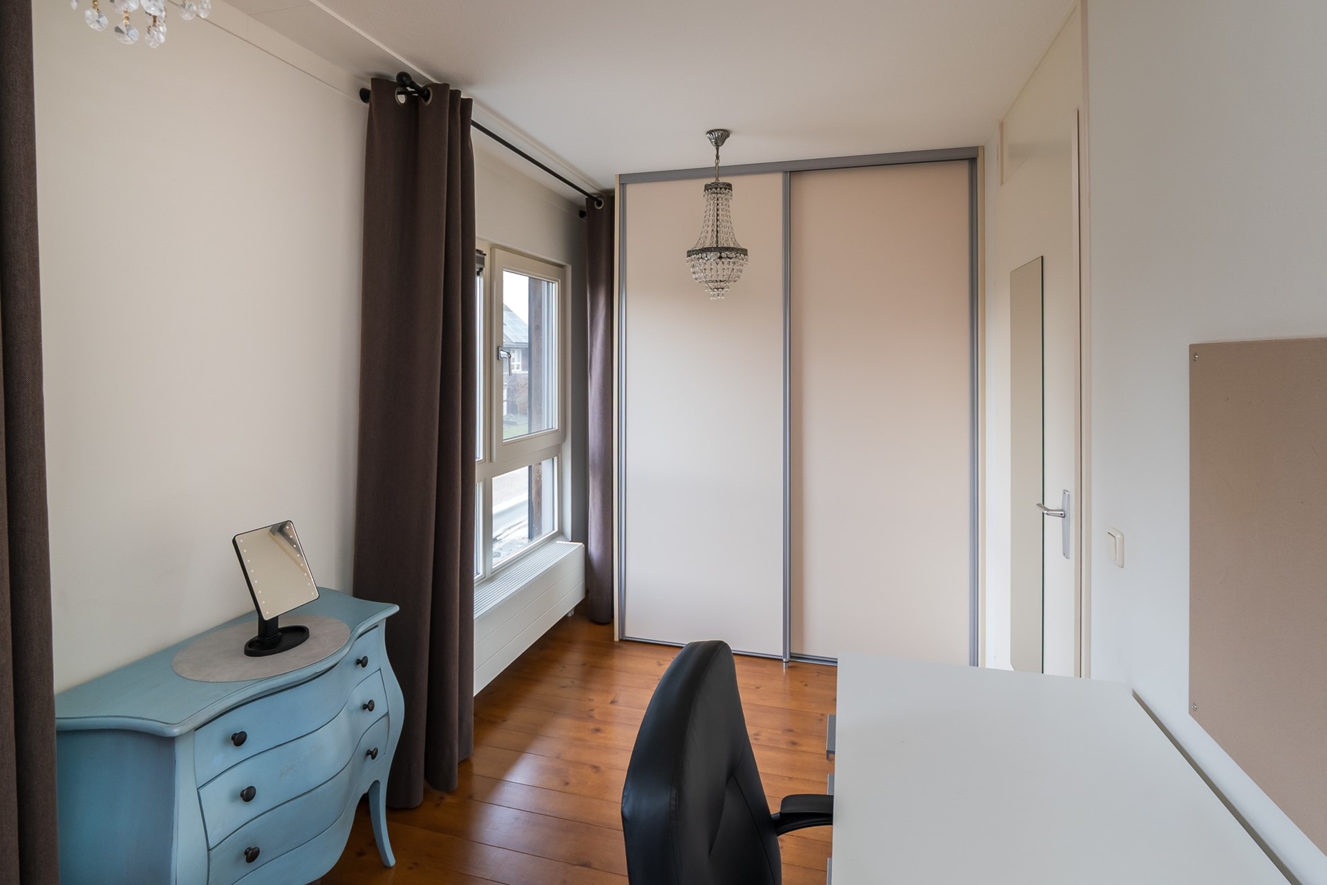 De tweede slaapkamer ligt aan de voorzijde is eveneens verrassend ruim. Ook deze kamer profiteert van de aanwezigheid van een vaste schuifkastenwand. Grote ramen zorgen voor veel licht en geven een prettige kijk op de straat.