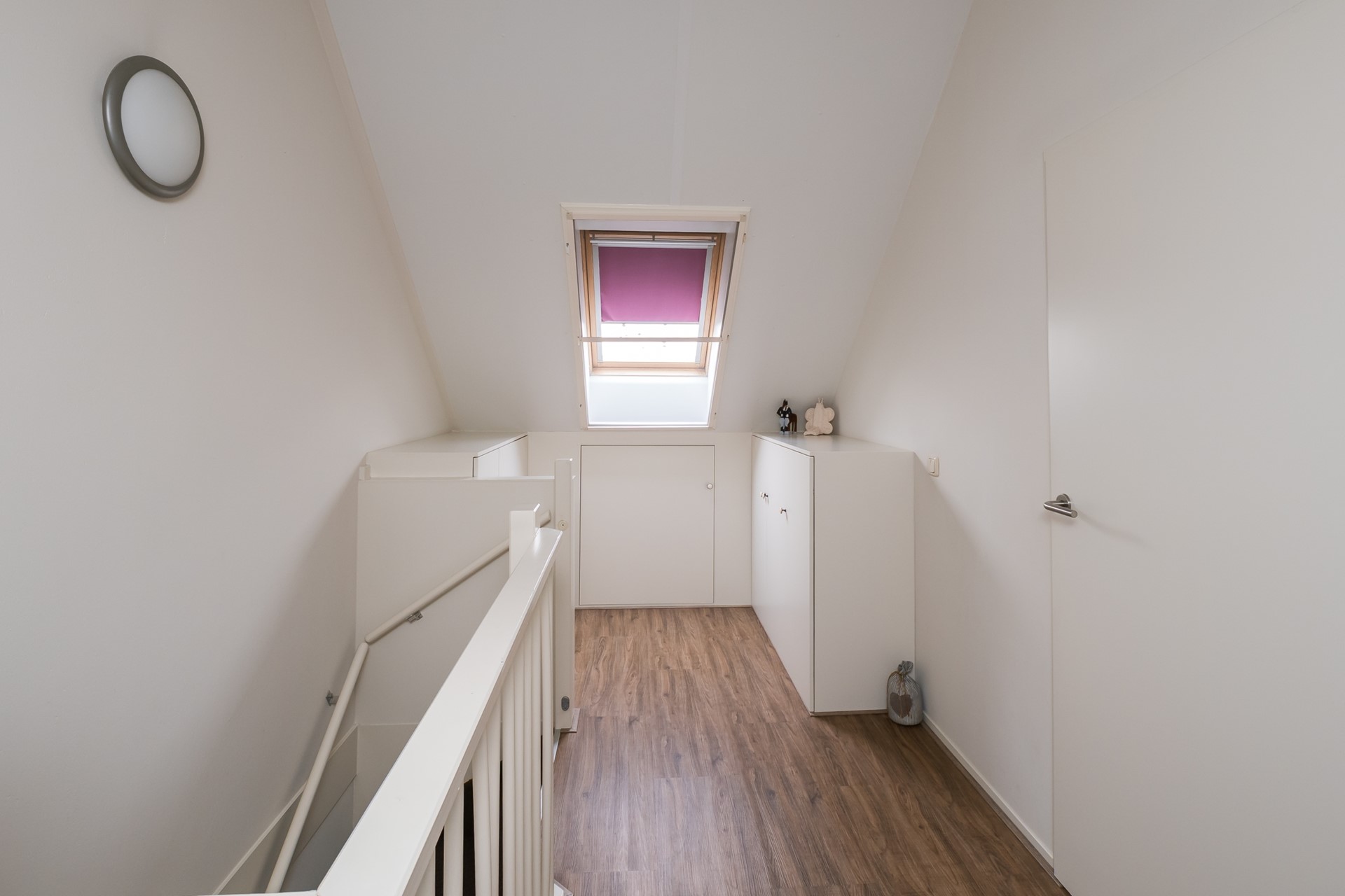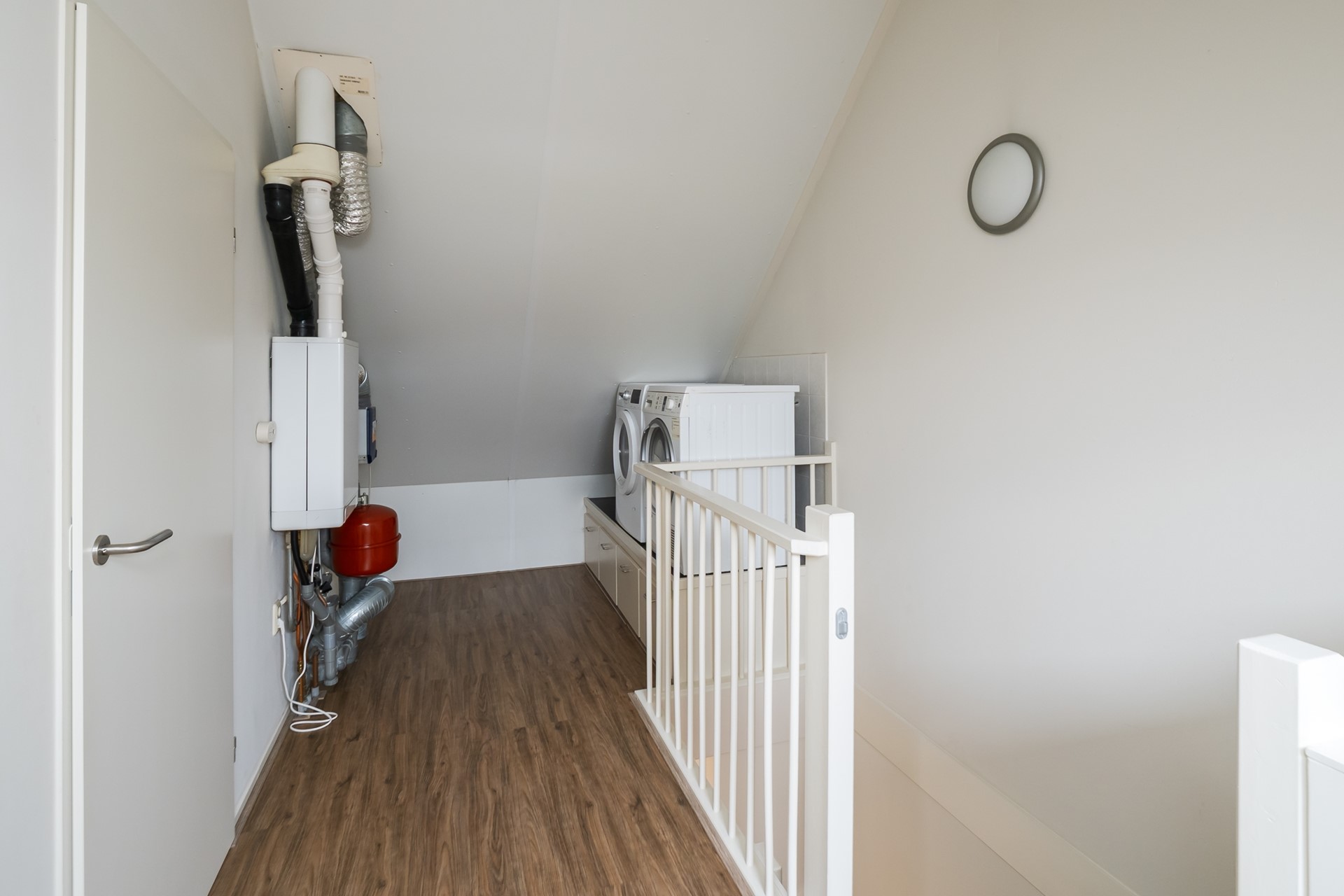 Via een gestoffeerde vaste trap bereik je de volwaardige tweede verdieping. De voorzolder is praktisch ingericht met vaste kasten en een plateau met ladekasten om de wasmachine en droger op werkhoogte te plaatsen. Daarnaast vind je hier de “Intergas” HRE combiketel, de unit van de mechanische ventilatie en achter het knieschot is bergruimte aanwezig. Het Velux-dakvenster zorgt voor daglicht en ventilatie.