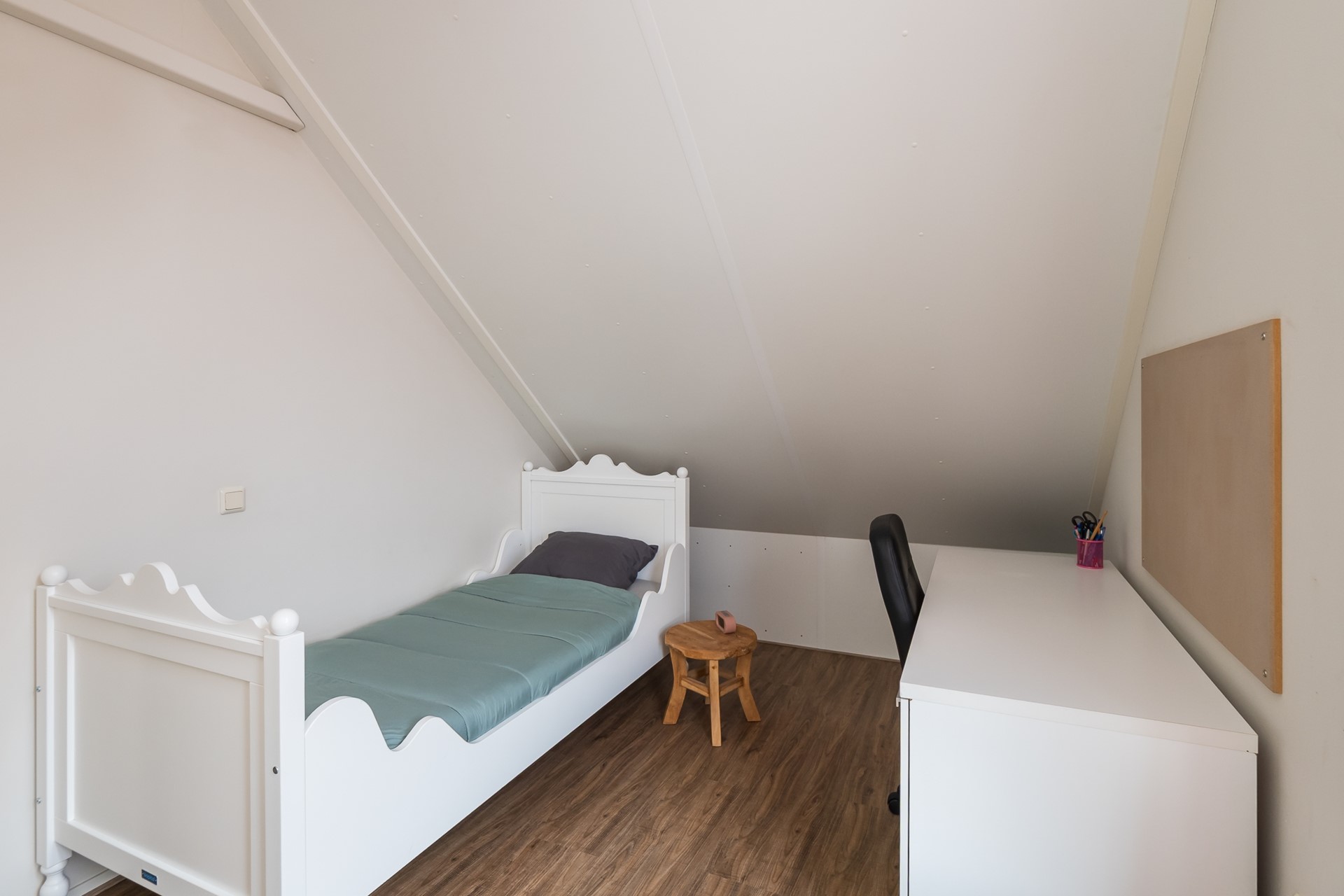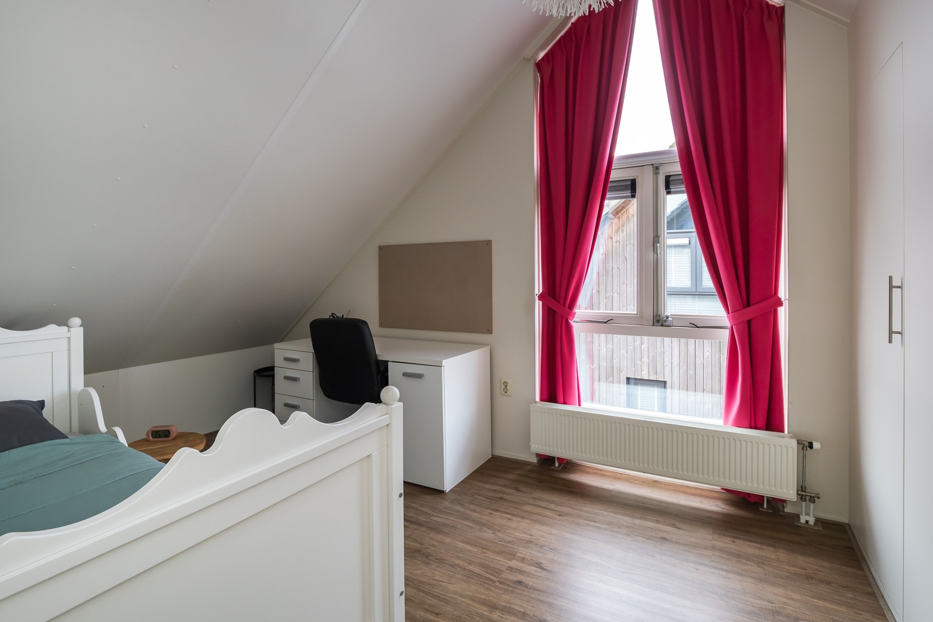 De royale vierde slaapkamer is een échte verrassing. Doordat de ruimte is opengelaten tot in de daknok wordt het ruimtelijke effect nogmaals versterkt. Het fraai vormgegeven raam in de zijgevel geeft de kamer een eigen identiteit en laat het daglicht rijkelijk binnenstromen. De maatwerk gordijnen zijn inclusief. De inloopkast biedt een geweldige opbergruimte en loopt helemaal door tot in de schuinte van de kap. Dankzij de airconditioner is ook hier het binnenklimaat perfect geregeld, ongeacht het seizoen.