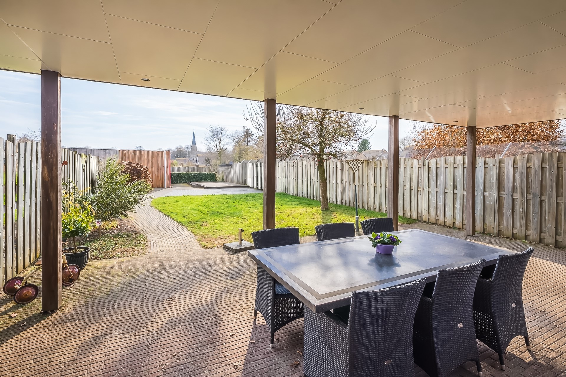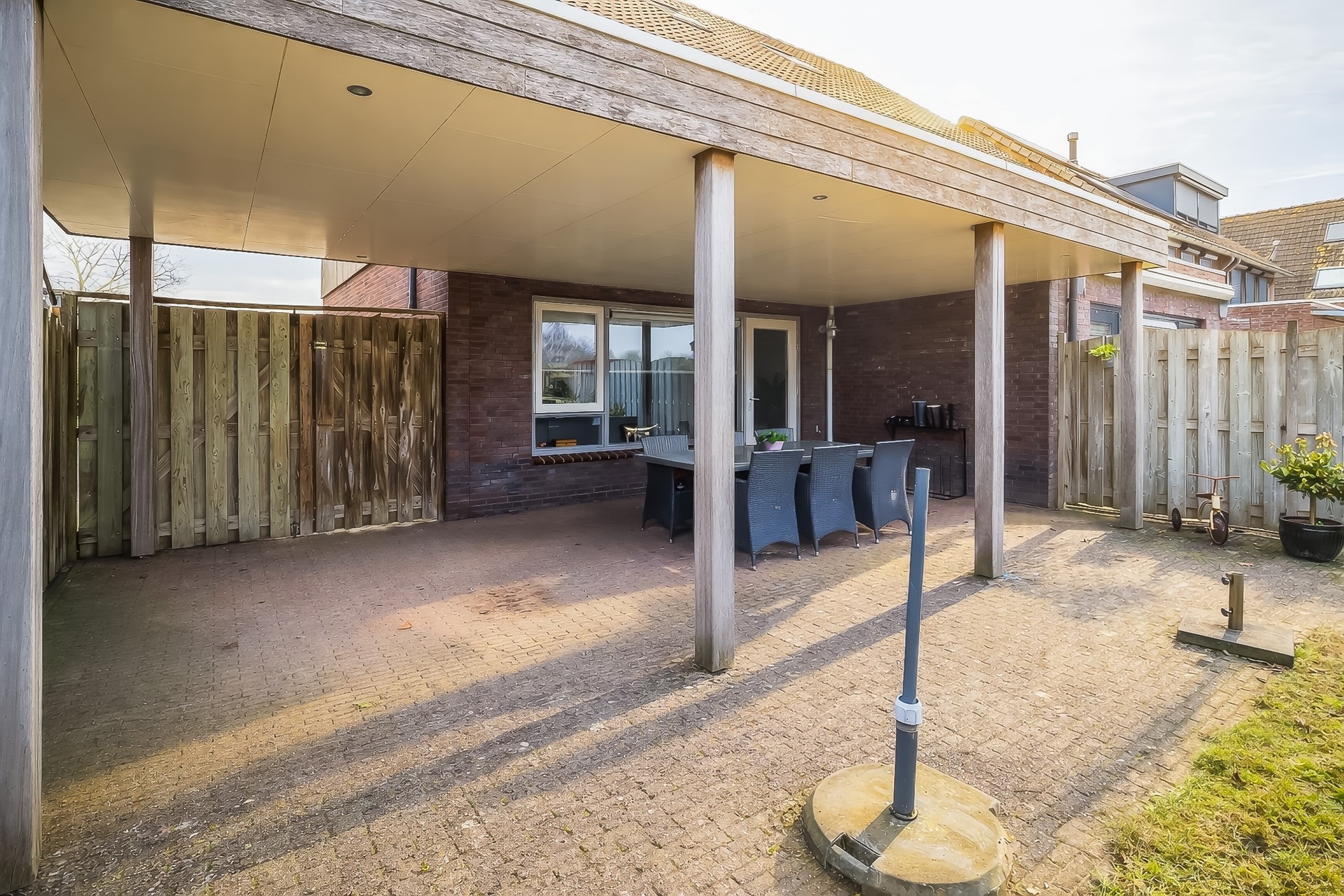 Onder de veranda, die zich uitstrekt over de volle breedte van de tuin, is het op elk moment van de dag prettig verblijven. De inbouwspots in het plafond zorgen ’s avonds voor een warme, sfeervolle setting – ideaal voor lange zomeravonden met een goed glas wijn of een gezellige barbecue.