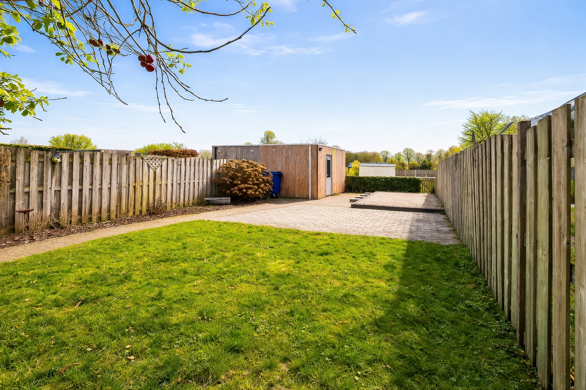 De overige tuin is ingericht met een royaal gazon, een sierappelboom en een langgerekte groenborder. Via het pad van sierbestrating loop je van de veranda naar het terras achterin de tuin, waar je in alle vrijheid kunt genieten. Ook vind je hier een grote houten berging met werkbank, verlichting en elektra: praktisch én multifunctioneel. Privacy is tenslotte gewaarborgd als gevolg van de houten erfafscheiding.