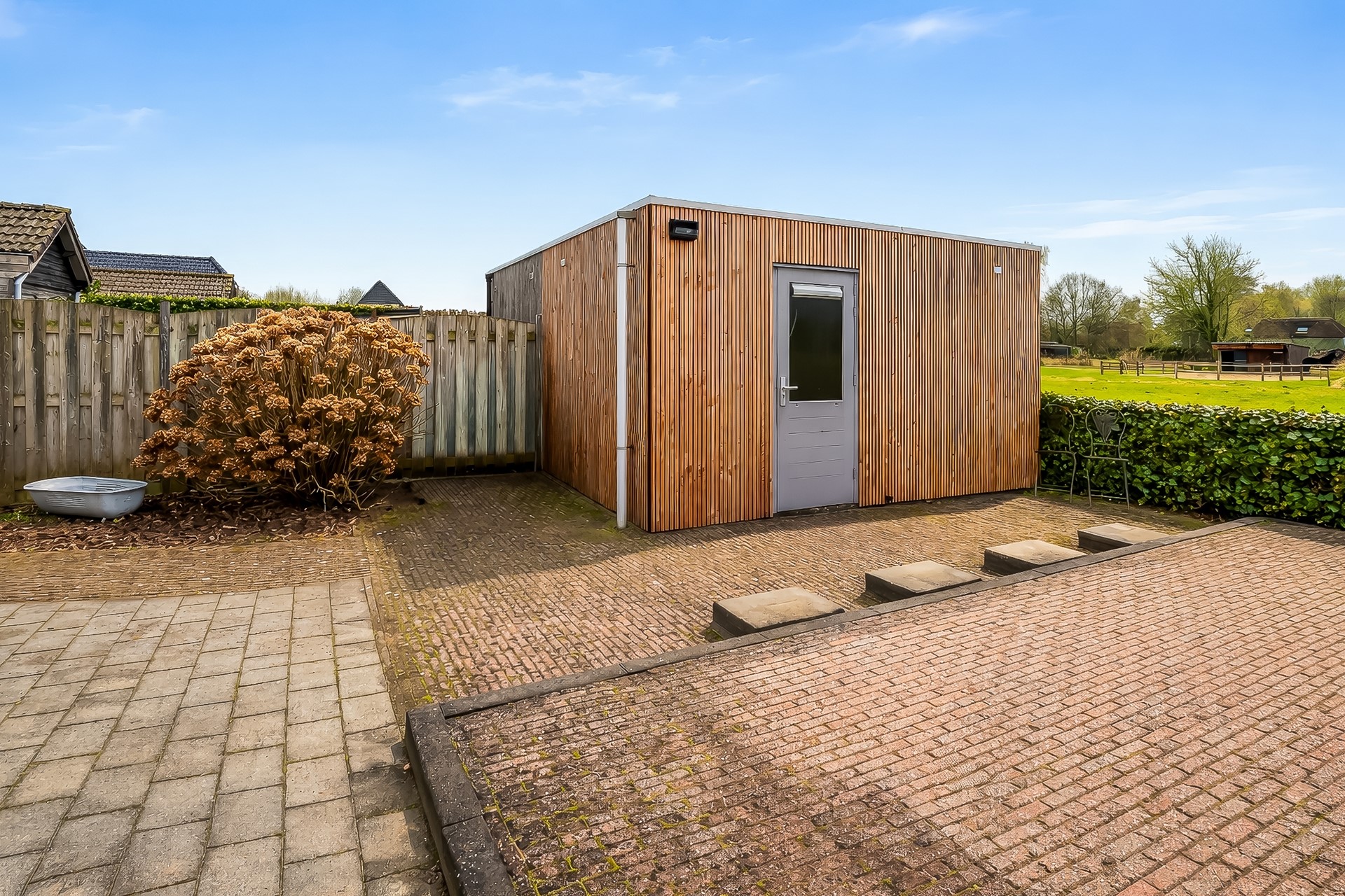 De achtertuin is zo’n plek waar je direct het buitenleven omarmt. Door de uitzonderlijke diepte en de vrije ligging aan open weiland geniet je hier van rust, ruimte en vooral heel veel privacy. En dankzij de zongunstige ligging op het zuidwesten kun je hier optimaal van de zon genieten.