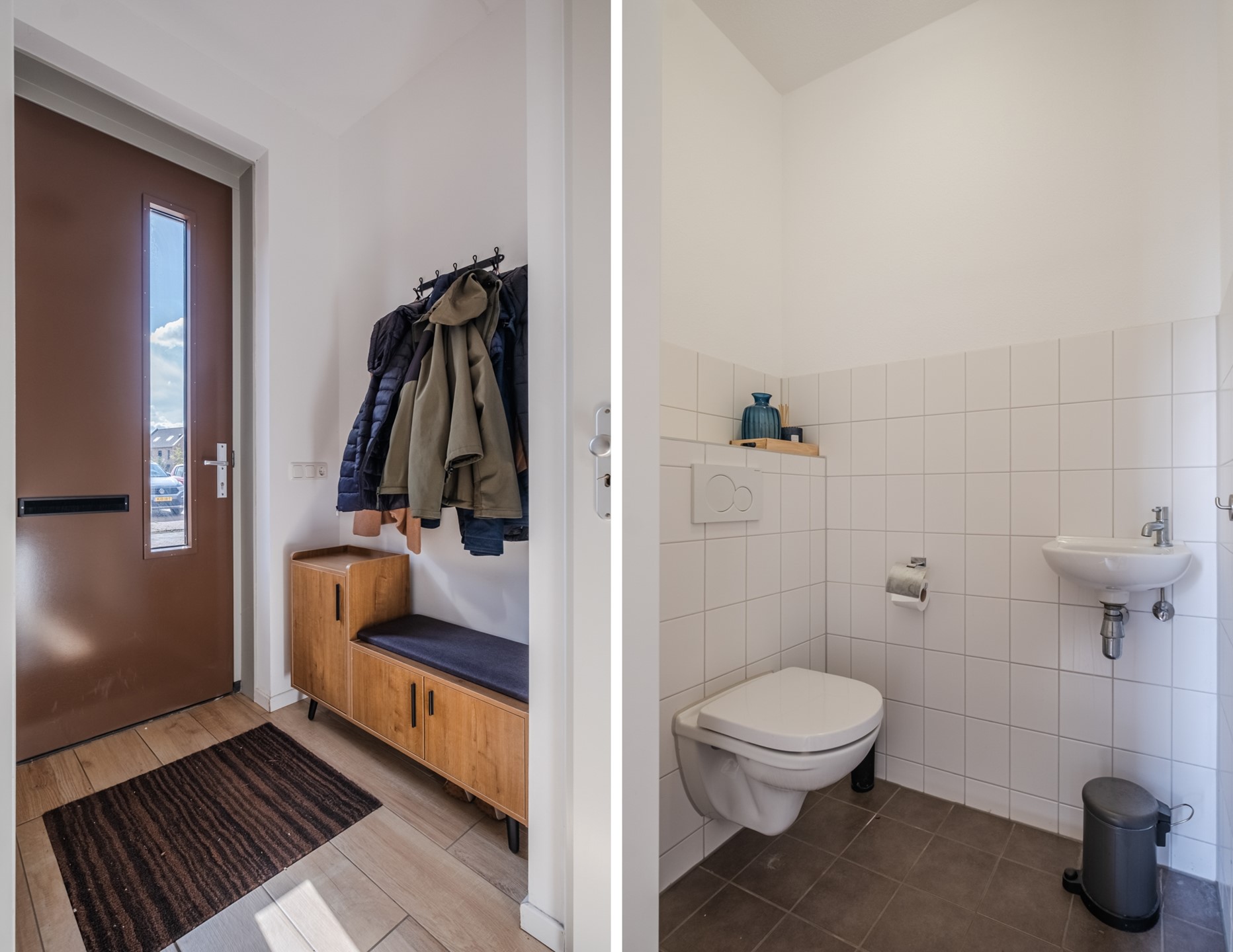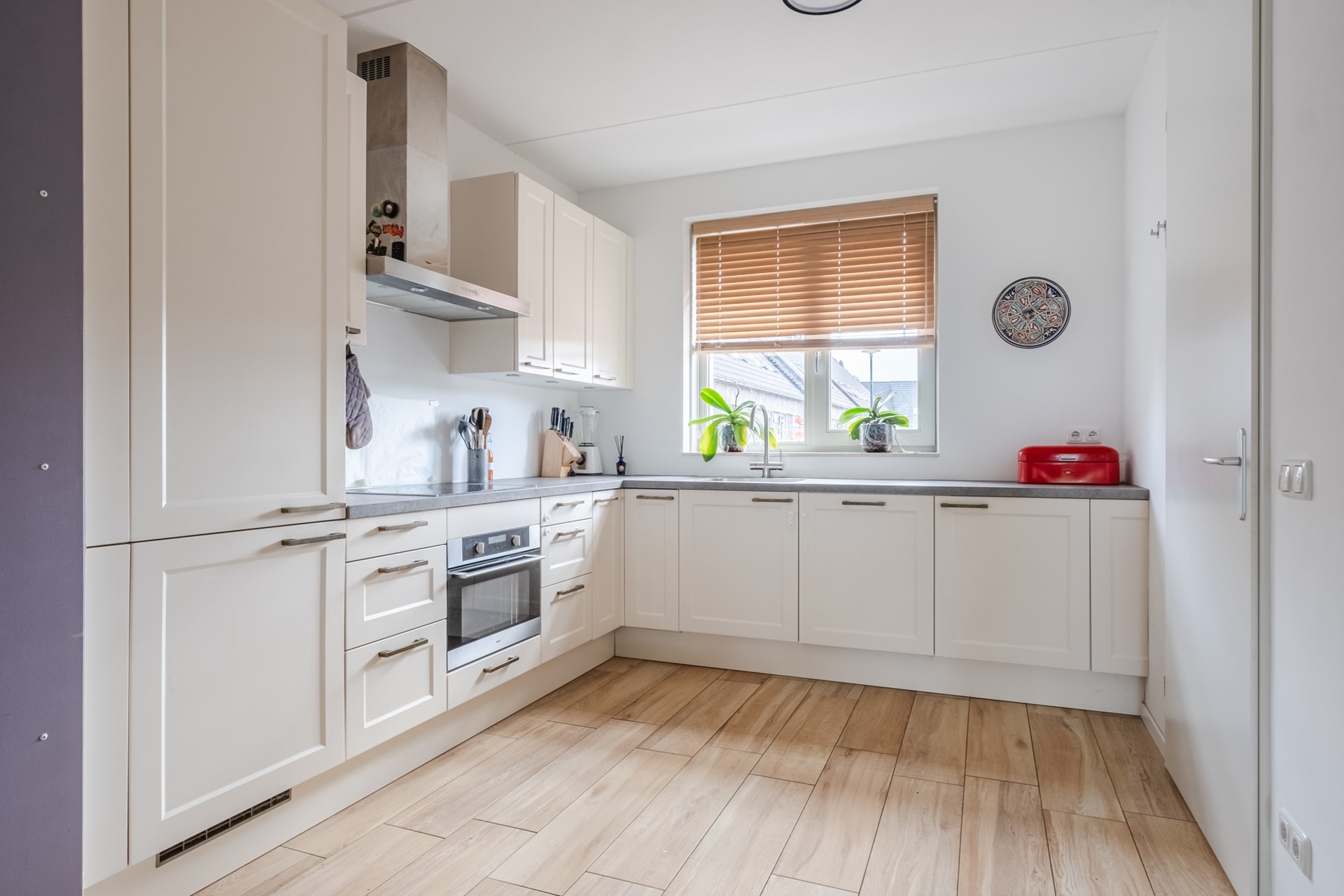 Via de hal/entree betreed je de woning, waar zich de meterkast en een nette toiletruimte bevinden (voorzien van wandcloset en fonteintje). Vanuit de entree kom je in de lichte woonkamer met open keuken. De woonkamer is aan de achterzijde uitgebouwd en is voorzien van een stijlvol tv-meubel met haard, wat zorgt voor een warme en sfeervolle uitstraling. De keuken is uitgerust met diverse inbouwapparatuur en praktisch ingedeeld. Daarnaast is er een trapkast aanwezig die extra bergruimte biedt.