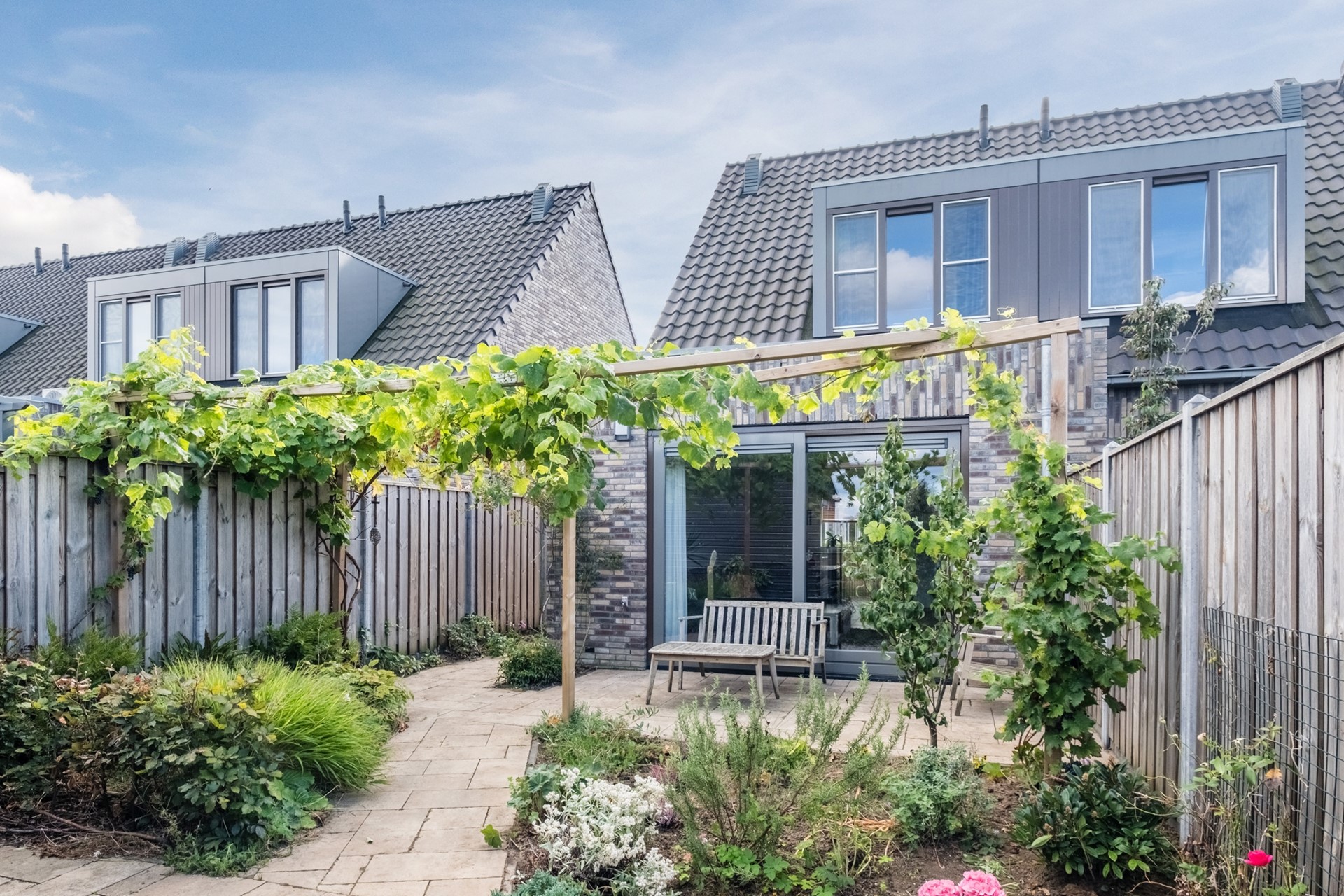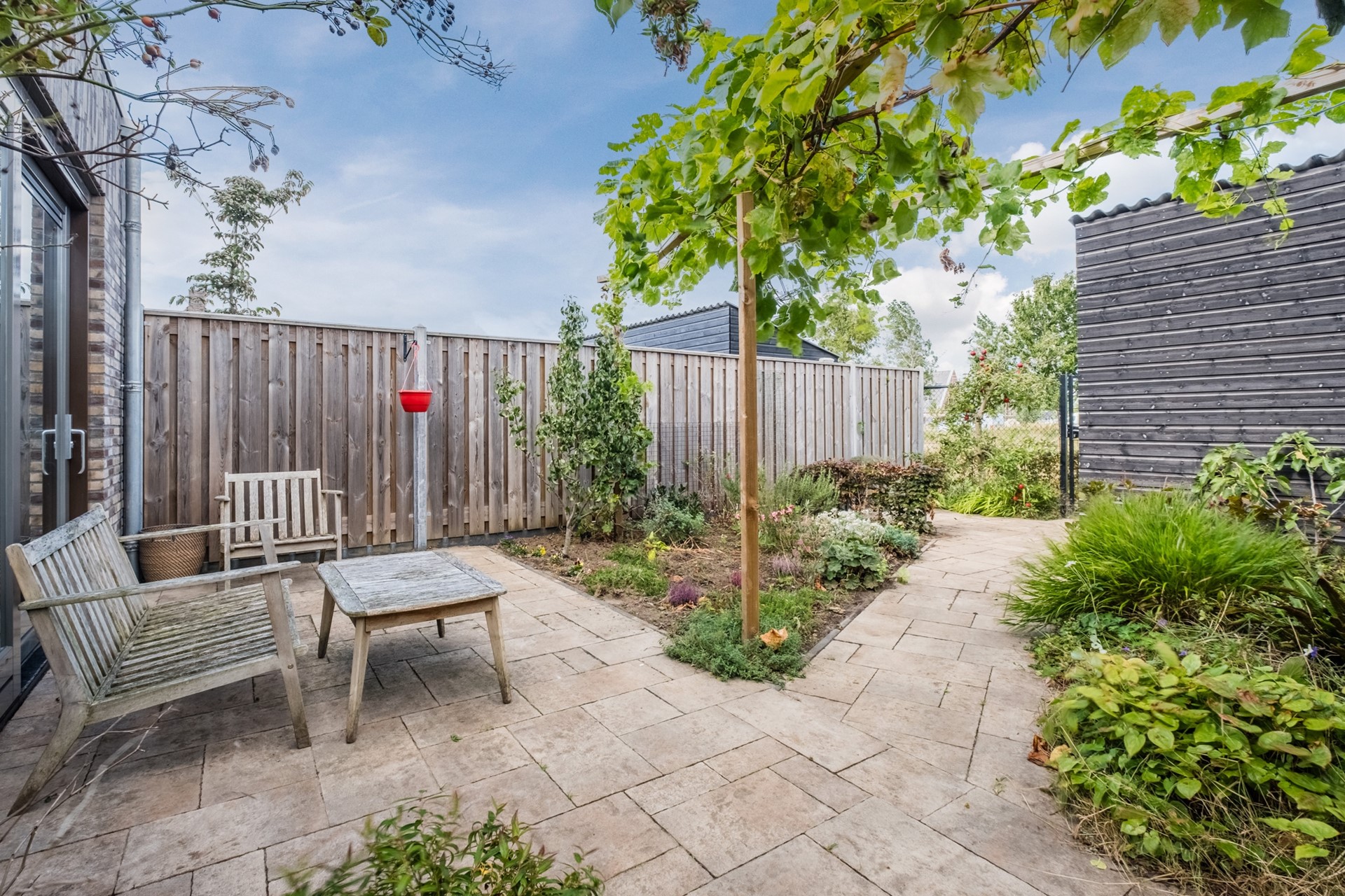 De woning beschikt over een sfeervolle achtertuin met plantenborders en een praktische berging. Hier geniet je van rust en privacy. Vanuit de tuin geniet je van een prachtig vrij uitzicht over de achtergelegen landerijen – een unieke plek waar je elke dag tot rust komt en het buitengevoel optimaal beleeft. Ideaal voor ontspannen momenten, barbecues of speelruimte voor kinderen.
