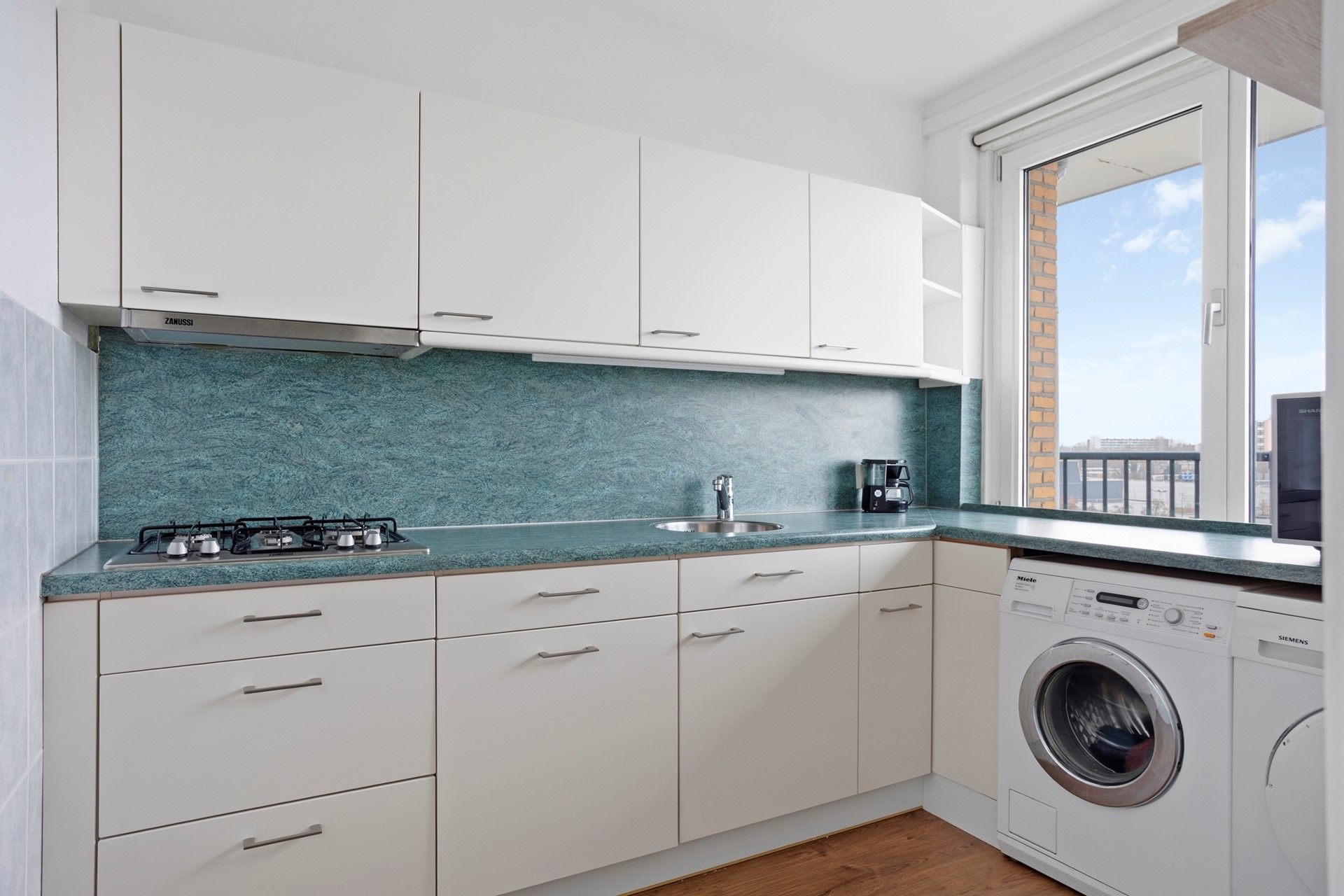 Toegang via afgesloten entree met toegang tot de bergingen en voorzien van brievenbussen en videofoon. Via trap naar de eerste verdieping alwaar de lift en trap toegang bieden tot de zevende verdieping. Het appartement met het spectaculairste uitzicht van het gebouw bevindt zich aan het einde van de galerij waar je ook heerlijk in de ochtend met een kopje koffie of in de avond met een wijntje op een bankje op de galerij kunt genieten van het groene uitzicht. De hal biedt toegang tot alle vertrekken en is voorzien van een meterkast en ruime voorraadkast. De keuken aan de voorzijde is in een L opstelling waardoor er de beschikking is tot veel werkblad. Daarnaast is het voorzien van een 4-pits gaskookplaat en afzuigkap en mogelijkheid voor het plaatsen van een wasmachine en droger of vaatwasser.