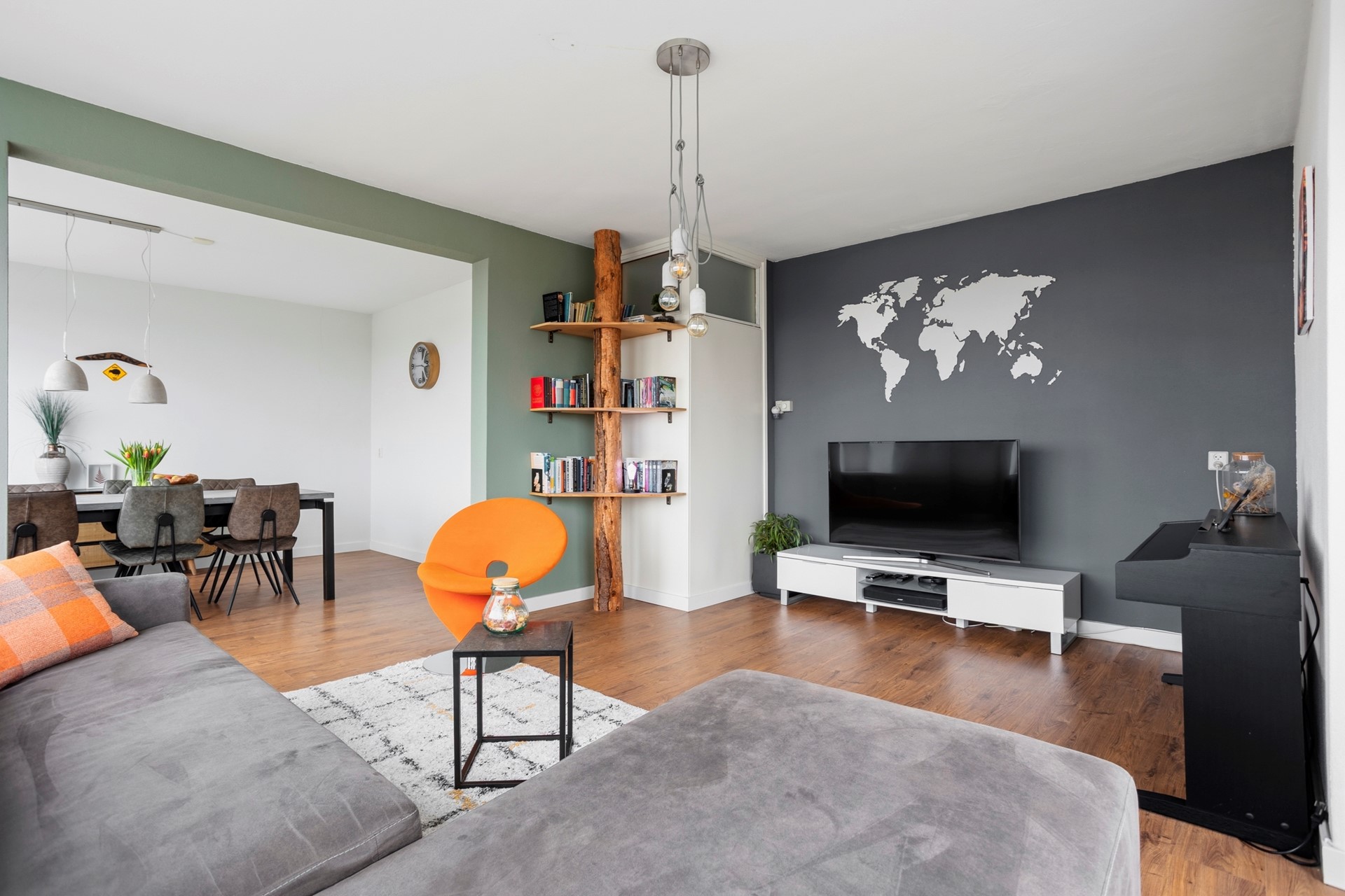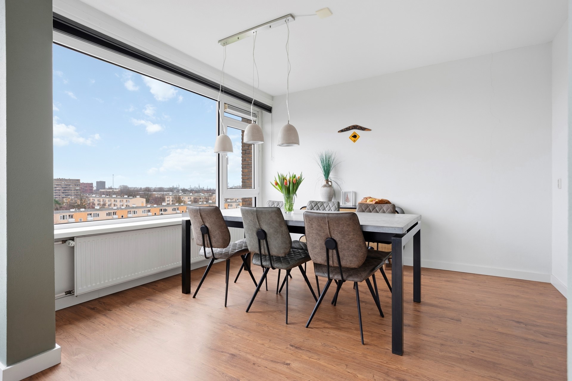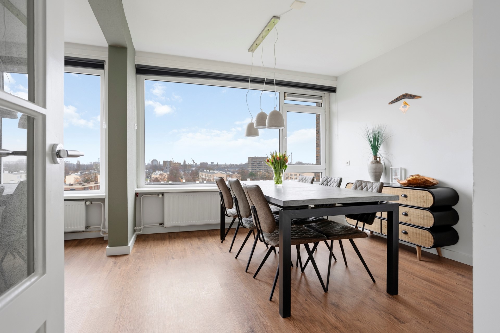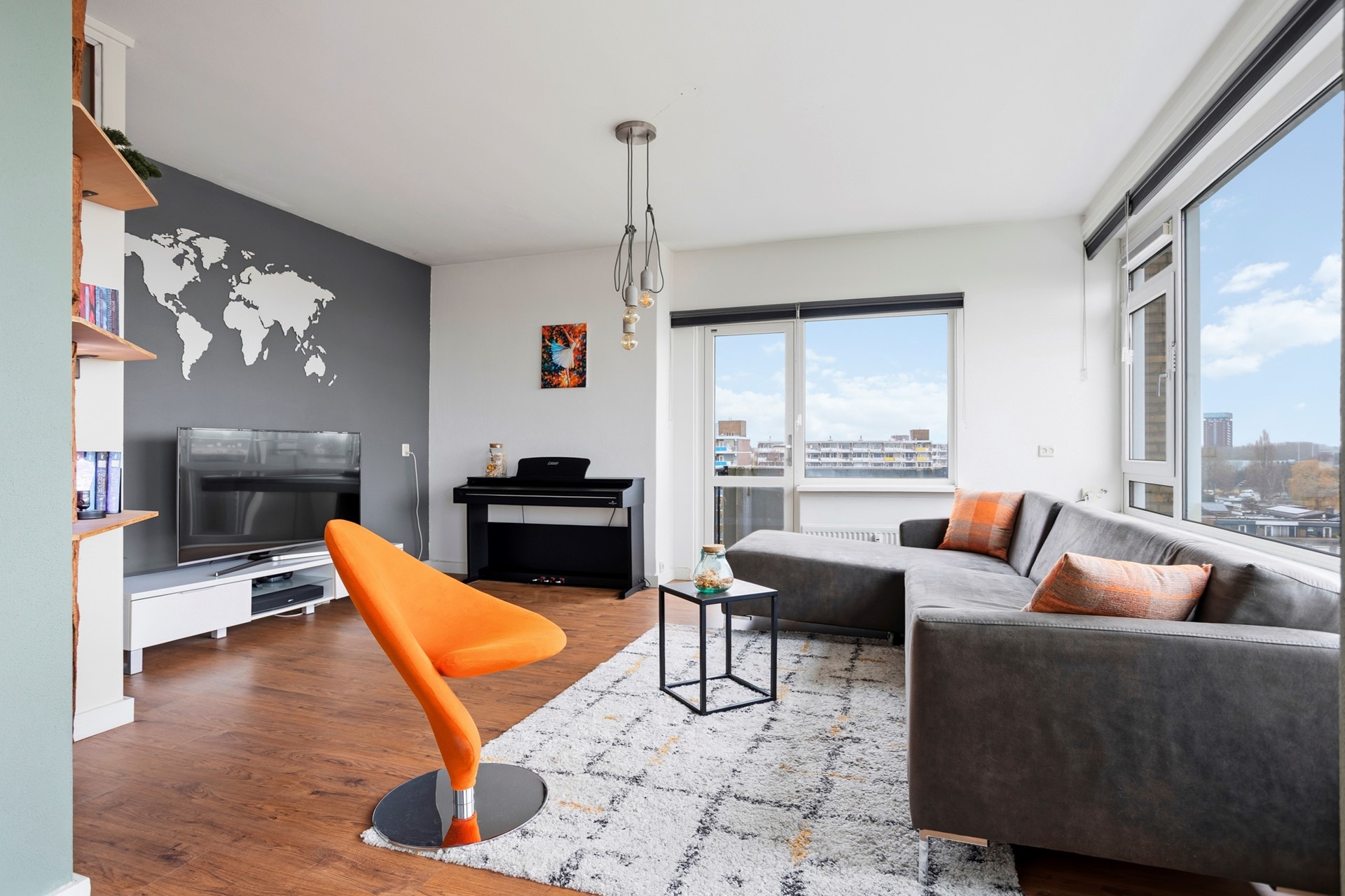 De riante en lichte woonkamer is door de hoekligging gericht op het zuidoosten en voorzien van grote ramen en een klein balkon op het oosten. Door de opengebroken muur tussen de woonkamer en 2e slaapkamer is een ruime woon-/eetkamer ontstaan. Aan de voorzijde bevindt zich een ruime slaapkamer van ca. 13 m2. De badkamer is recent gemoderniseerd en voorzien van een robuust wastafelmeubel, douche met sunshower en boiler opstelling. Naast de badkamer bevindt zich het separate moderne toilet.