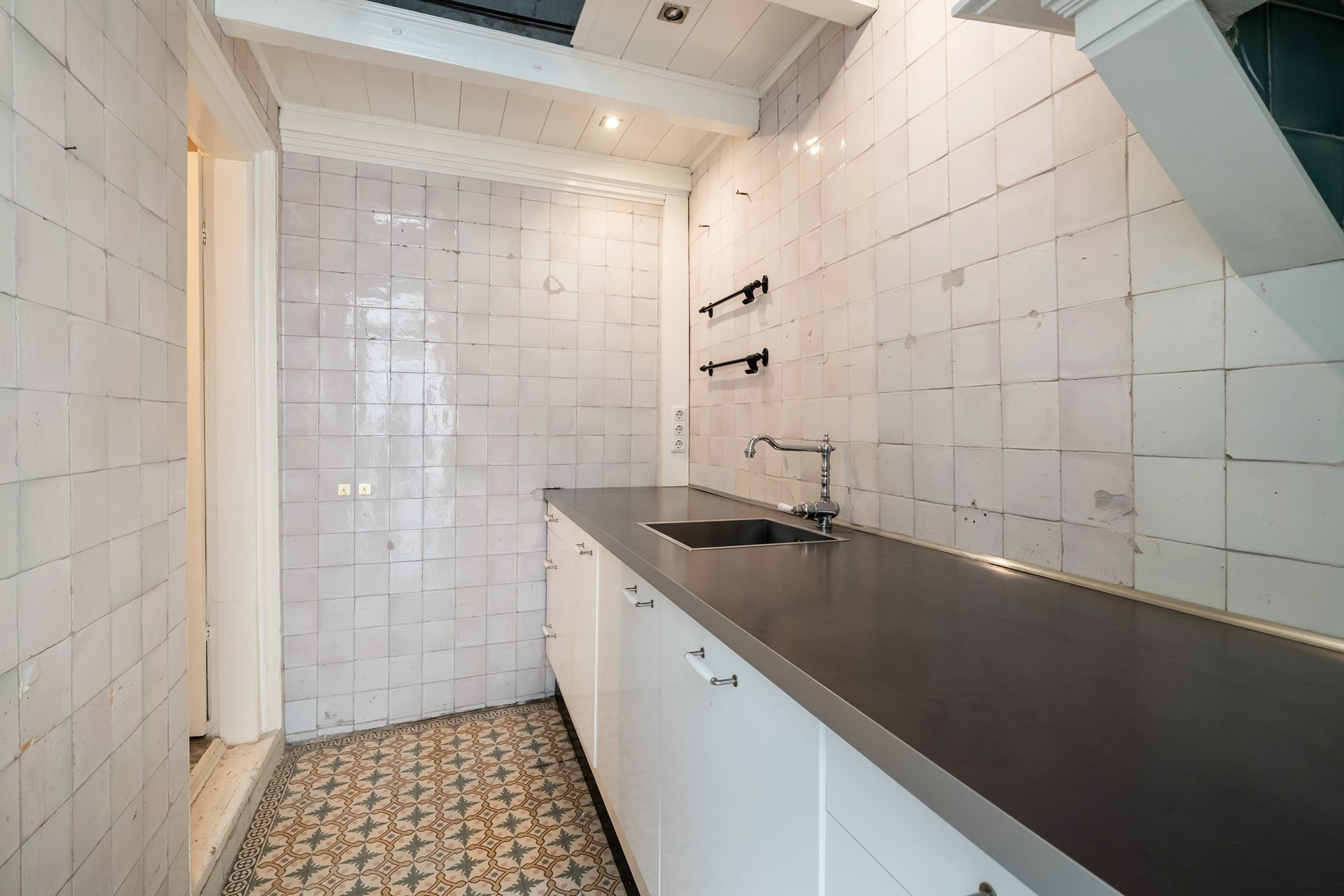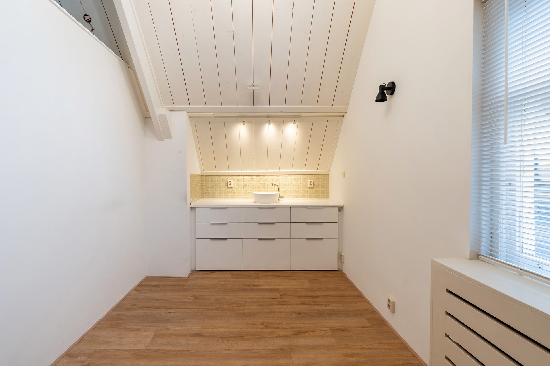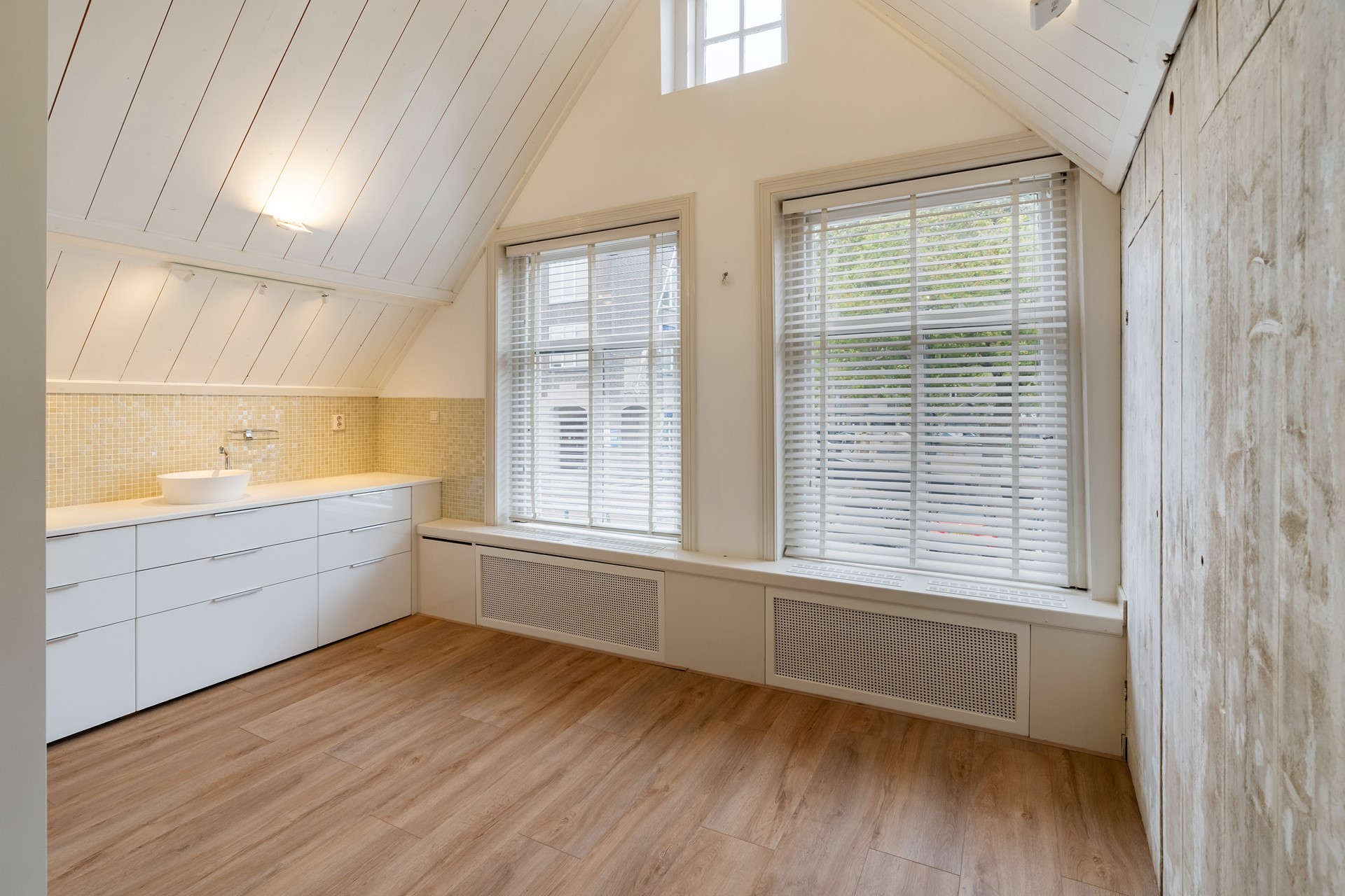 De eigentijdse keuken sluit naadloos aan bij het nostalgische karakter van dit pand. Door de aanwezigheid van een ingebouwde koelkast, vaatwasser en een close-in boiler, kan je zelf beslissen of je een gaskookplaat of inductie wil toevoegen aan de keuken.