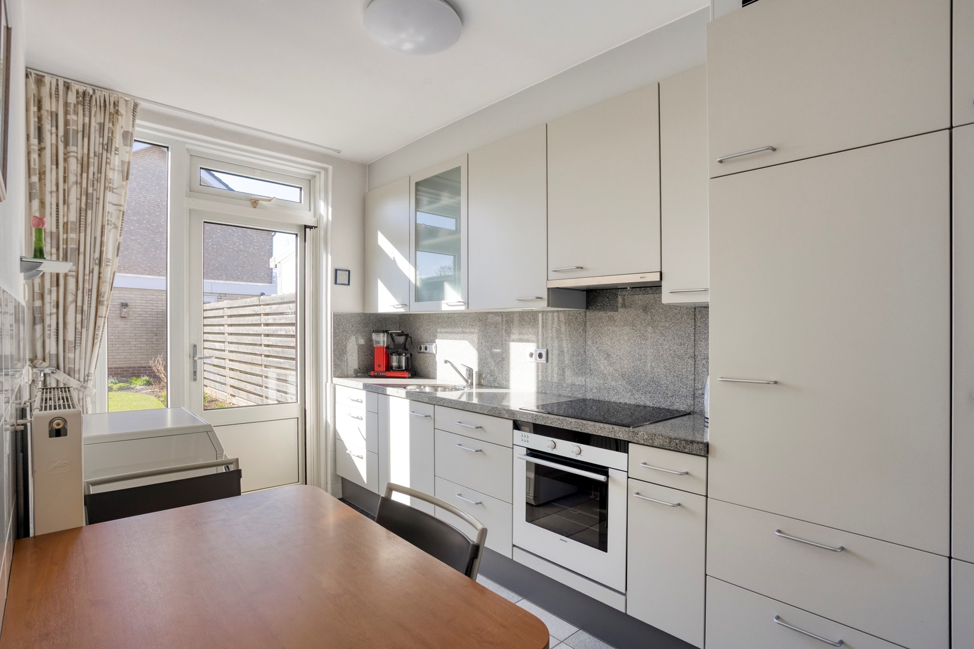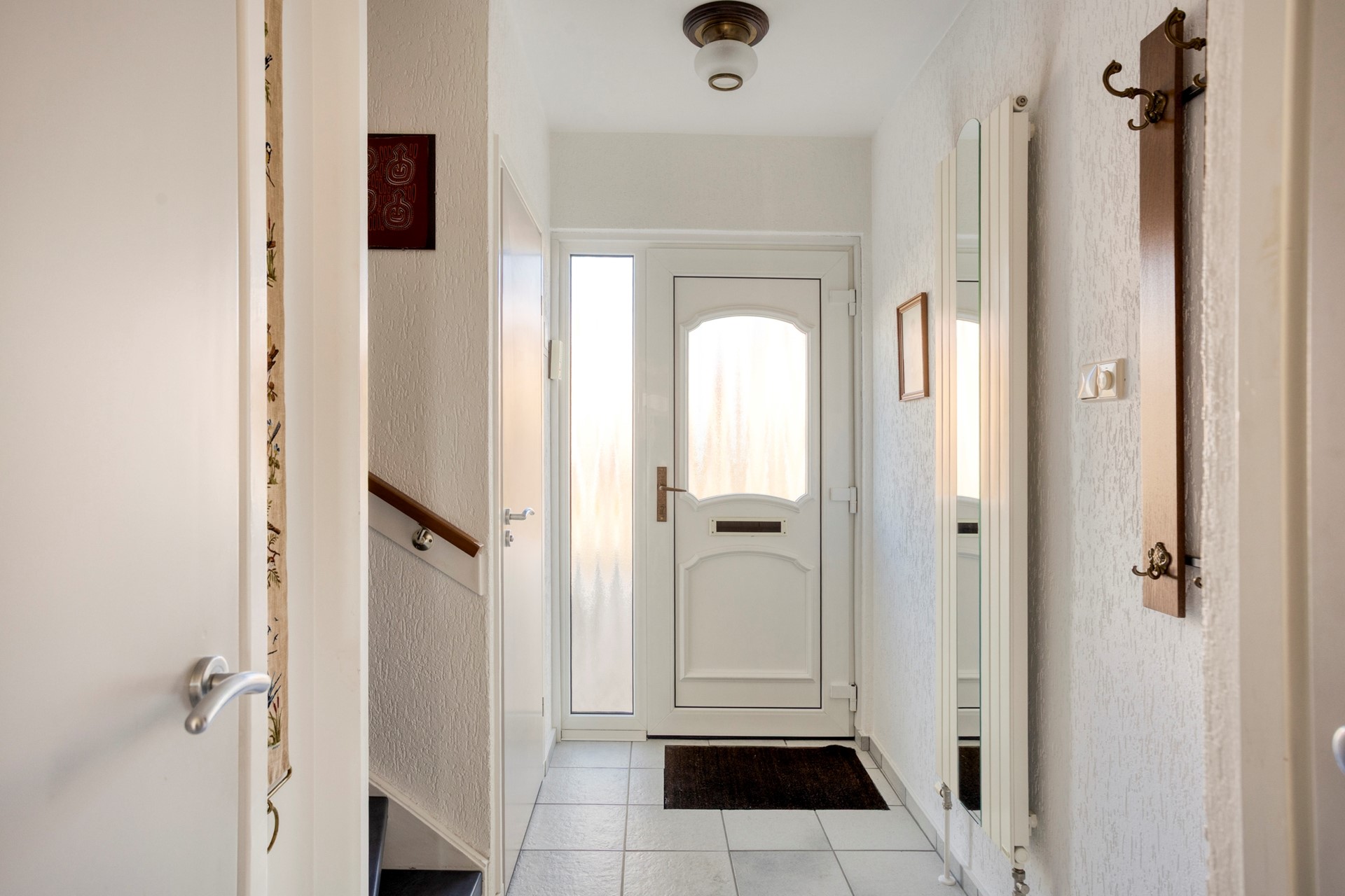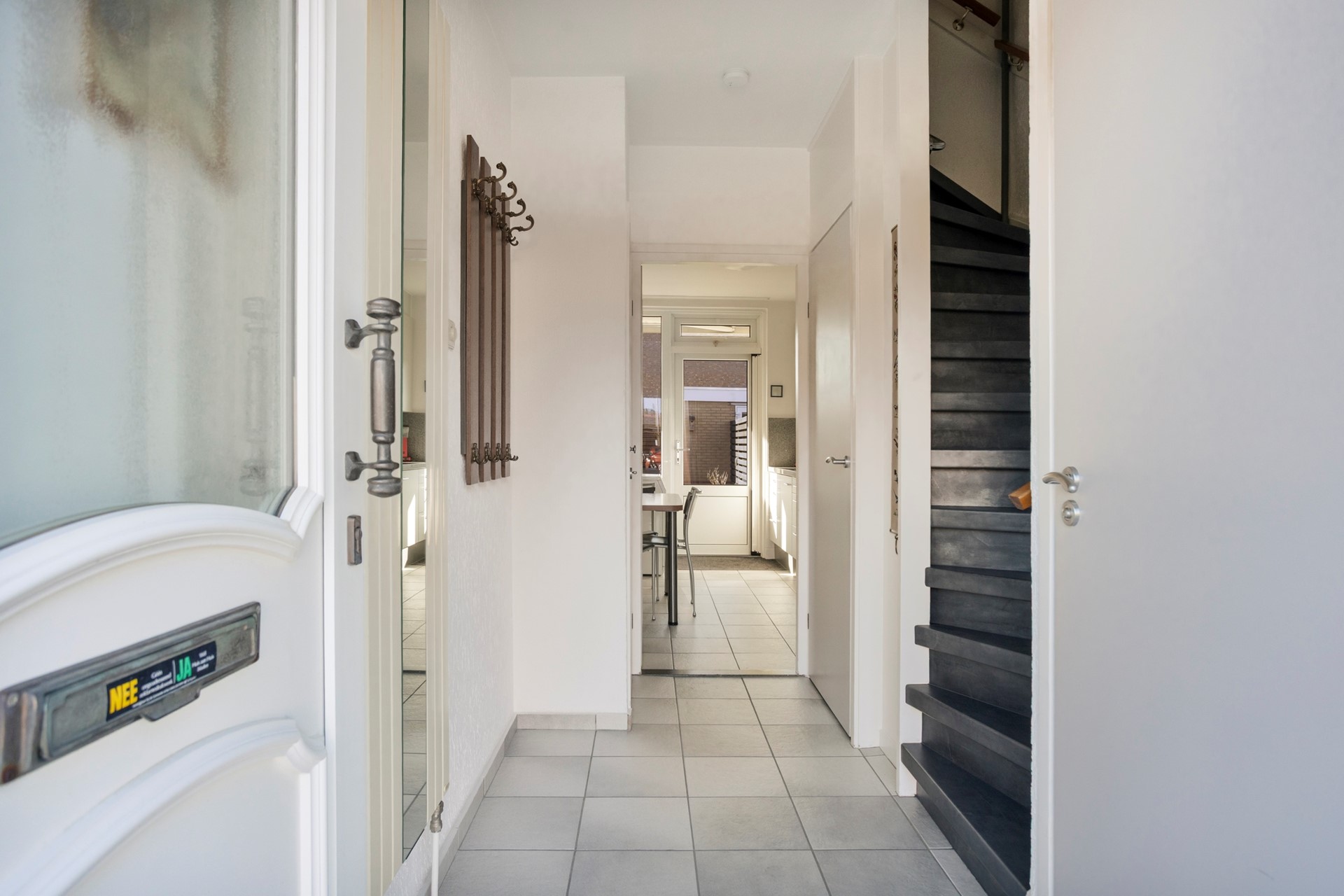 De entree geeft toegang tot de voordeur en de hal. Vanuit de hal met tegelvloer, meterkast, bergkast en trap naar de 1e verdieping zijn het toilet en de keuken bereikbaar. De toiletruimte is voorzien van een wandcloset met fonteintje. De keuken met tegelvloer is voorzien van een keurige keukenopstelling met apparatuur (keramische kookplaat, afzuigkap, oven, koelkast), voldoende werk- en kastruimte, witgoedaansluiting en een tuindeur naar het terras. De doorzon woonkamer is ruim van opzet en is voorzien van een parketvloer en een tuindeur naar het terras.